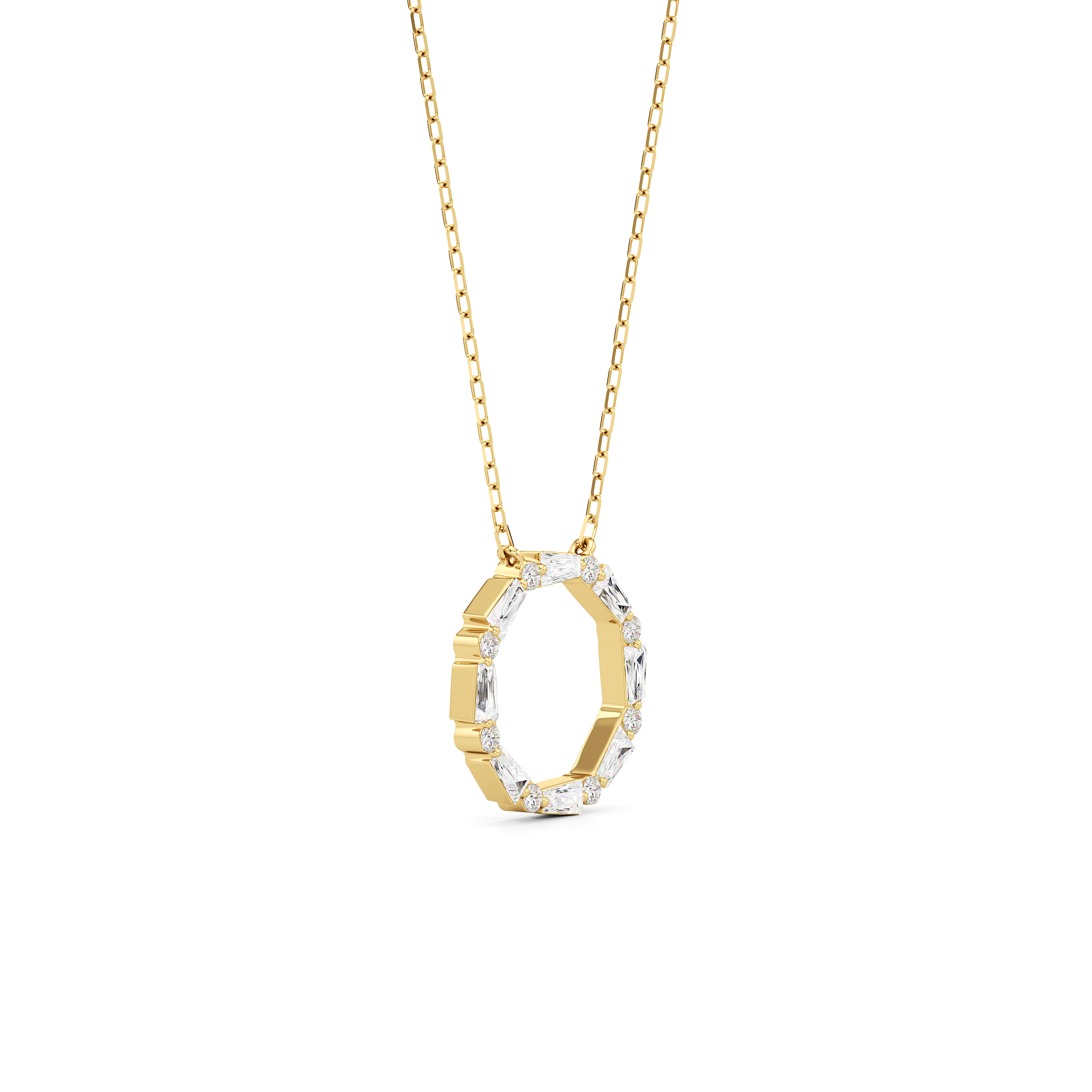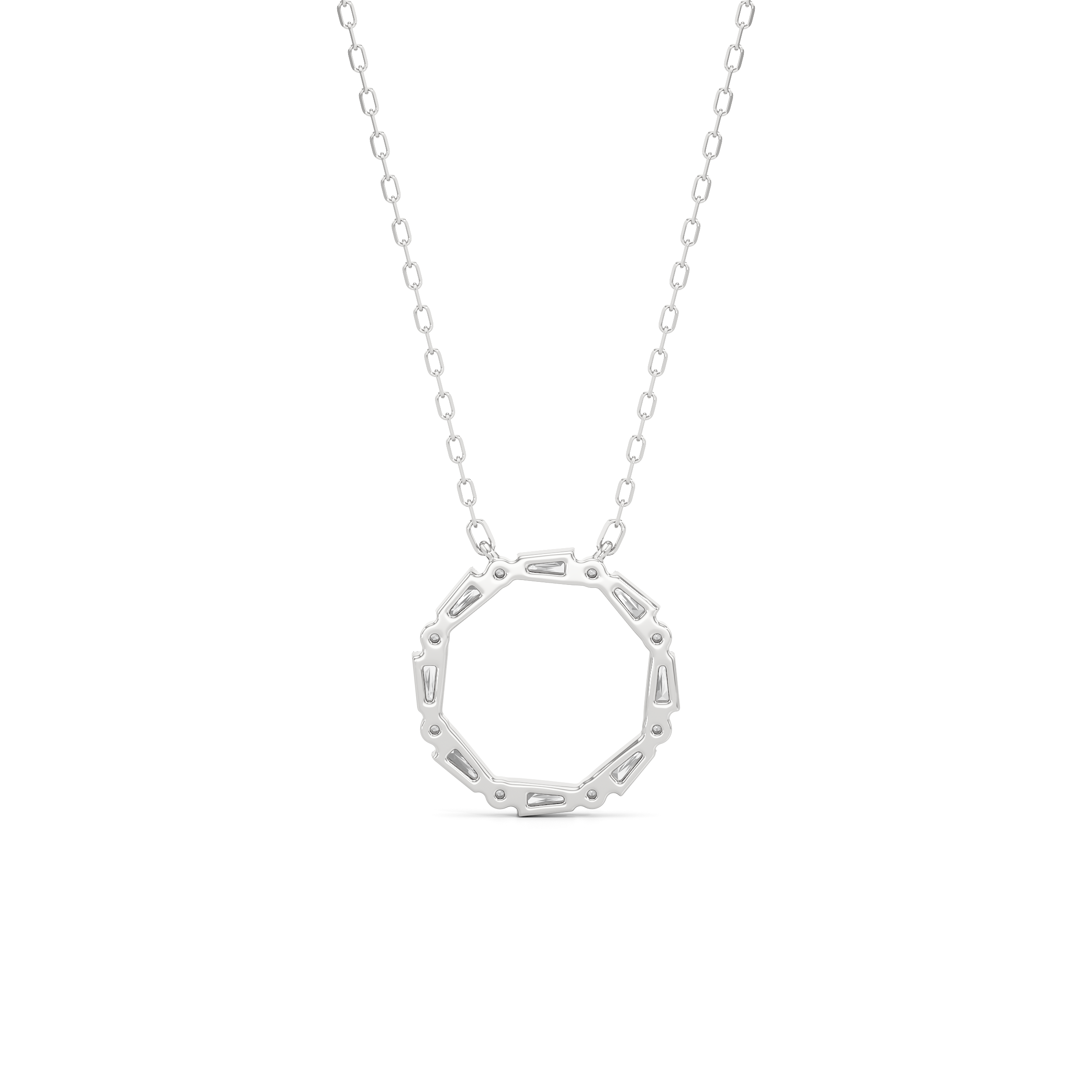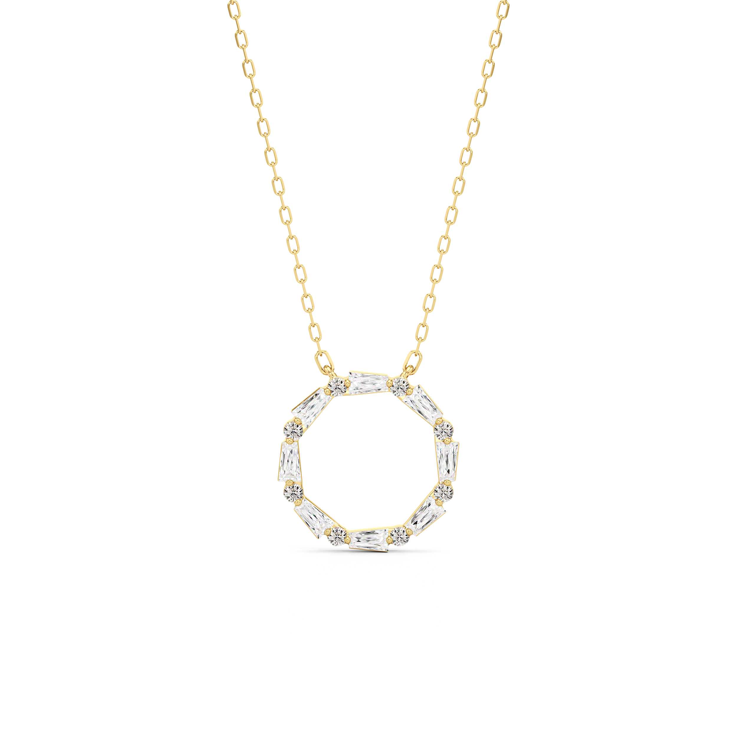 Contrast and dimension join the circle, giving this necklace its crisp, geometric elegance. Round diamonds and tapered baguette diamonds are alternately set on a round frame. This jewel can be paired with just about everything in your wardrobe.