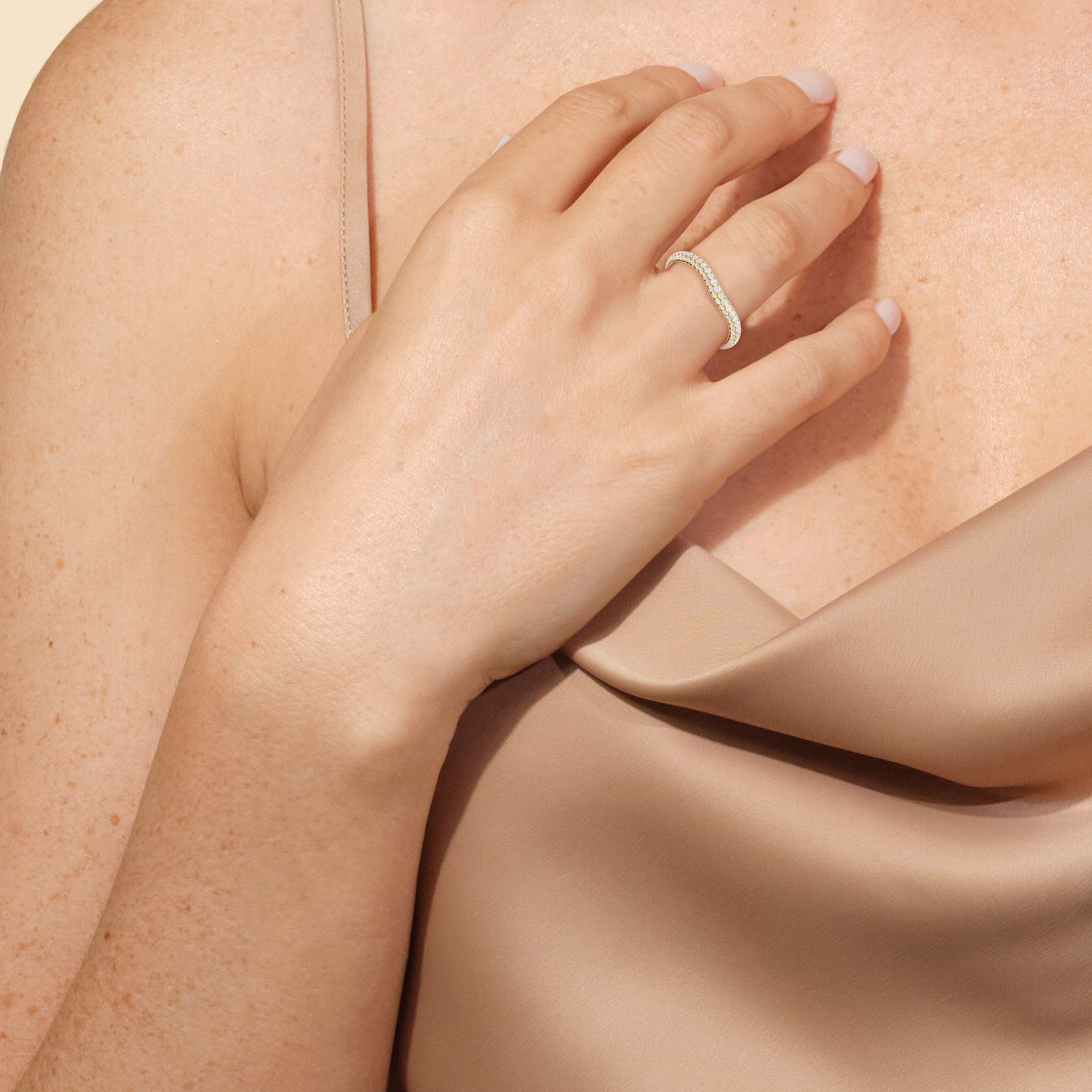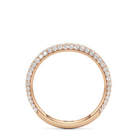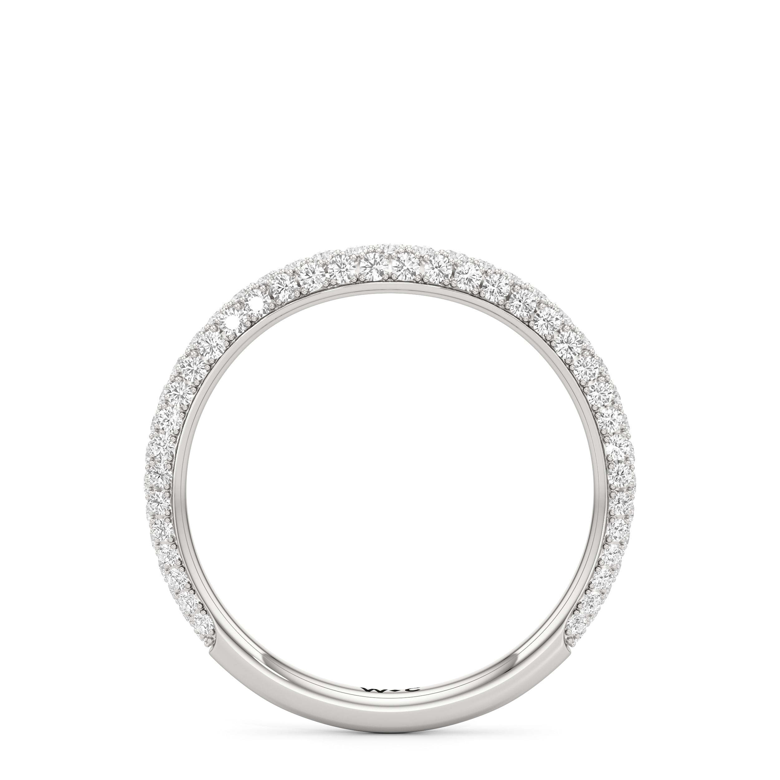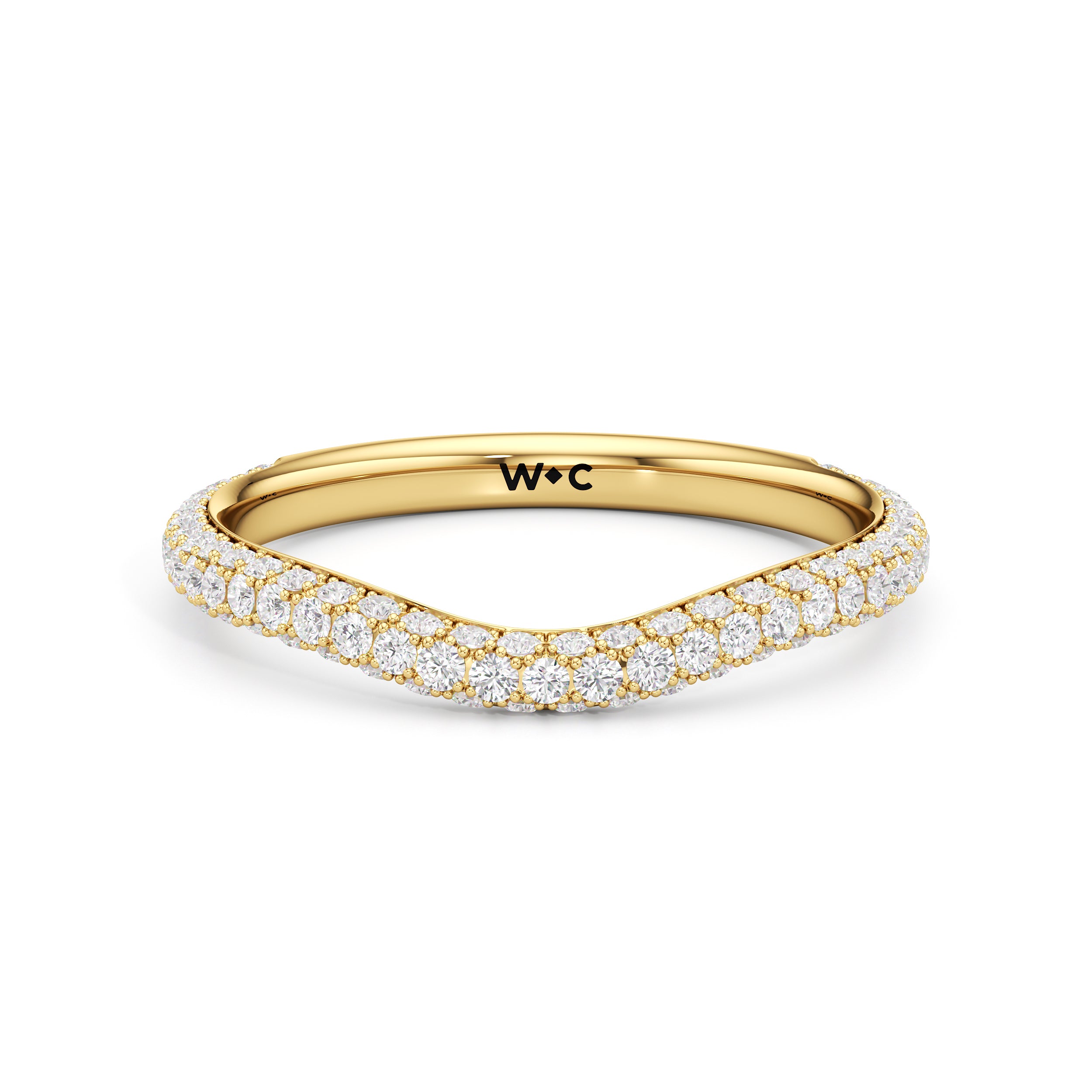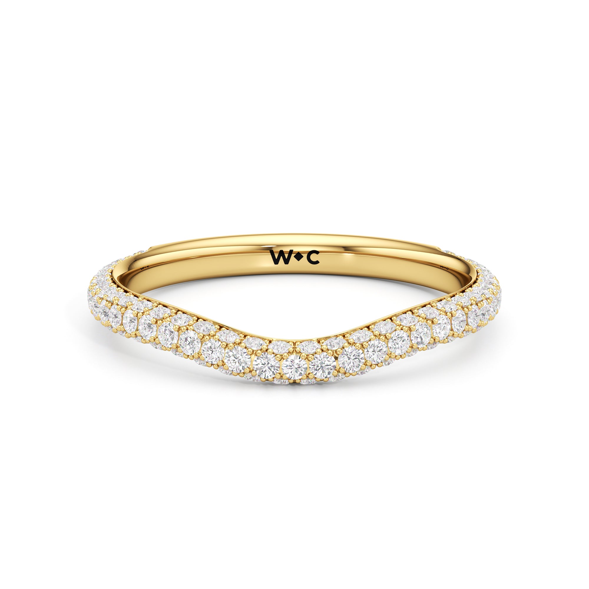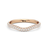 This curved diamond set wedding band is perfectly contoured to complement our The Frankie Three Stone Diamond Wedding Band for a simple and sophisticated look.