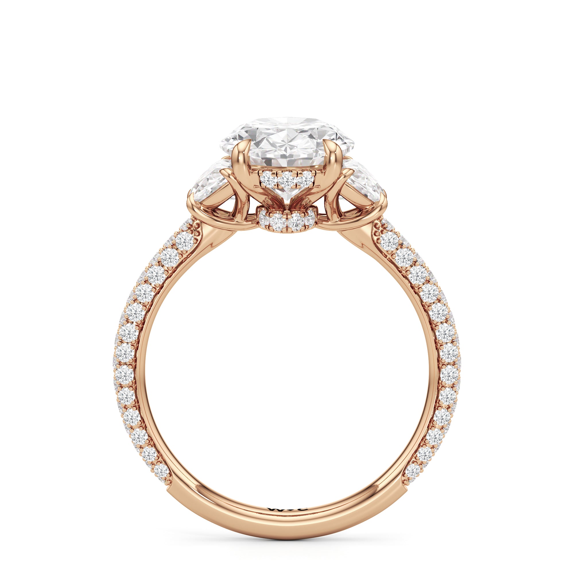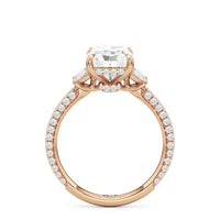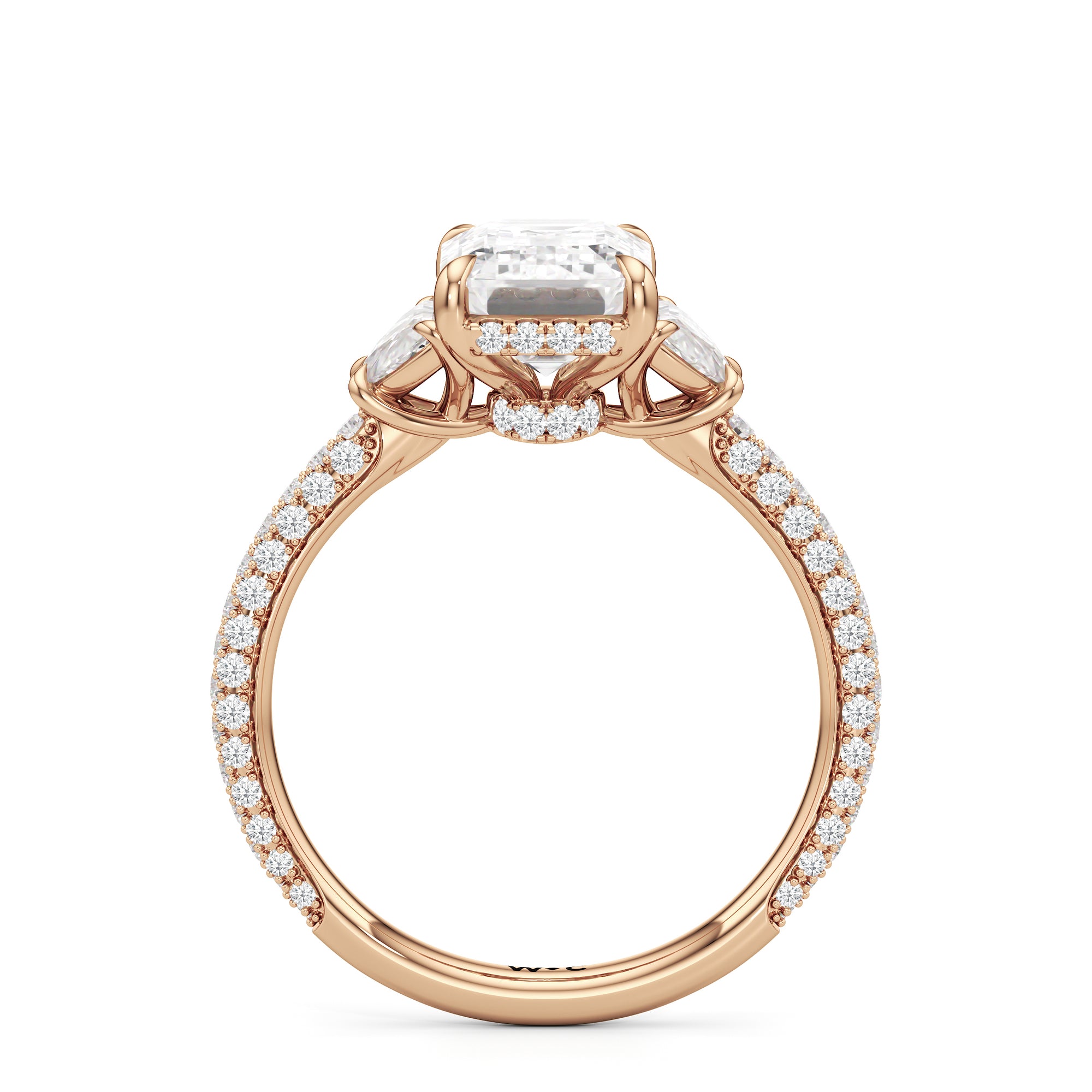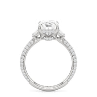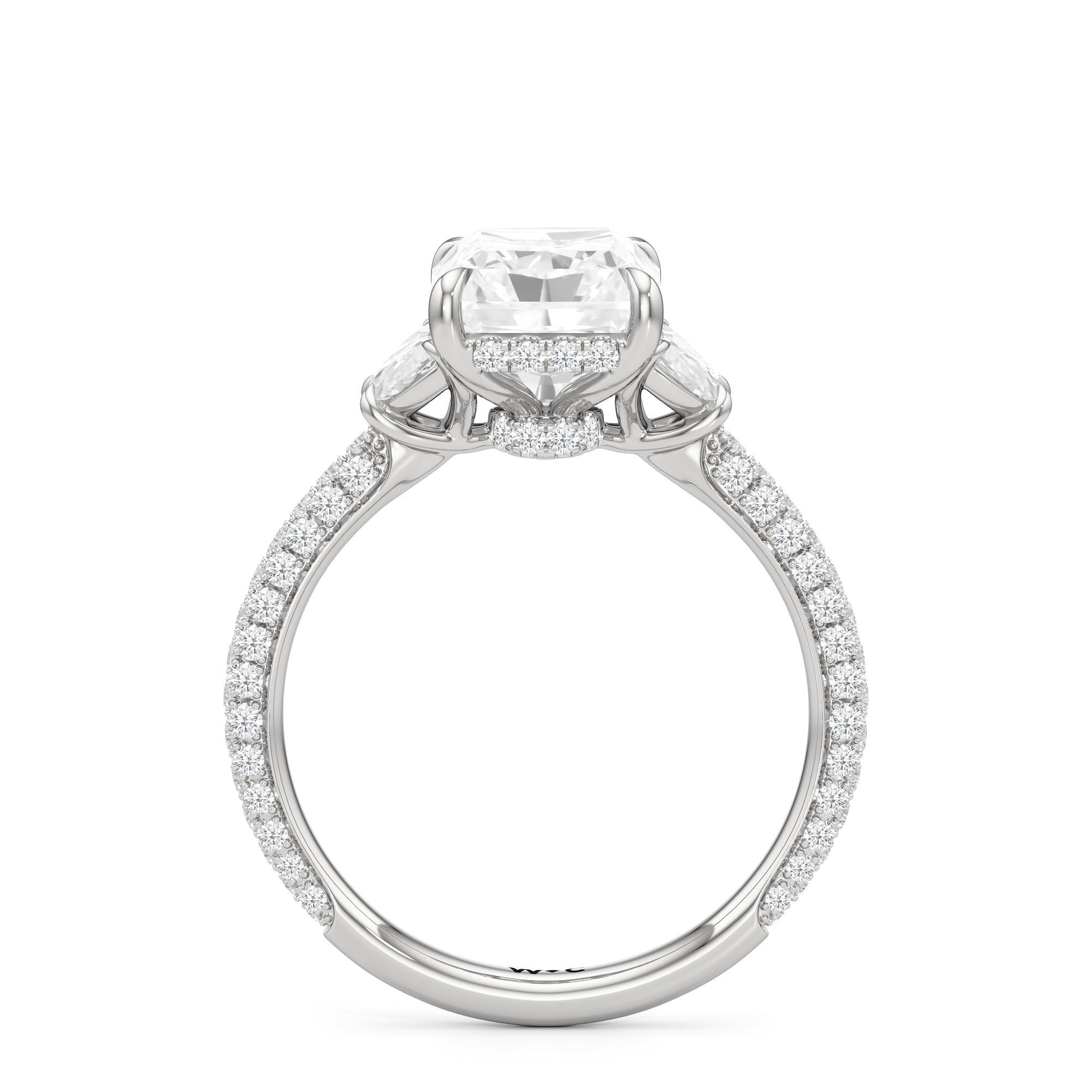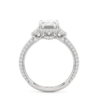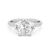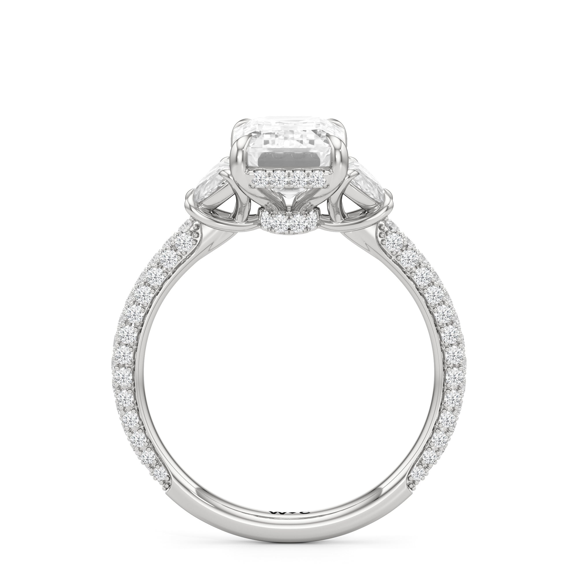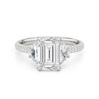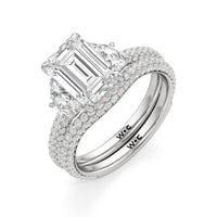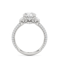 Contemporary classicism defines the style of this ring. The focal diamond sits in between two half-moon-shaped diamond side stones. A diamond-studded rail and a hidden halo accentuate the central stone. On the other hand, the two side stones are held by claw prongs that intertwine, extend, and form the ring's bridge. The diamond trio centerpiece rests on a band that is almost fully covered with petite round diamonds.
