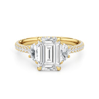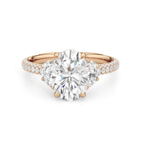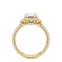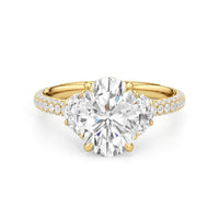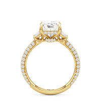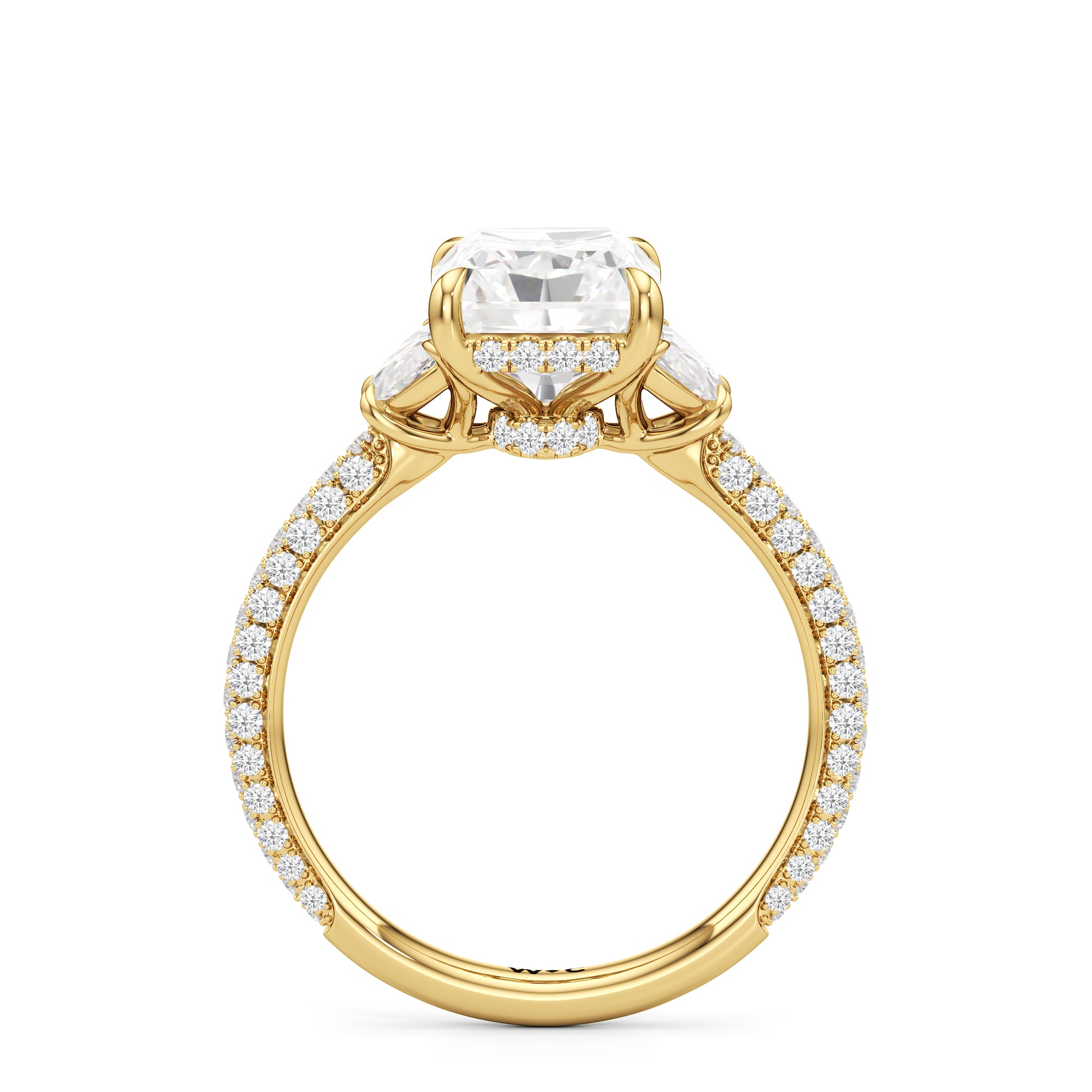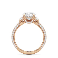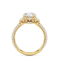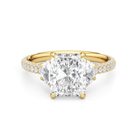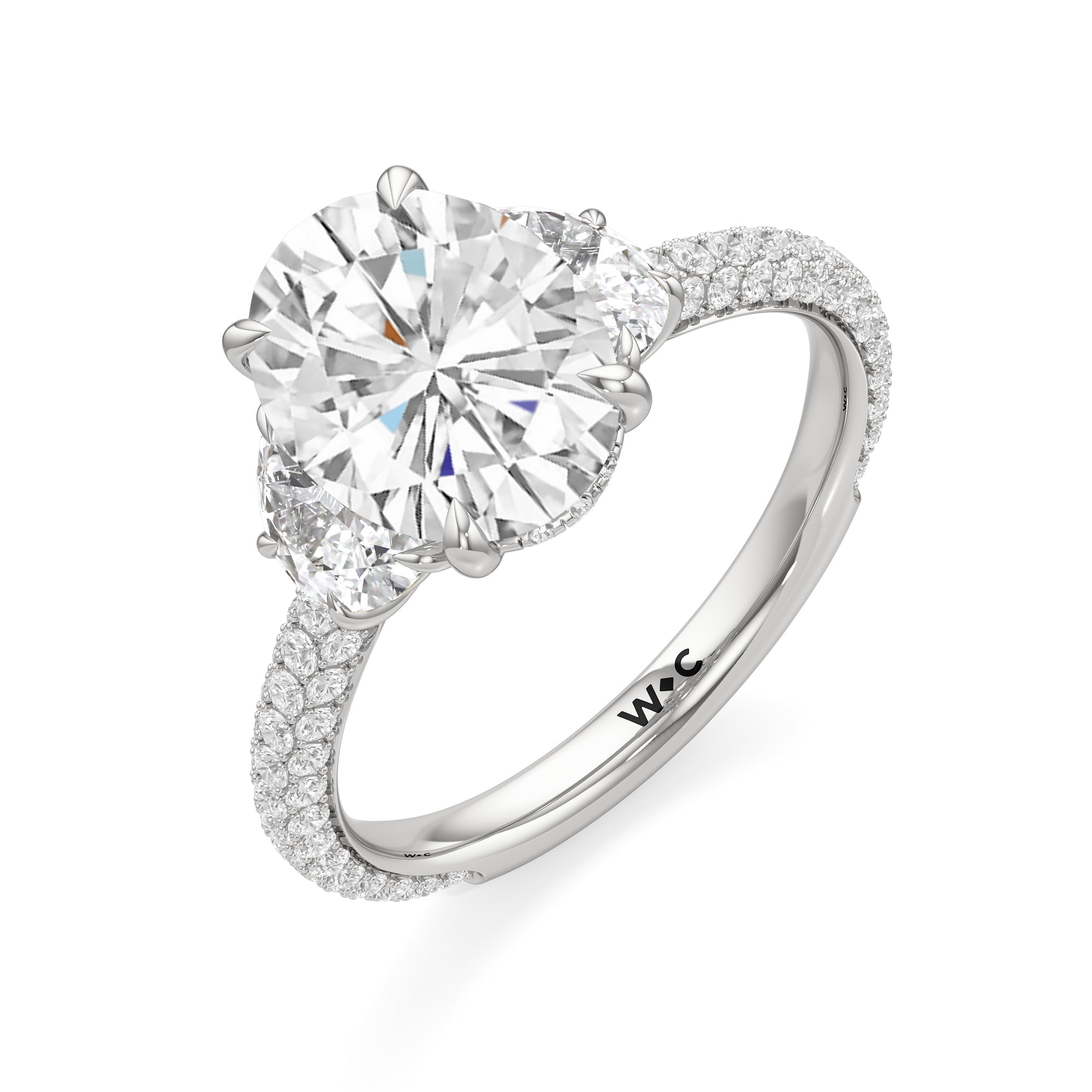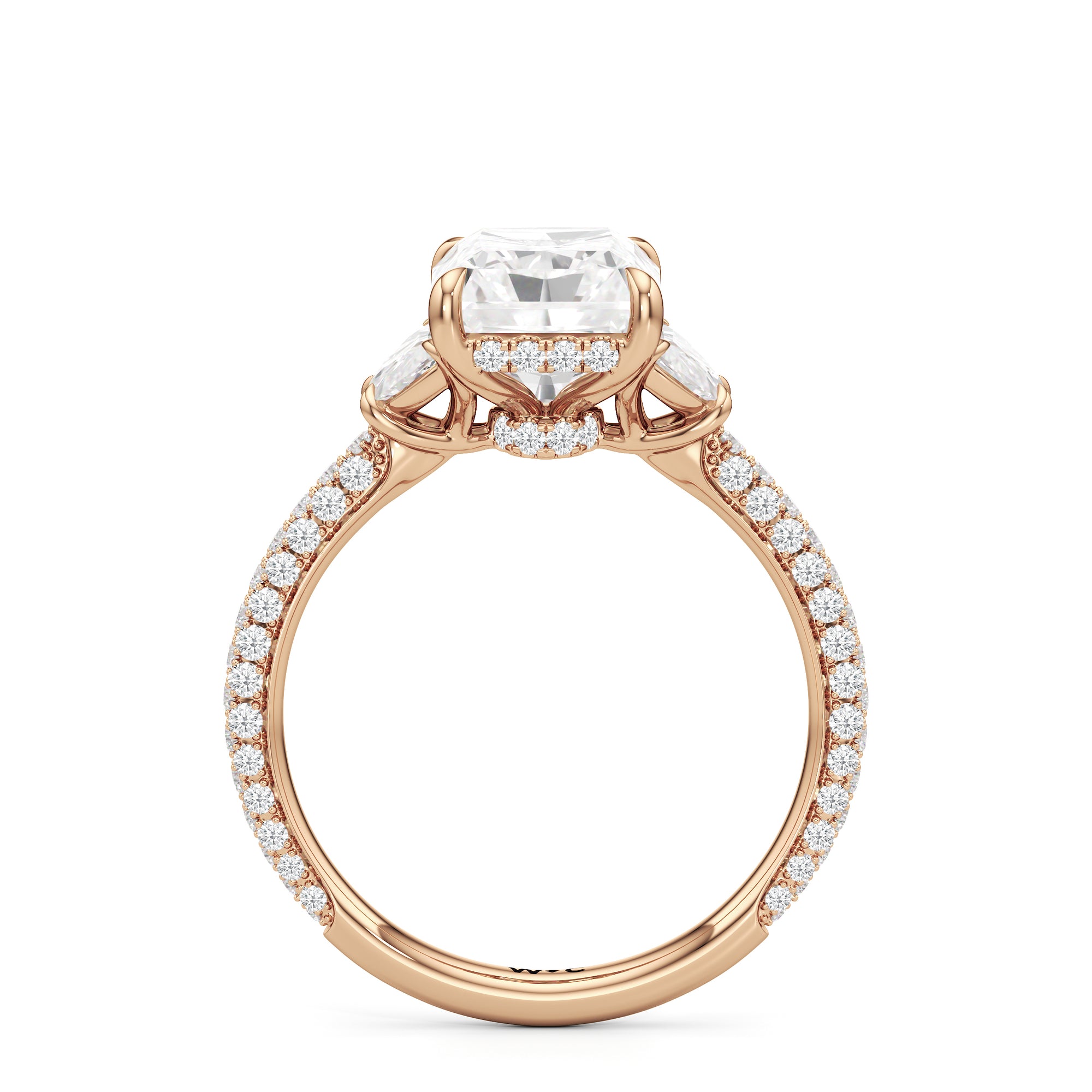 Contemporary classicism defines the style of this ring. The focal diamond sits in between two half-moon-shaped diamond side stones. A diamond-studded rail and a hidden halo accentuate the central stone. On the other hand, the two side stones are held by claw prongs that intertwine, extend, and form the ring's bridge. The diamond trio centerpiece rests on a band that is almost fully covered with petite round diamonds.