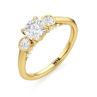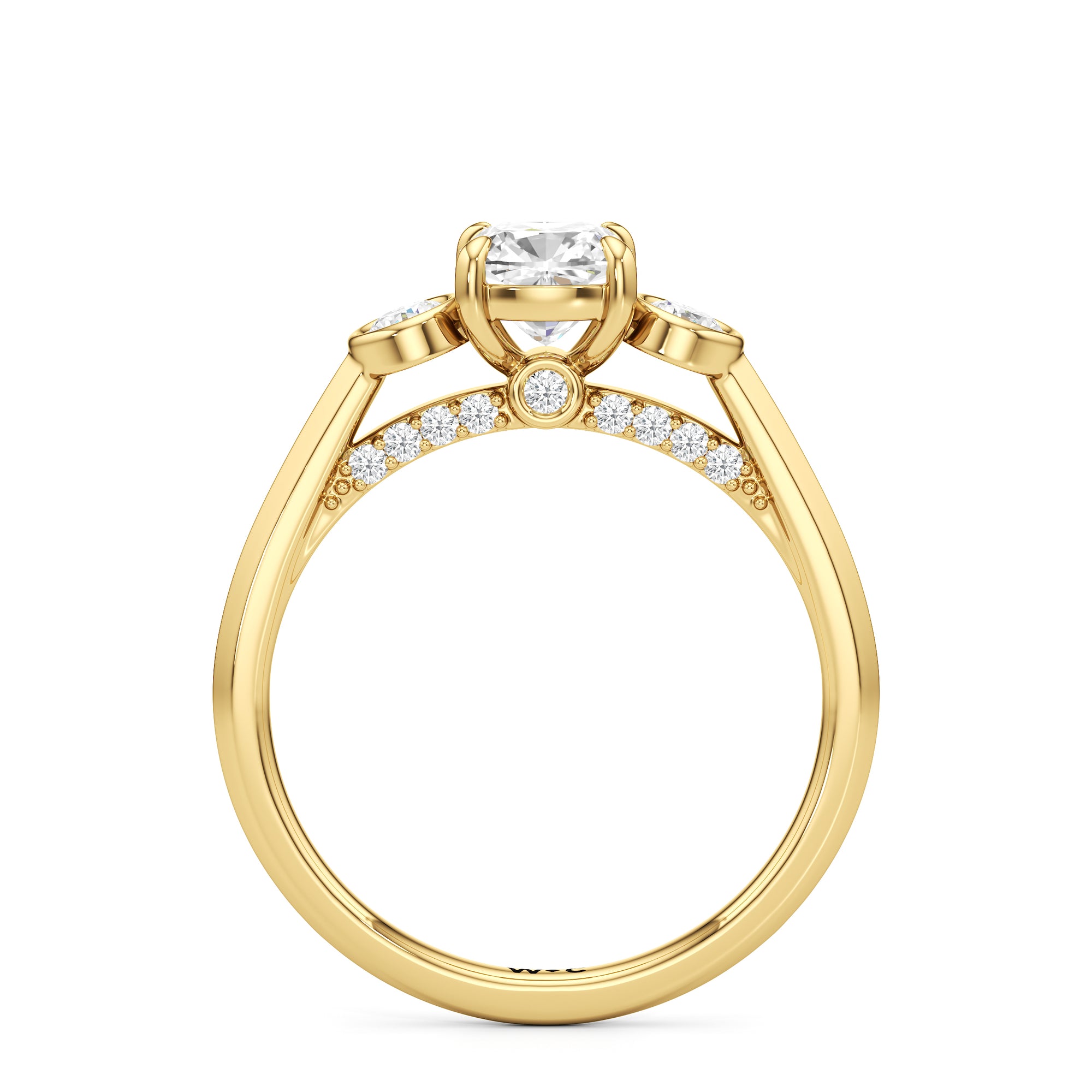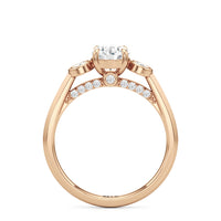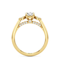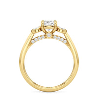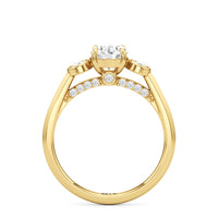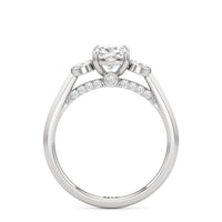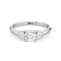 This creatively designed engagement ring stands out from the crowd with its artistic appeal. It has an unusual style and an angular look softened by the brilliance of the round diamonds. The knife-edge shank has a plain, polished finish so that the diamond-studded bridge and the trio of stones can shine.
