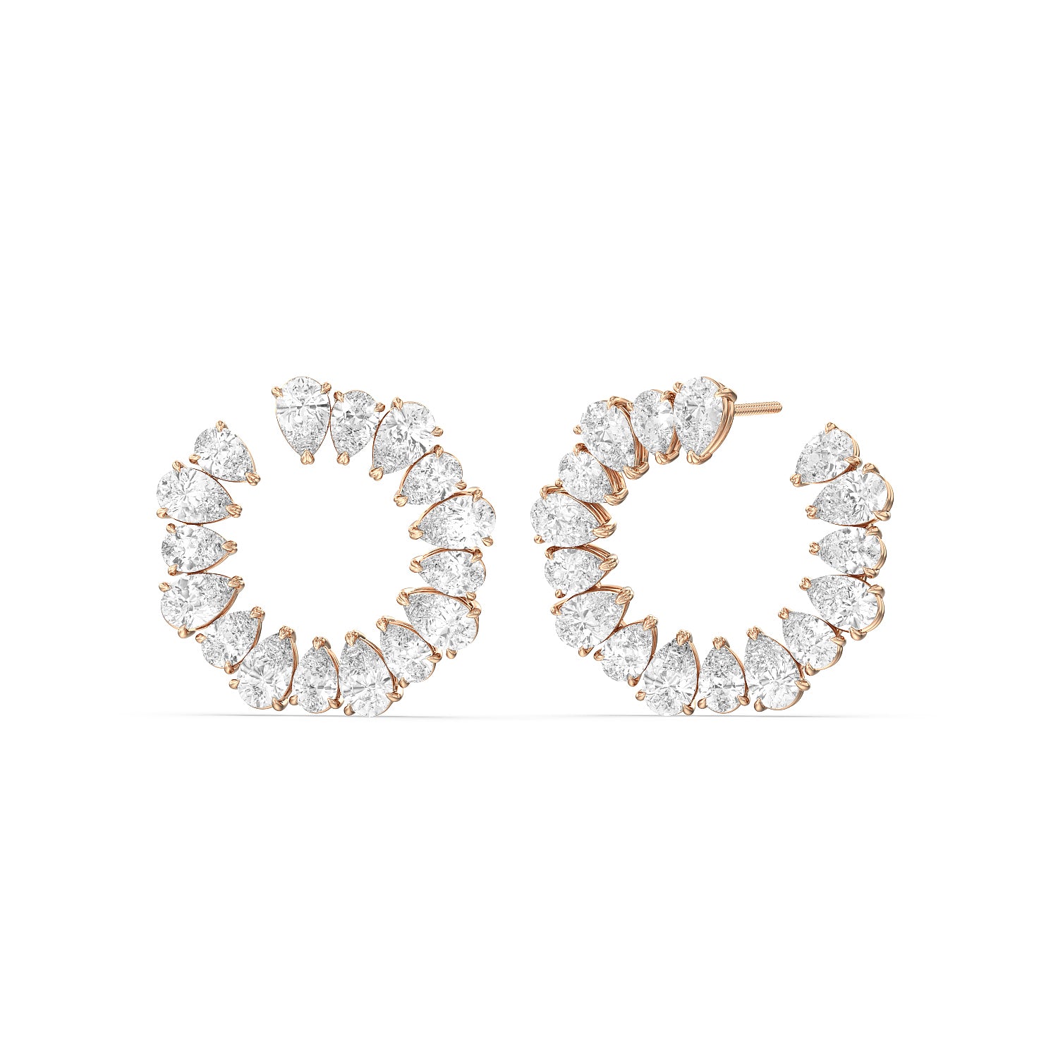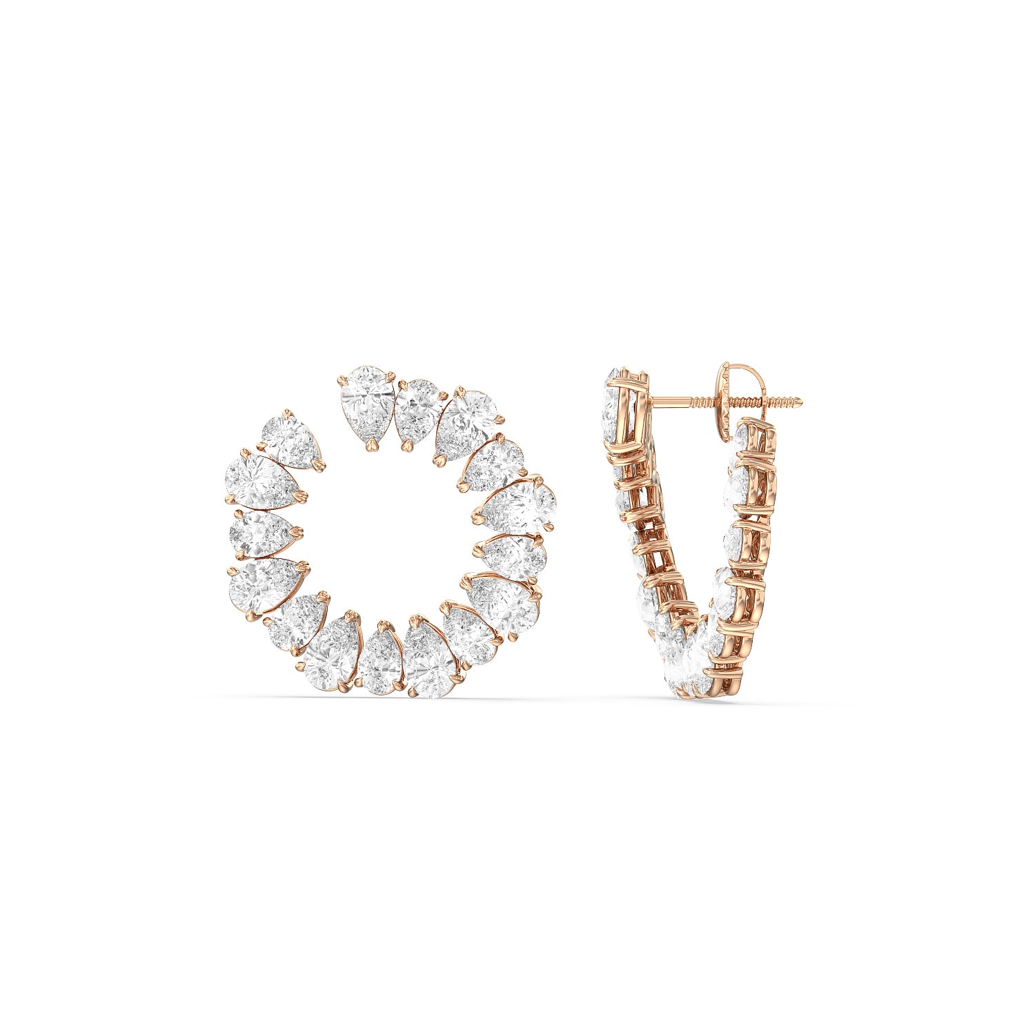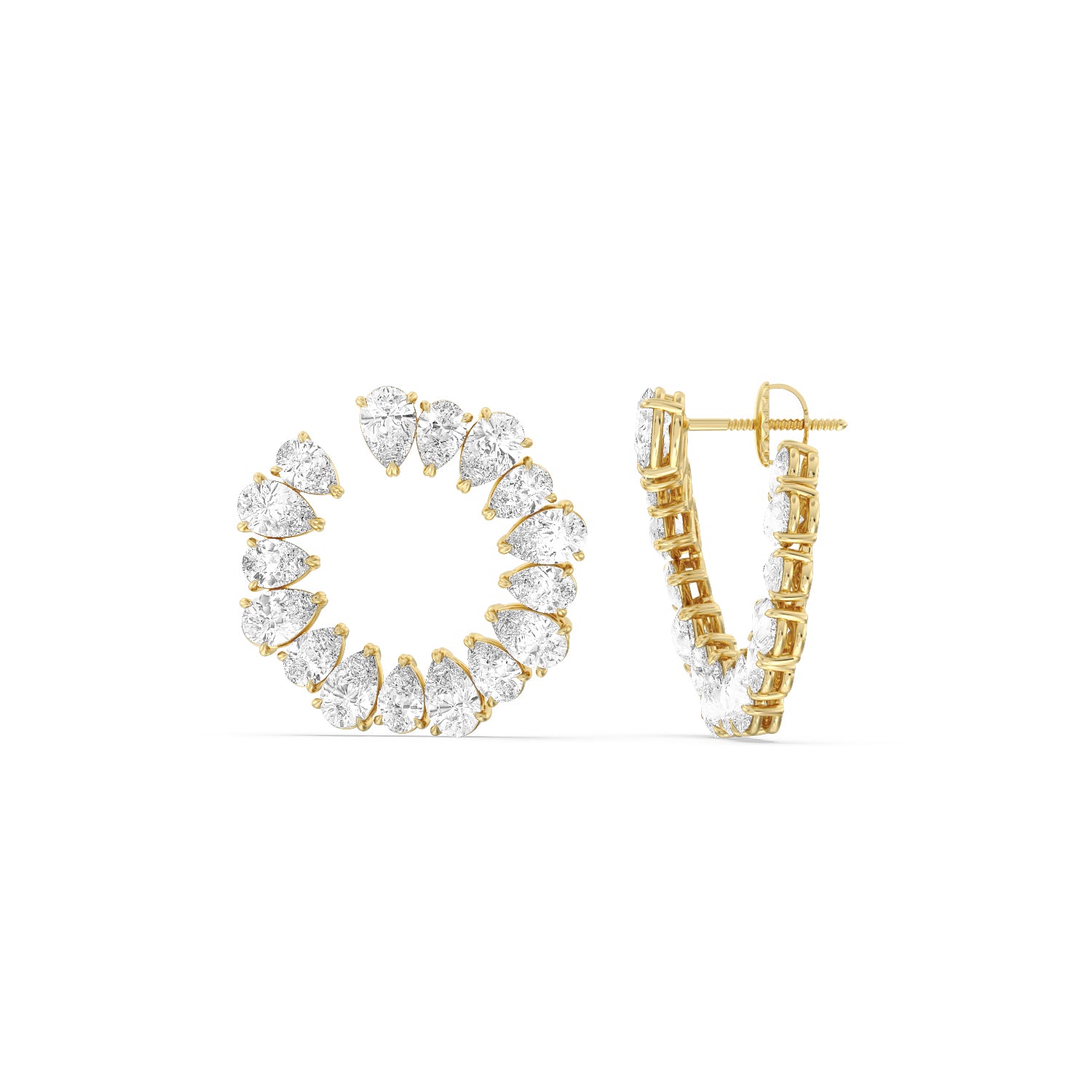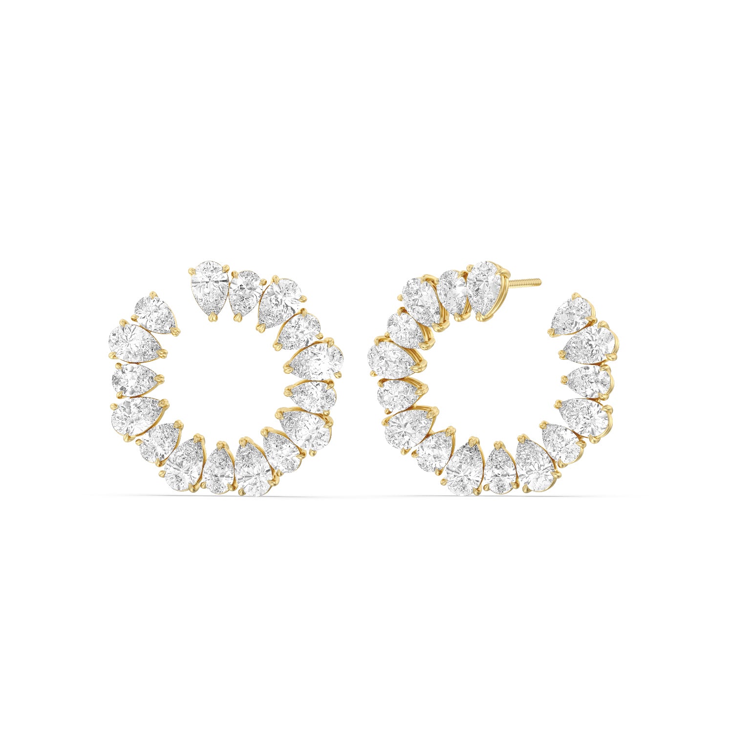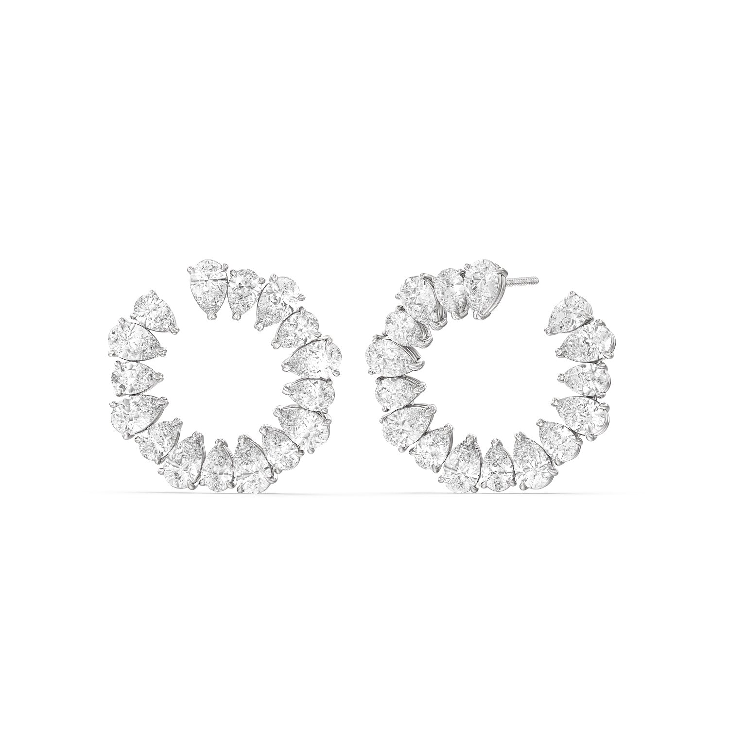 Definitely not your typical ear hoops; these are absolute showstoppers. These luxurious earrings feature a circular assembly of pear-cut diamonds, totaling 32 in quantity and 13.28 carats in carat weight. Without a doubt, this pair can luxuriously add richness to your evening ensembles.