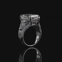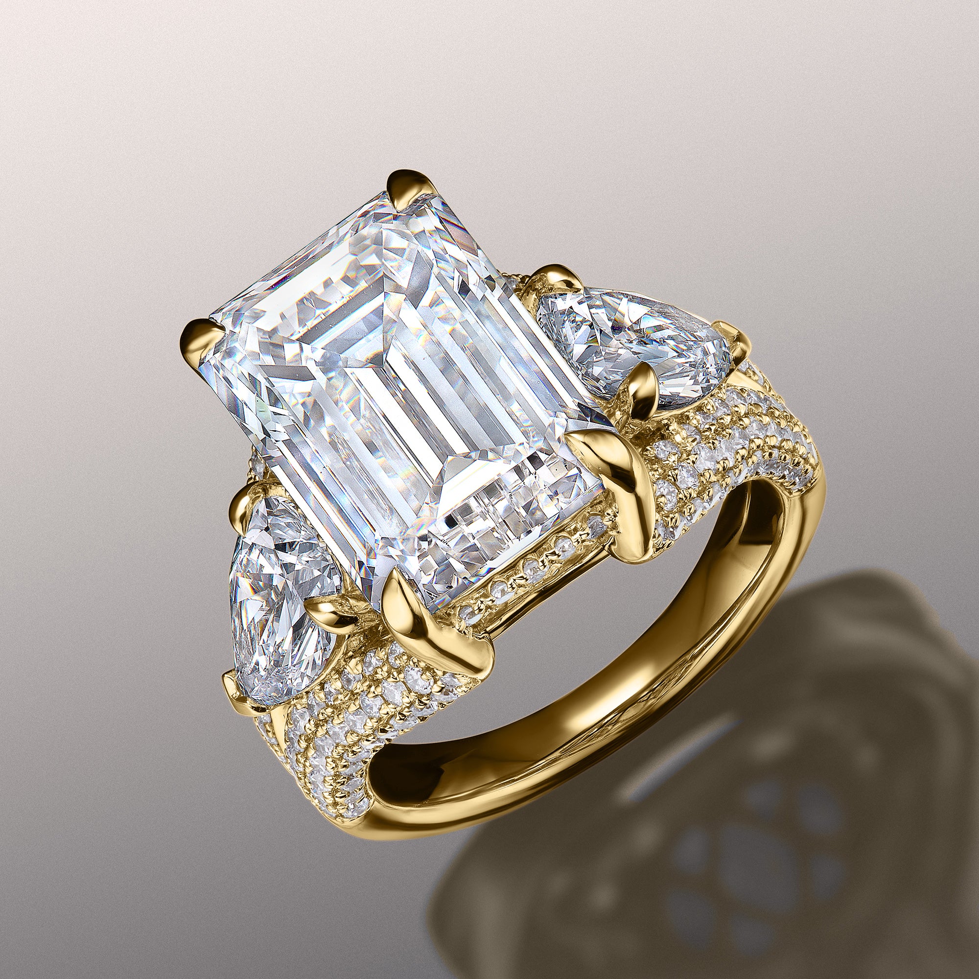 Embrace meticulous handwork with a mesmerizing blend of individuality that mirrors your unique love story. Exuding glamour, this ring features a shimmering split pave band that leads to a jaw-dropping emerald-cut diamond center stone. Right in the middle of each splitting shoulder is a pear diamond that also serves as a side stone. The rail that secures the central gem is also lined with petite round diamonds for a sparkle that never ends.