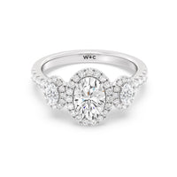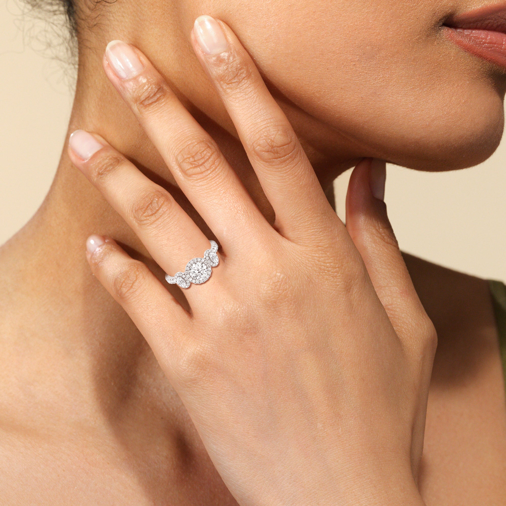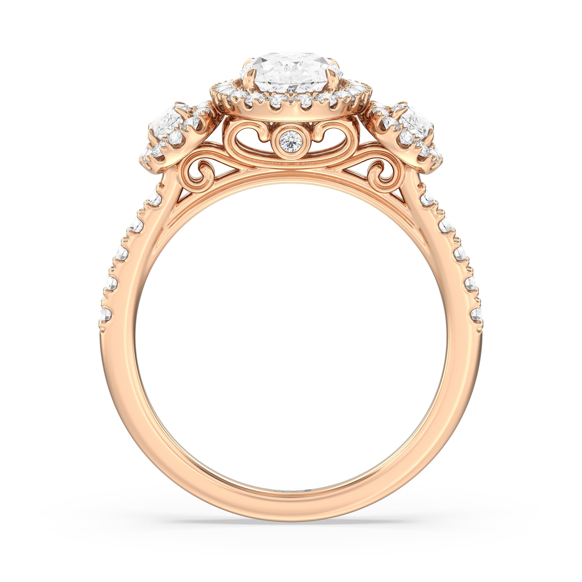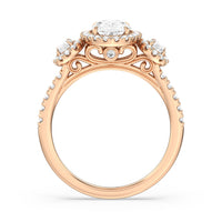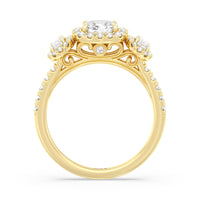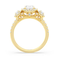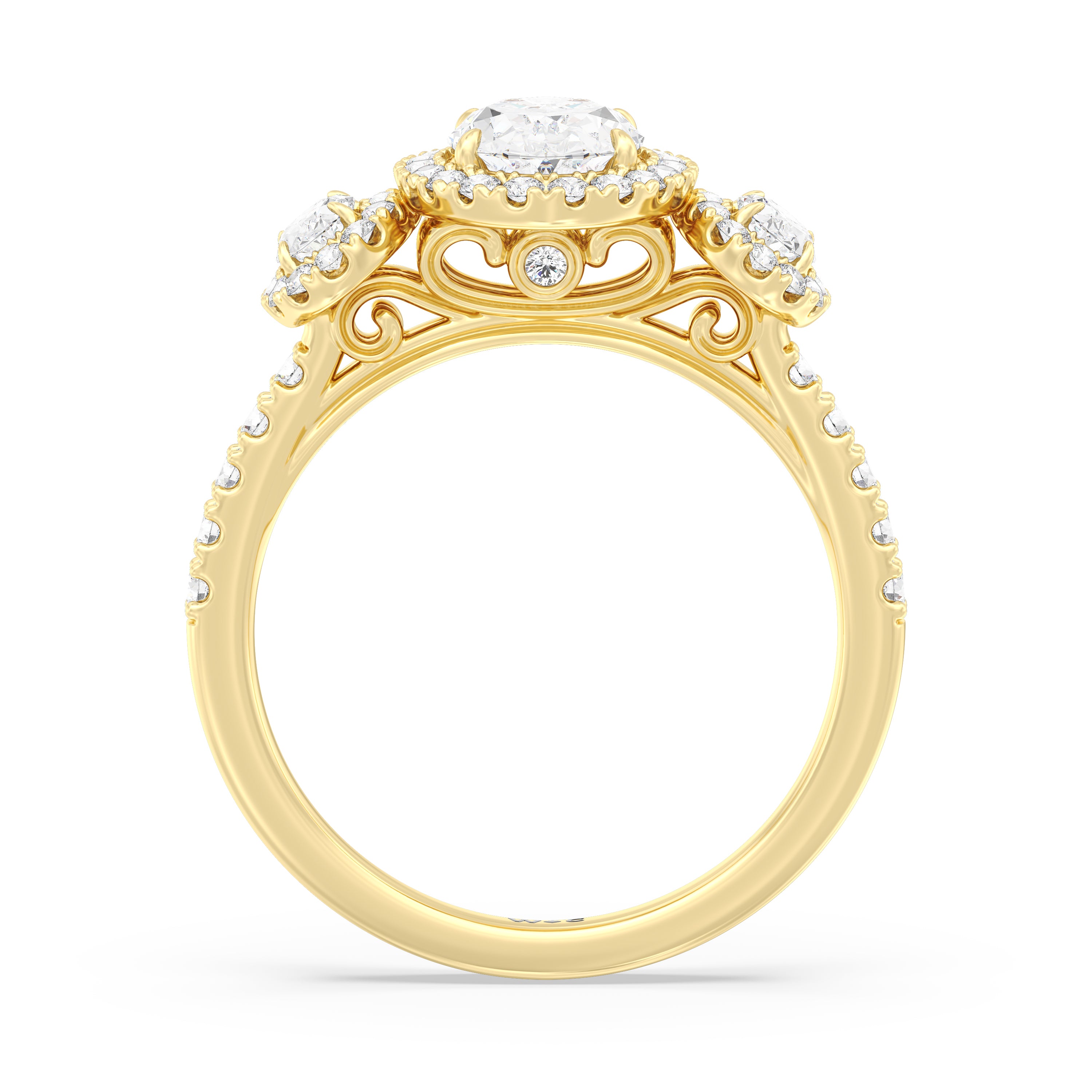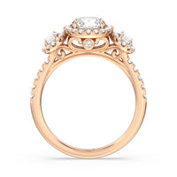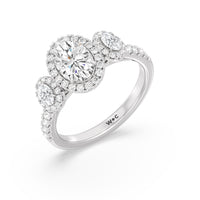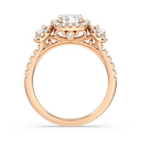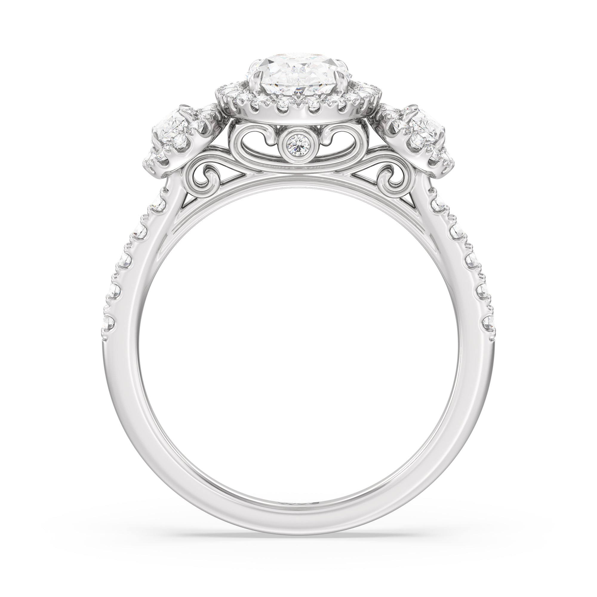 The triple-halo, three-stone Kaia Engagement Ring makes a glamorous symbol of a love story's past, present, and future. It is designed with a cathedral shank with diamond-studded shoulders, and a vintage-leaning swirled gallery. Its three-stone centrepiece is comprised of a diamond centre stone in between two oval diamond side stones. Each of the three main stones is framed by a diamond halo.