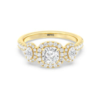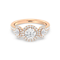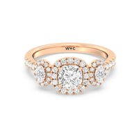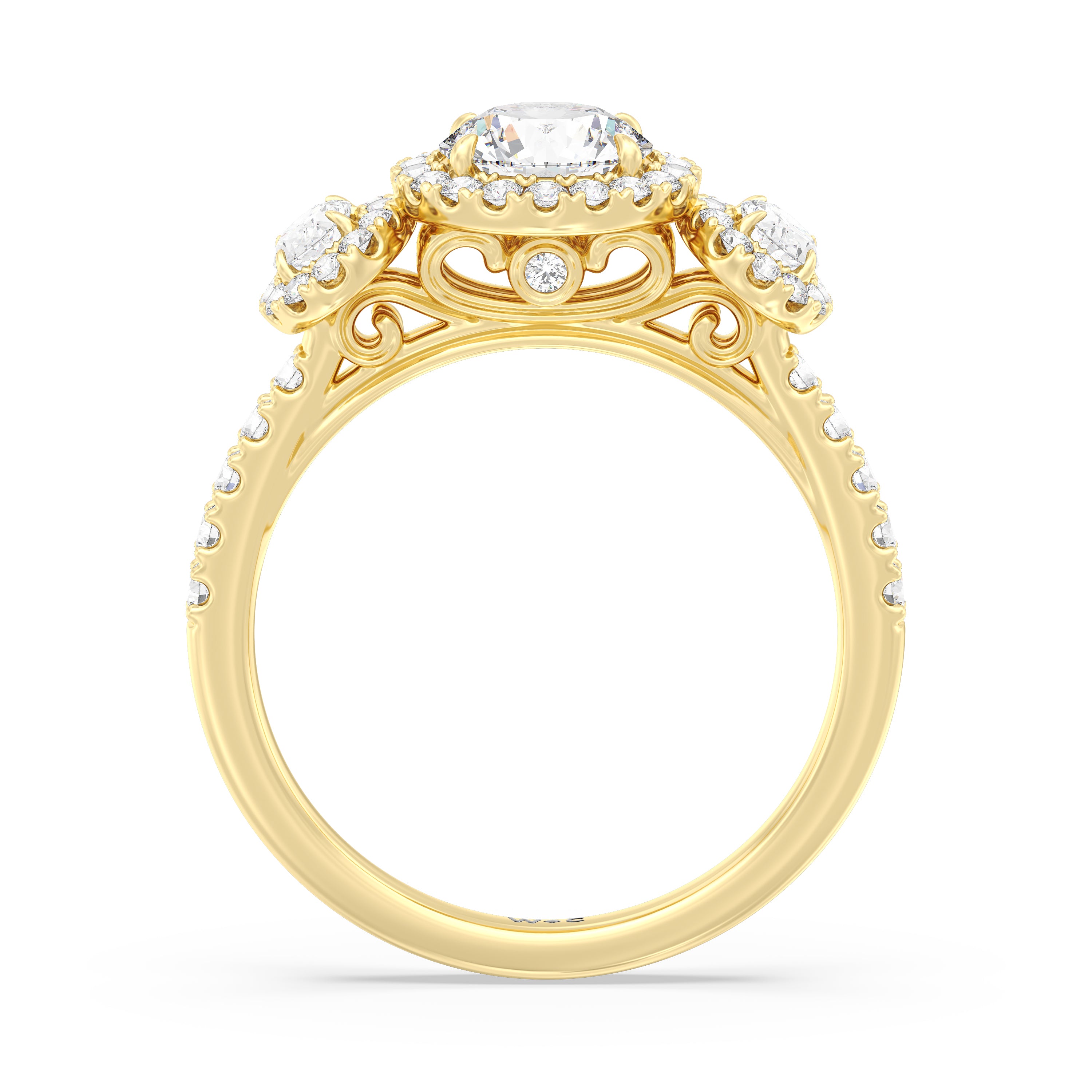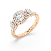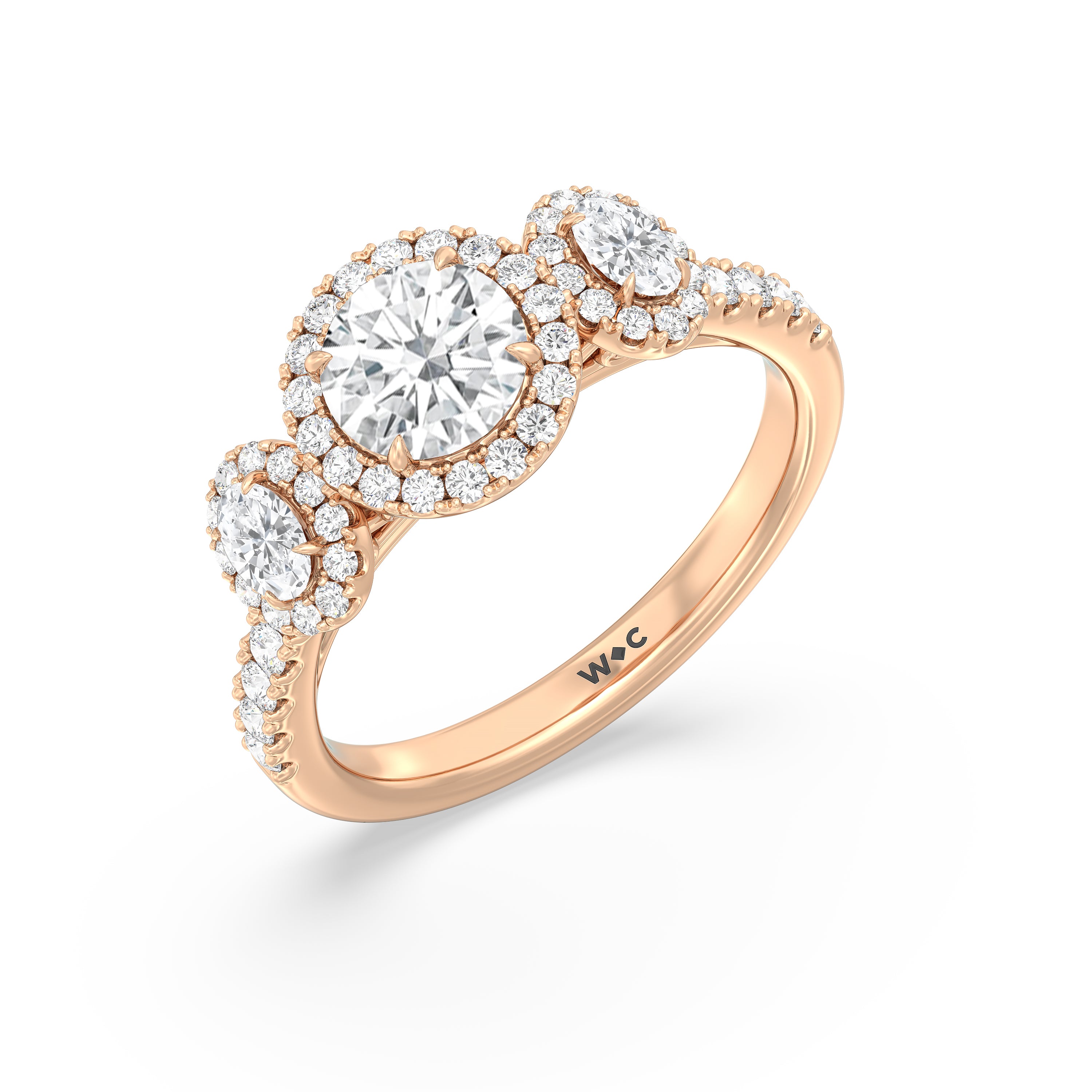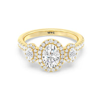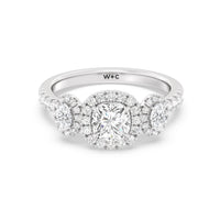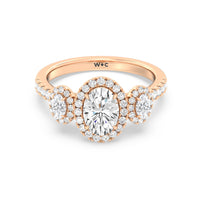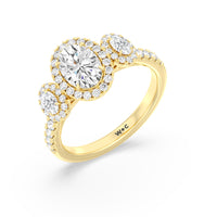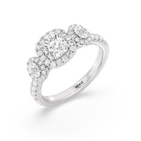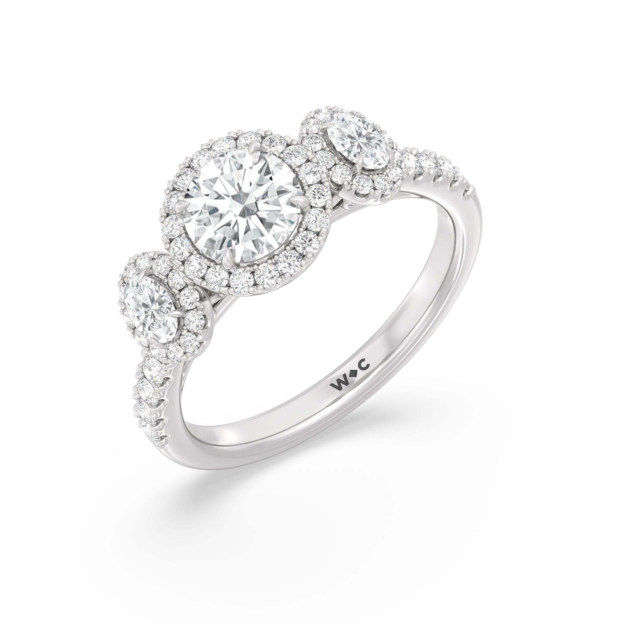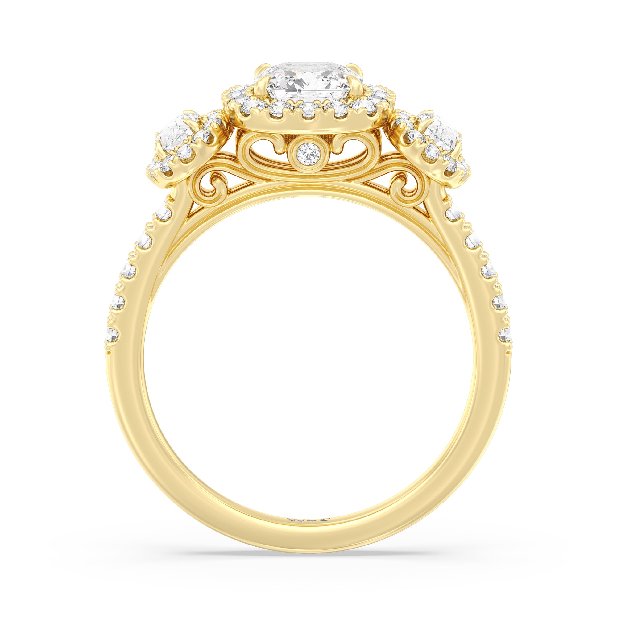 The triple-halo, three-stone Kaia Engagement Ring makes a glamorous symbol of a love story's past, present, and future. It is designed with a cathedral shank with diamond-studded shoulders, and a vintage-leaning swirled gallery. Its three-stone centrepiece is comprised of a diamond centre stone in between two oval diamond side stones. Each of the three main stones is framed by a diamond halo.