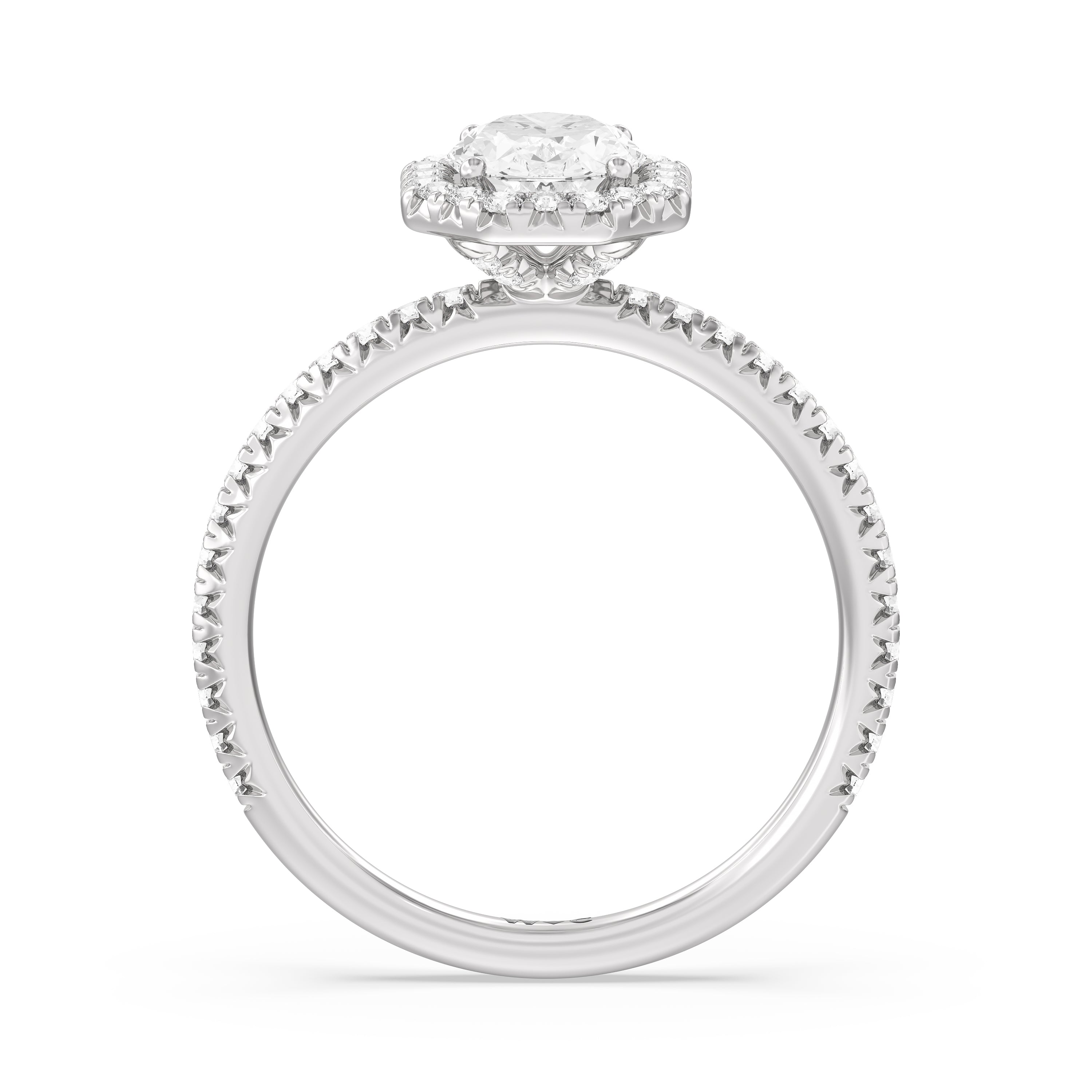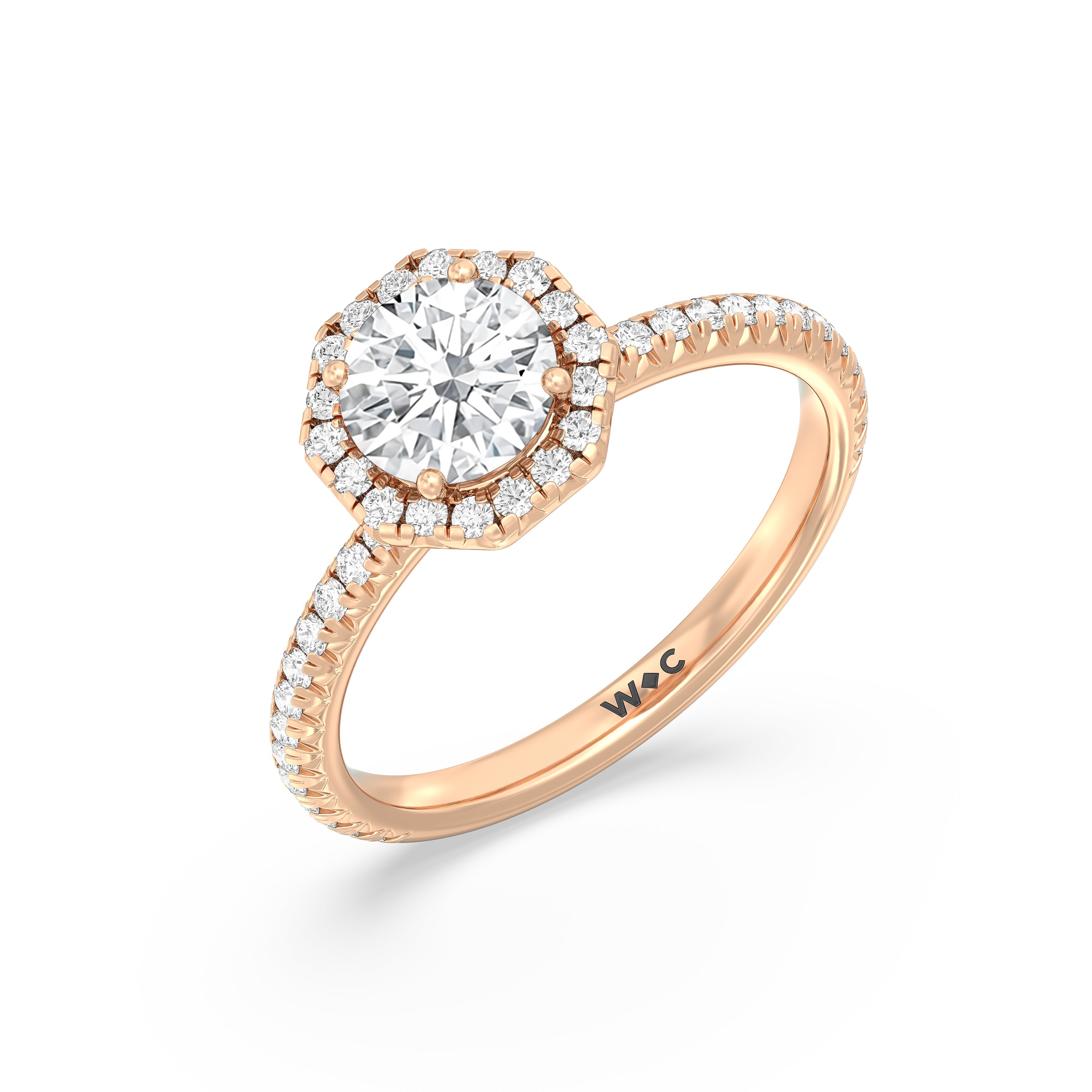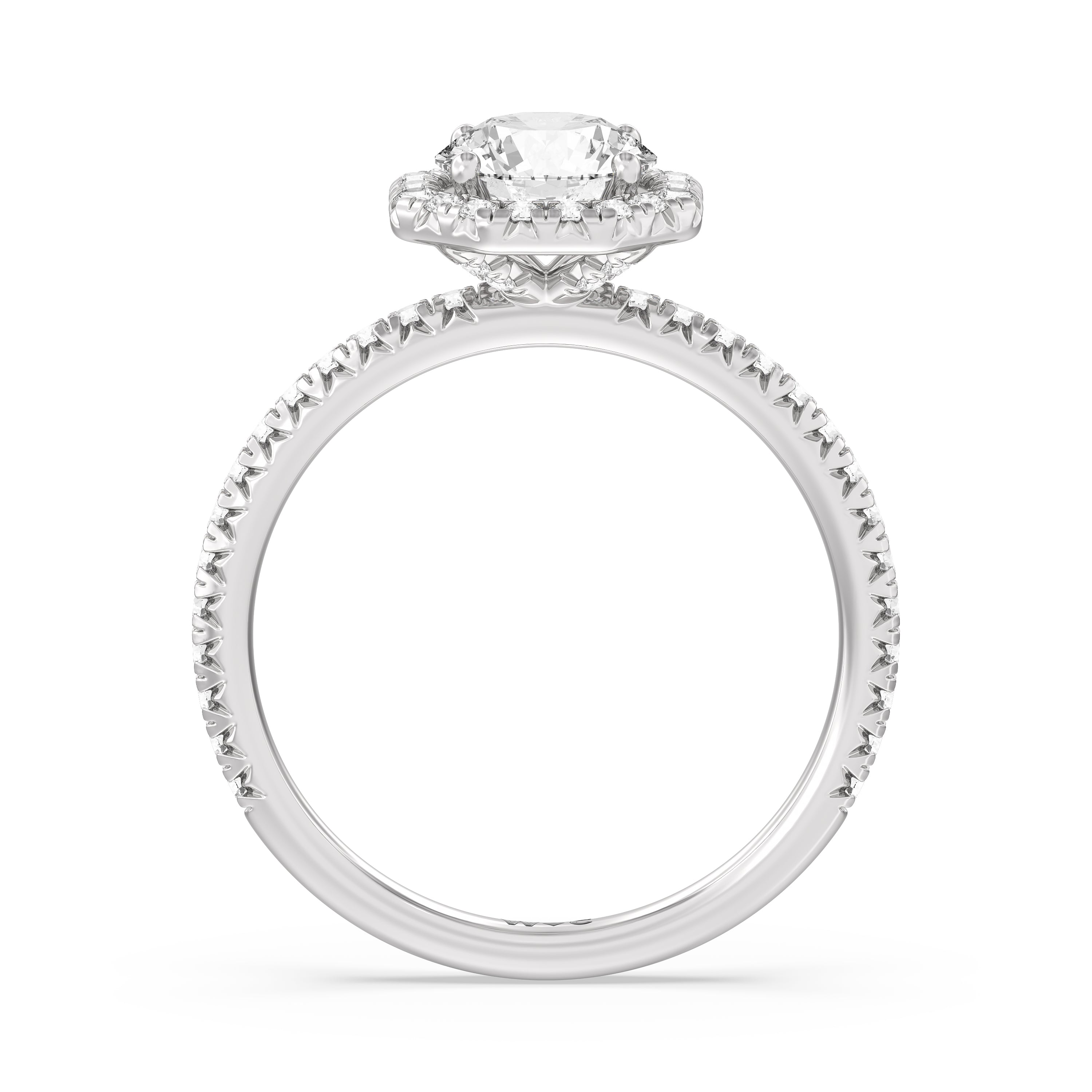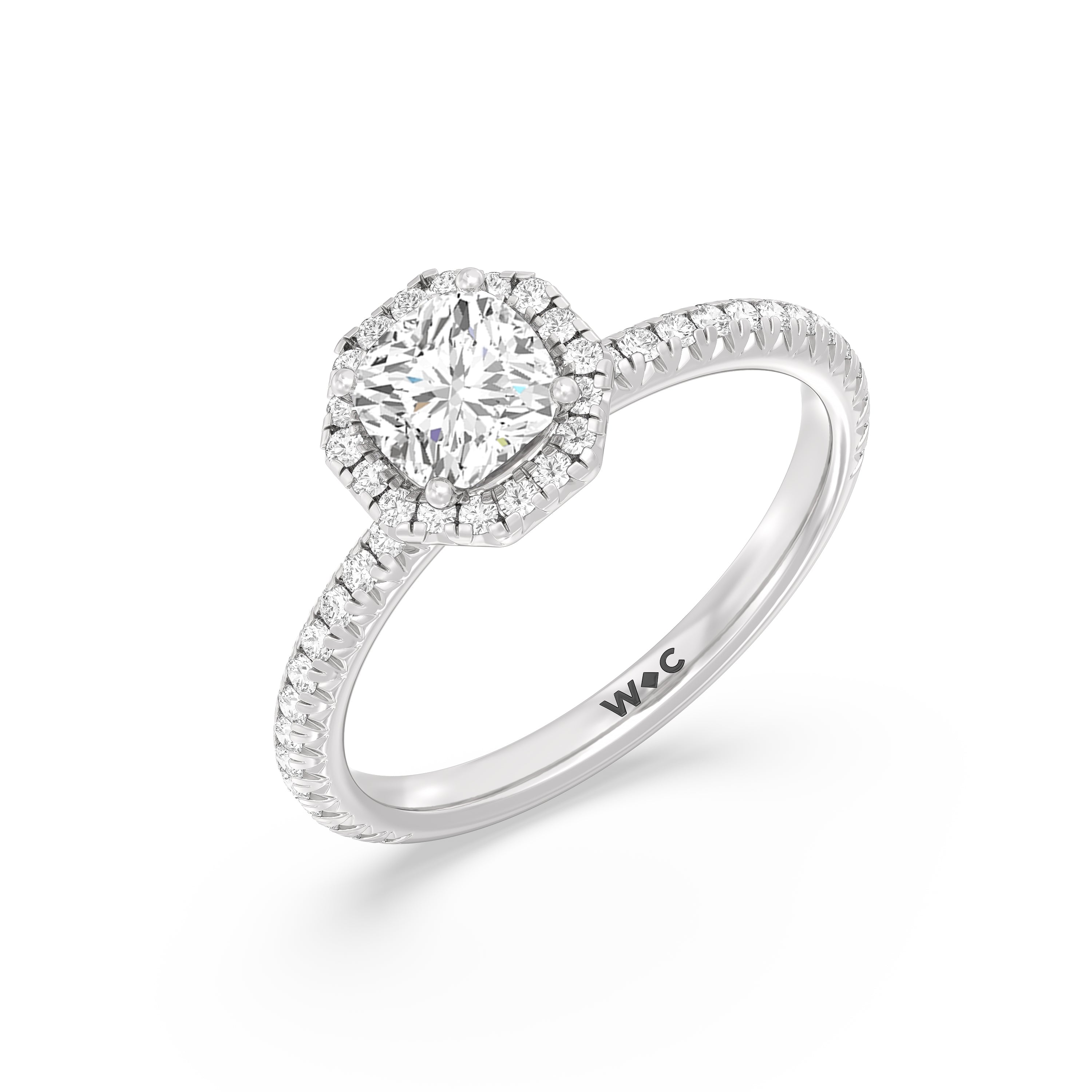 The look of this ring will transport you back in time. Designed with an art deco flair, this engagement ring features an octagon-shaped halo traced by petite round diamonds in fishtail pavé setting. The centre stone with an octagonal halo sits high atop a diamond-studded band, with round diamonds also in fishtail pavé setting. More petite round diamonds can be seen underneath the central gem, delicately lining the V-shaped base that supports the centrepiece.