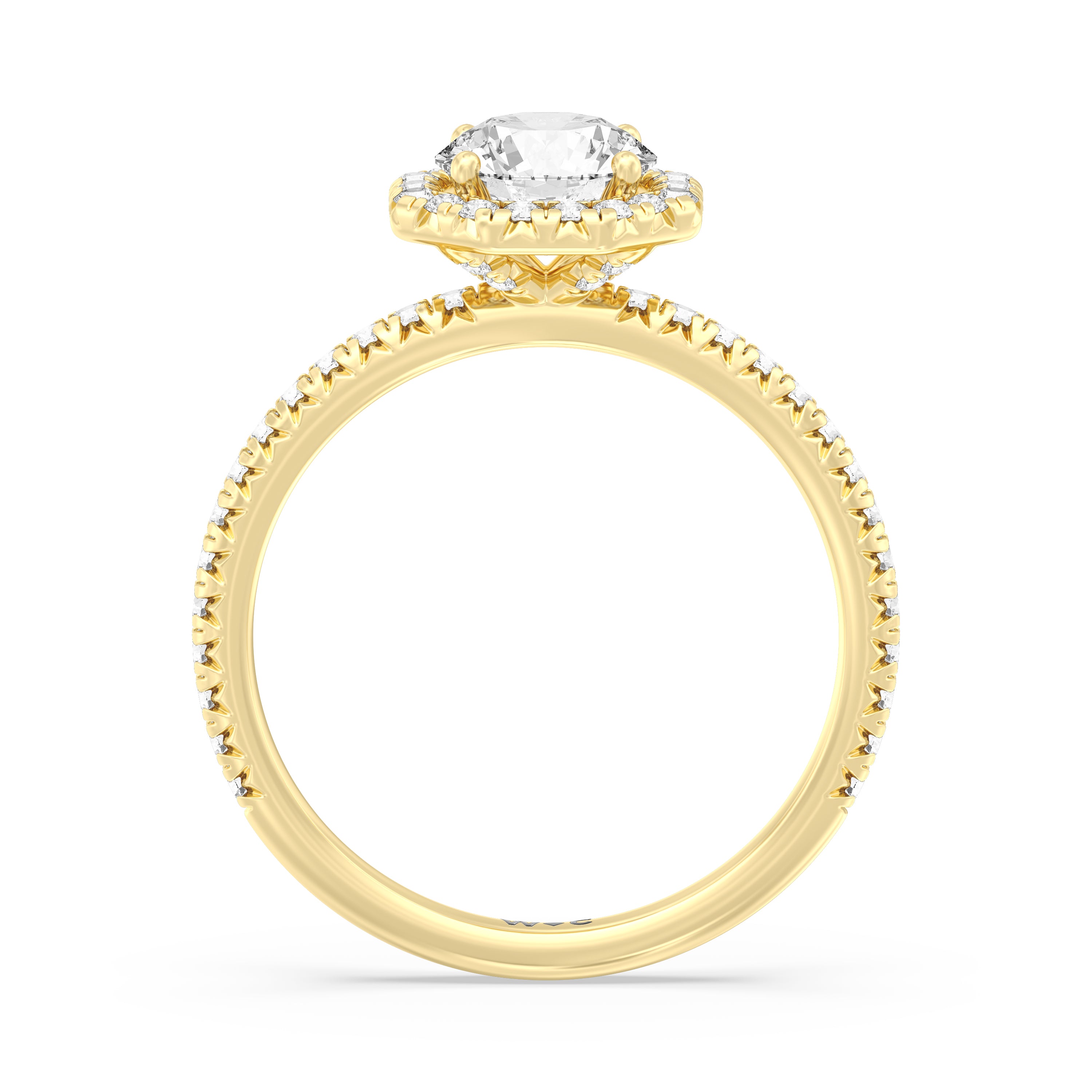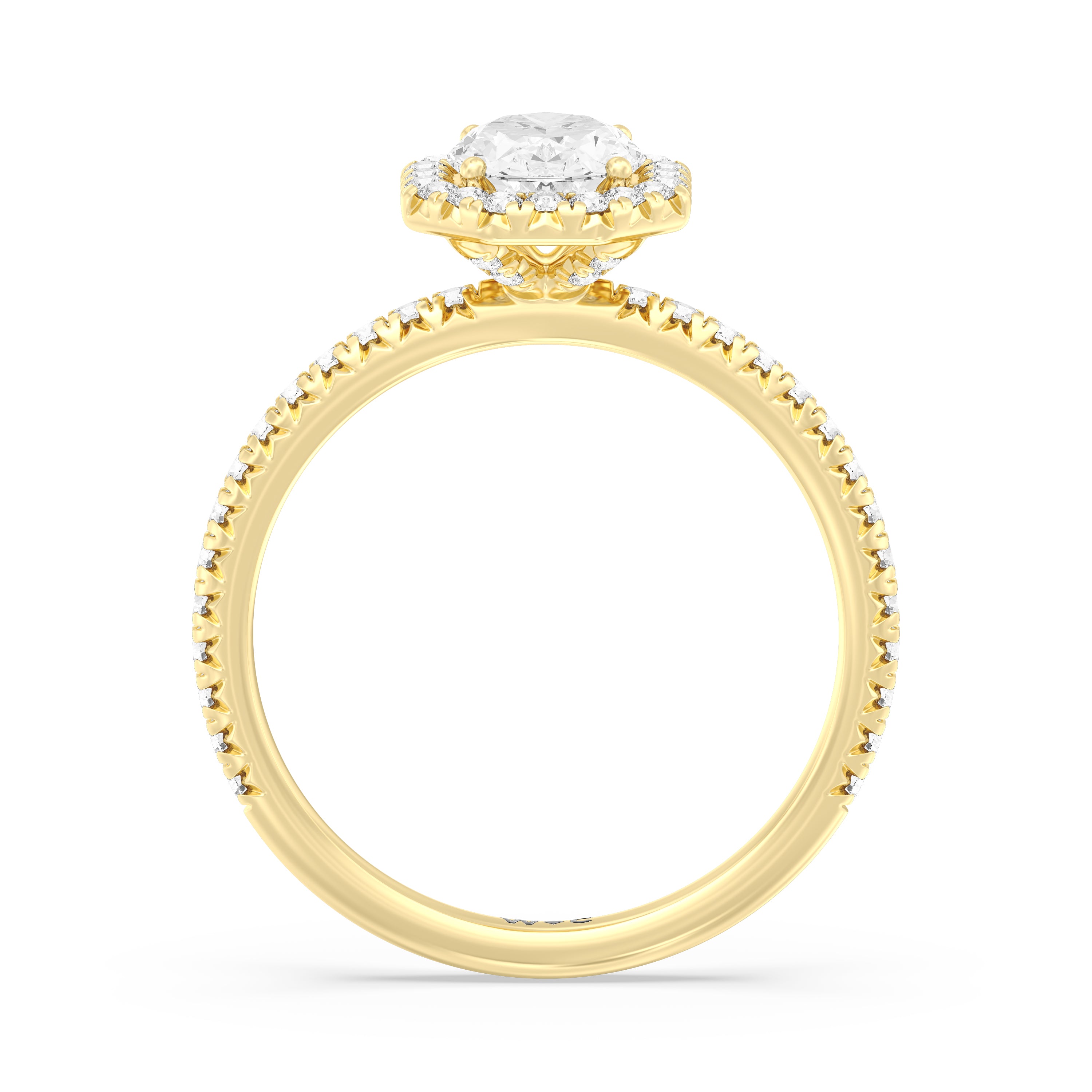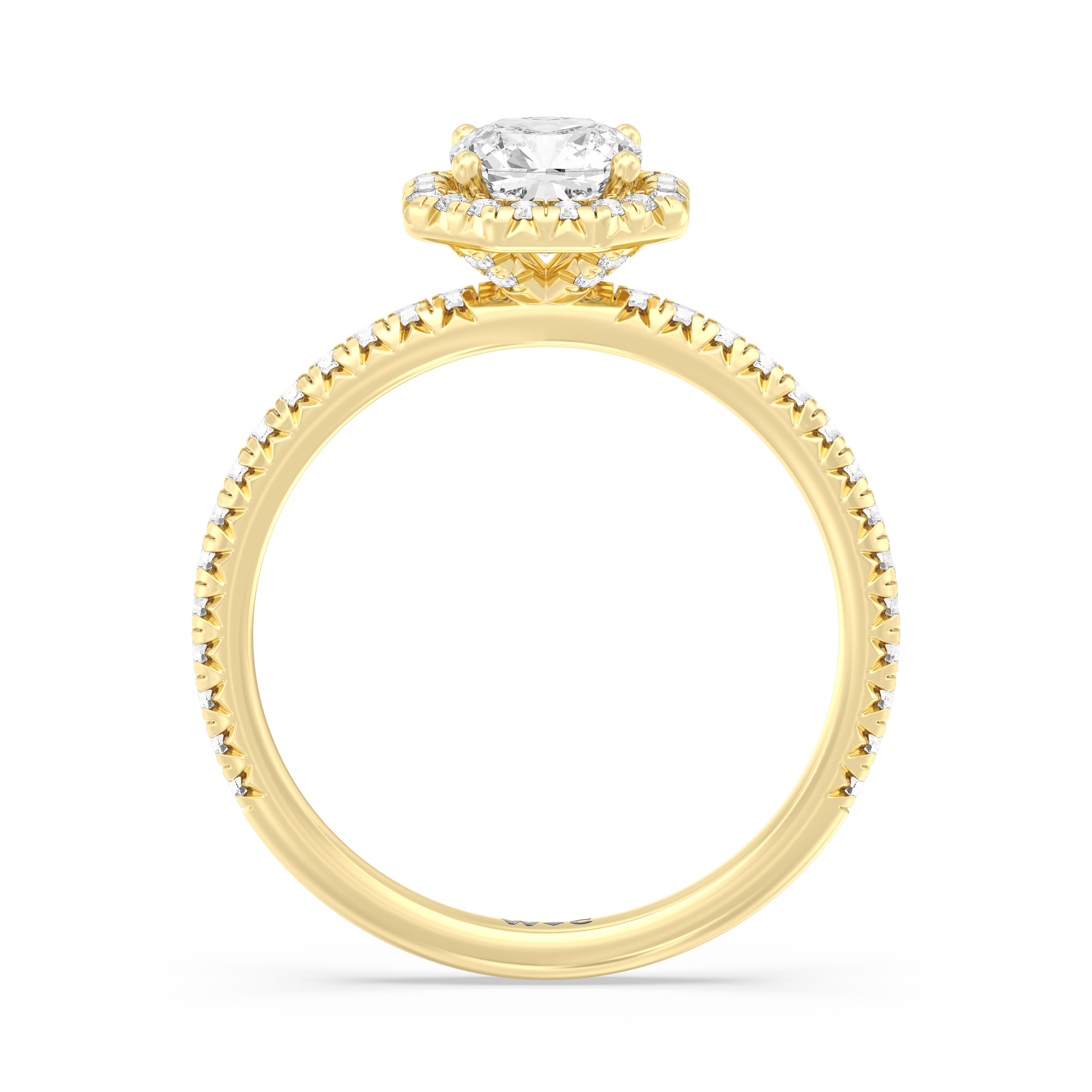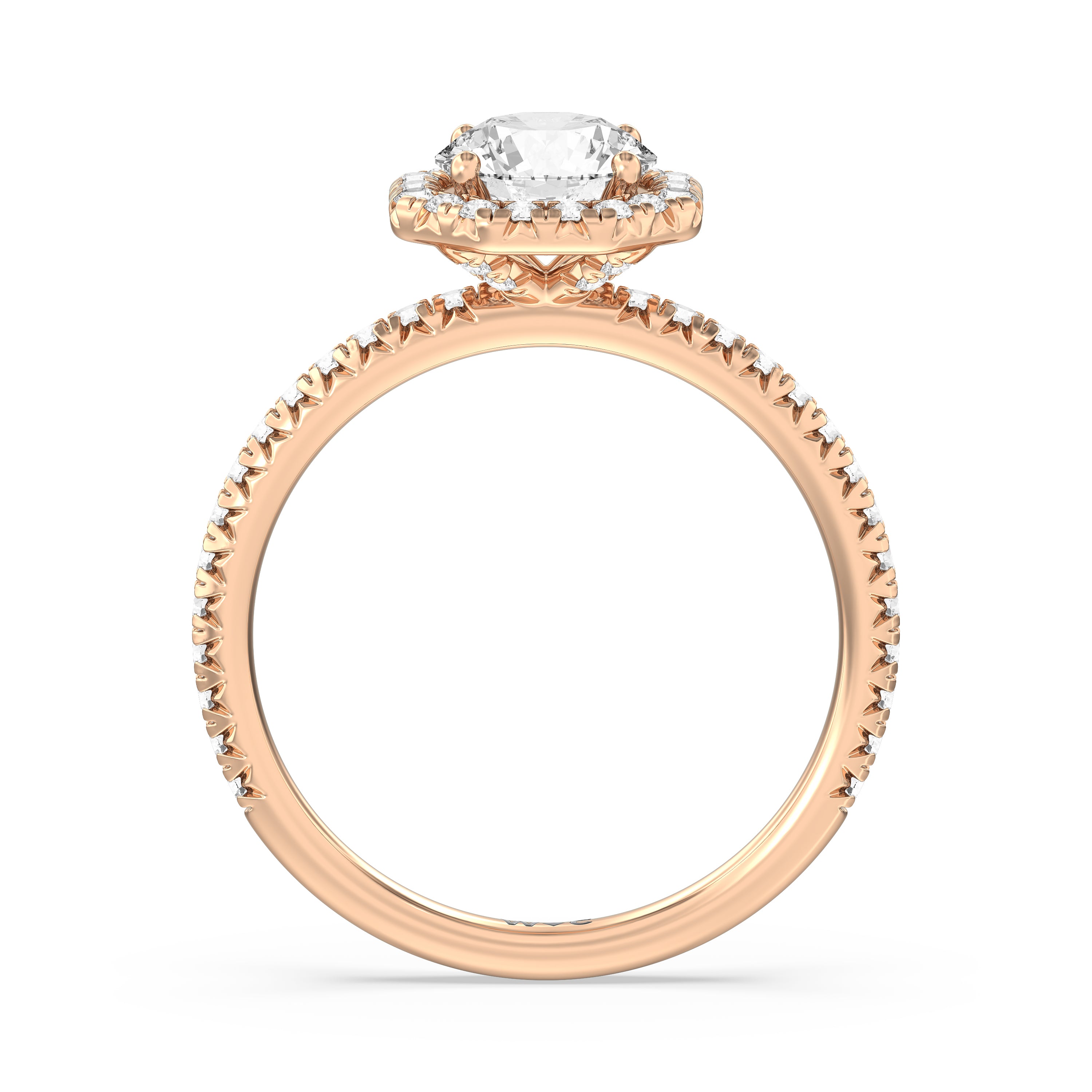 The look of this ring will transport you back in time. Designed with an art deco flair, this engagement ring features an octagon-shaped halo traced by petite round diamonds in fishtail pavé setting. The centre stone with an octagonal halo sits high atop a diamond-studded band, with round diamonds also in fishtail pavé setting. More petite round diamonds can be seen underneath the central gem, delicately lining the V-shaped base that supports the centrepiece.