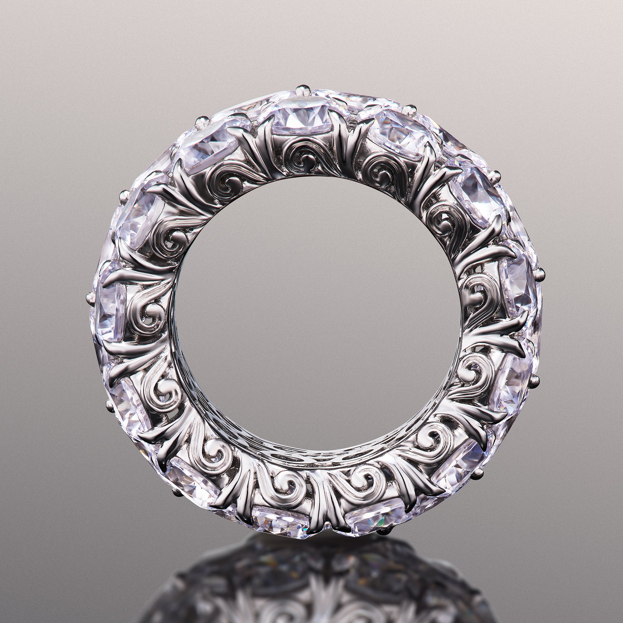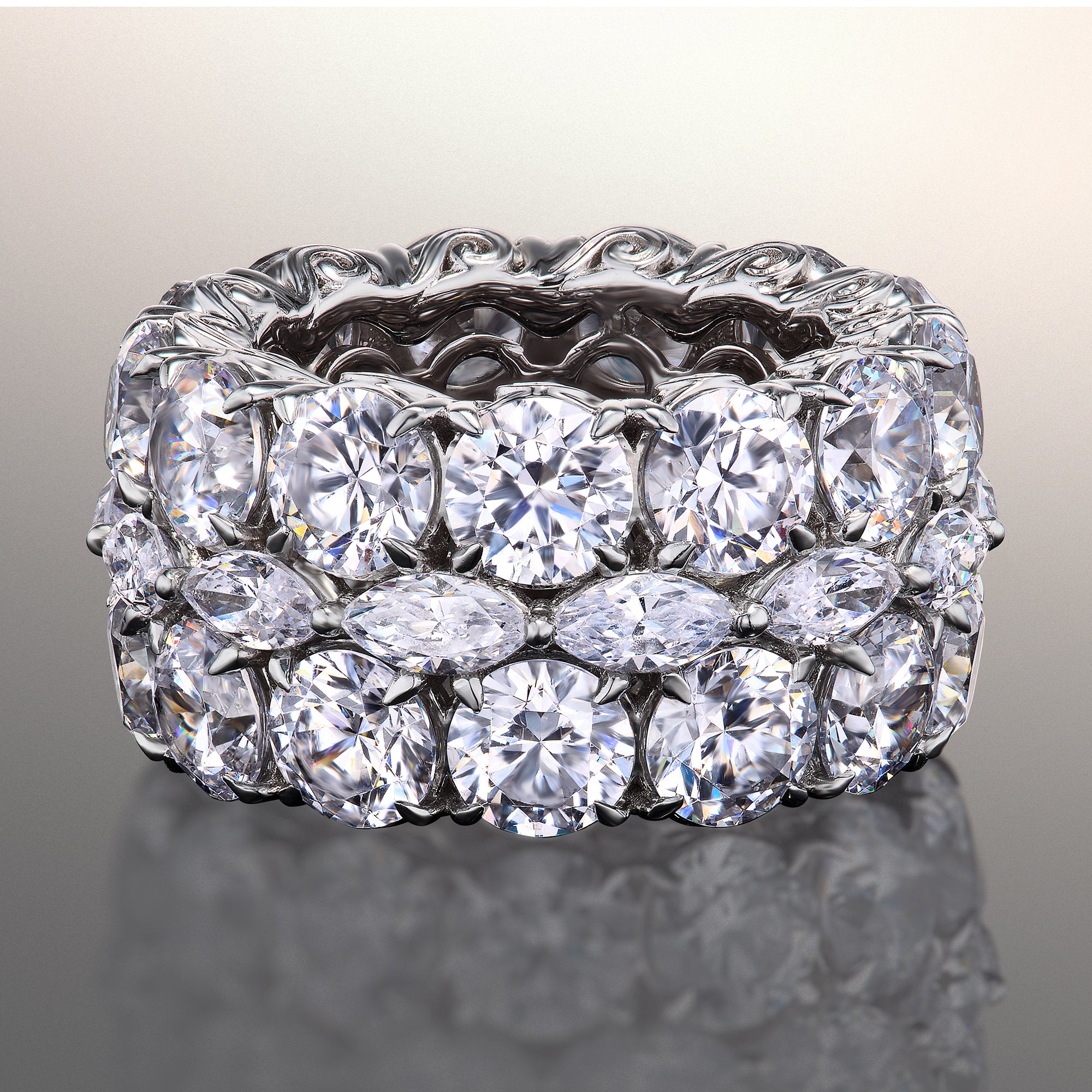 Being bold is tempting. This ring marvelously commands a presence with its three rows of diamonds. A ribbon of prong-set marquise diamonds lies at the wide band's center, sandwiched in between rows of round diamonds. The view from the band's sides reveals a decorative filigree and swirl pattern. Forty-two diamonds weighing a total of 21 3/8 carats make this ring decidedly luxurious.