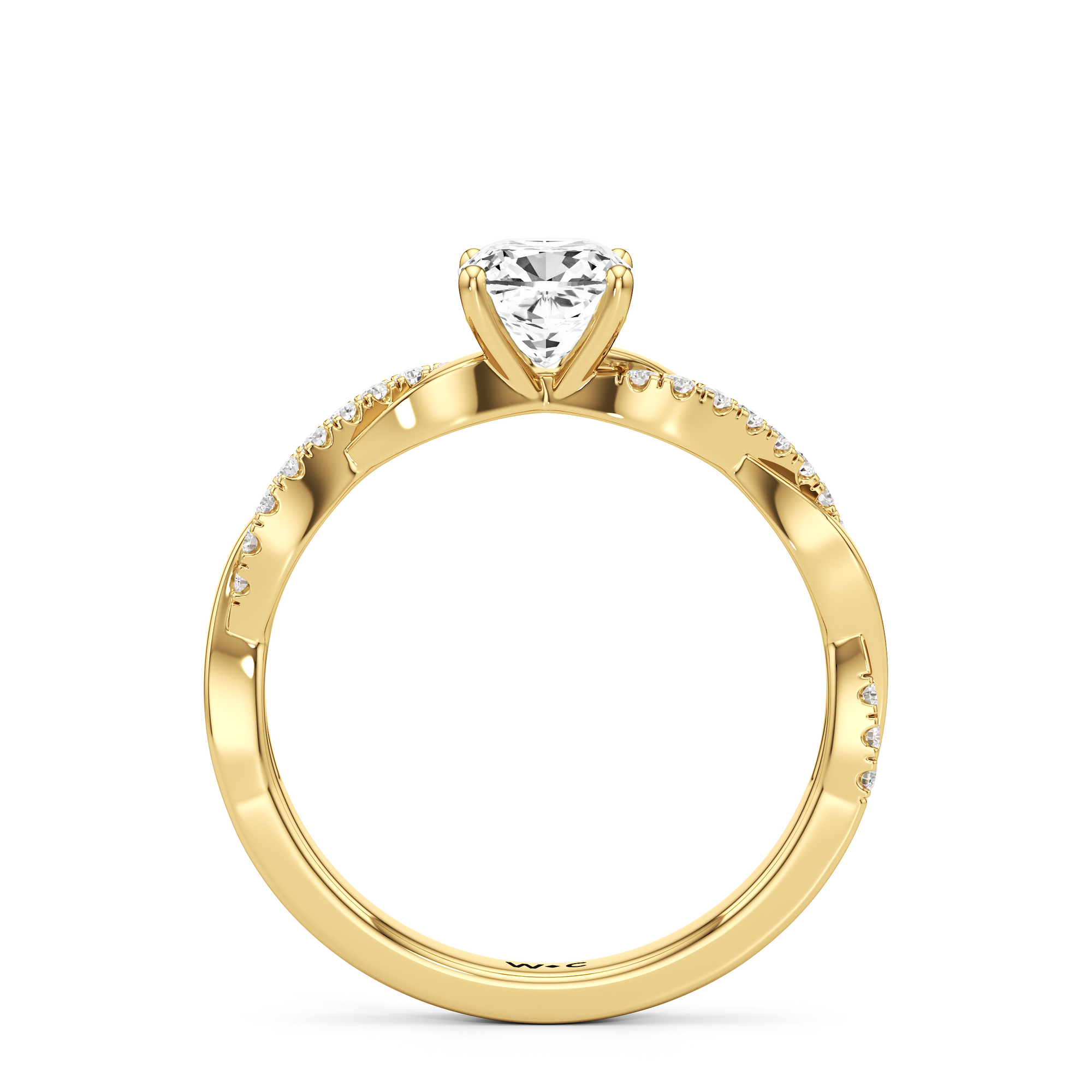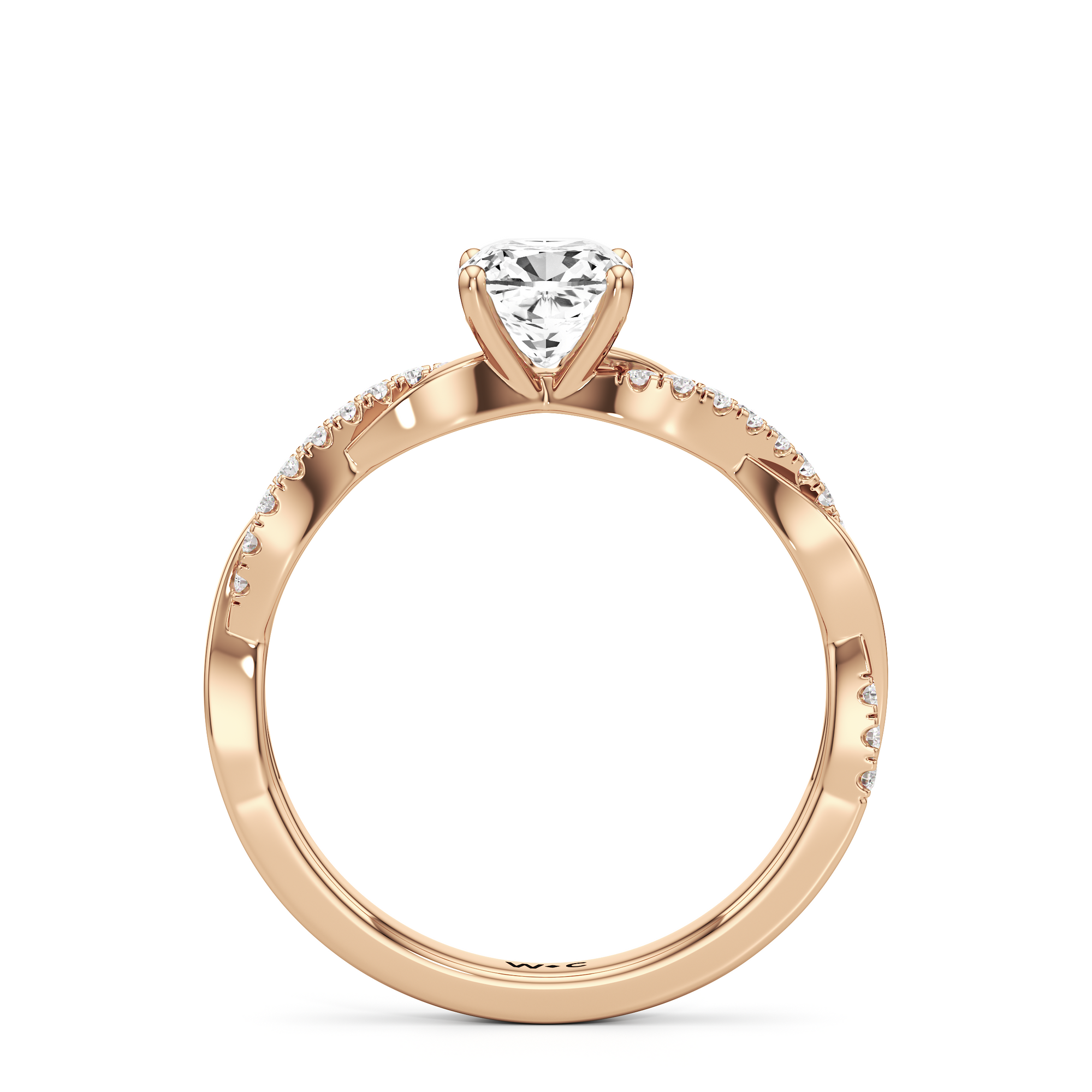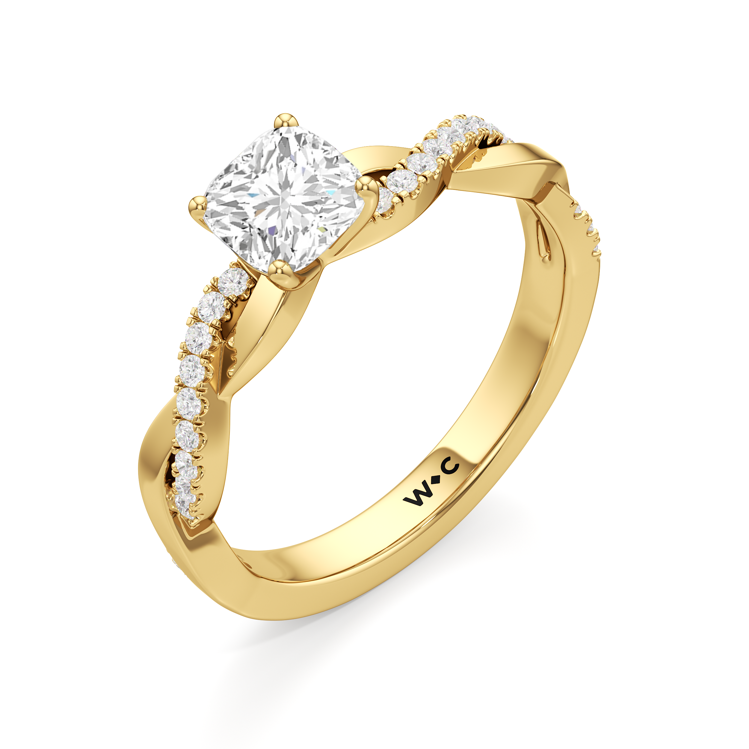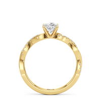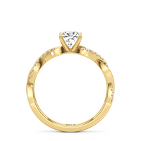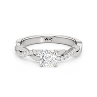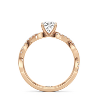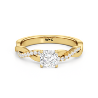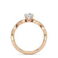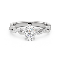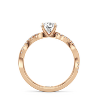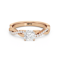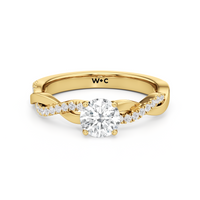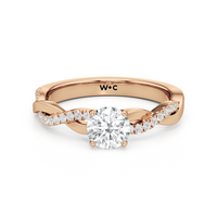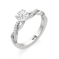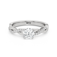 Twisted and timeless, the Lennon Engagement Ring makes a fine alternative to the conventional solitaire pavé ring. This ring features a polished band with split shoulders that intertwine. One strand has a plain, polished finish, while the other is adorned with petite round diamonds held in split prongs. The curvy band directs the eye to the diamond centre stone.