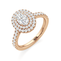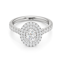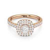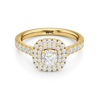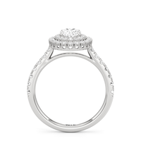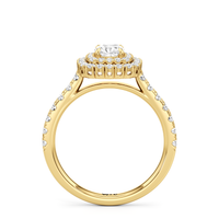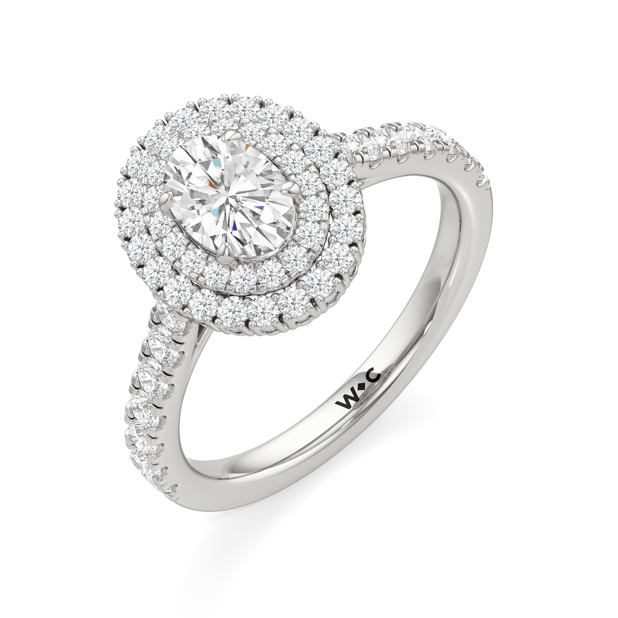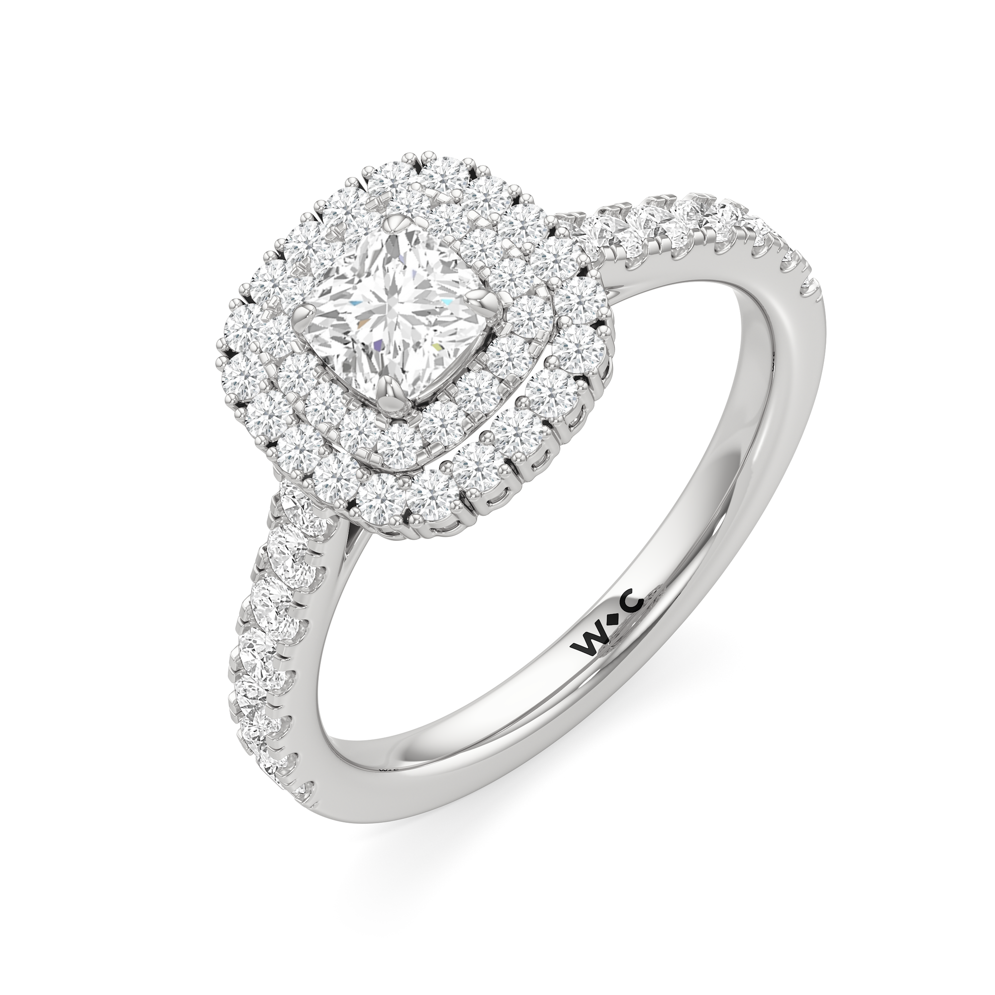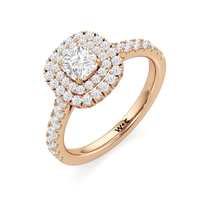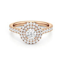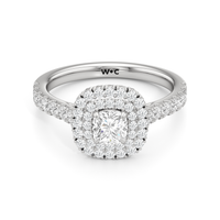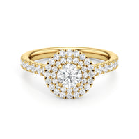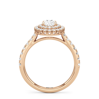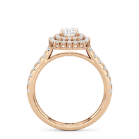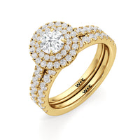 Meet Lottie, a masterfully crafted two-toned engagement ring with an elegantly layered halo. This luxurious symbol of love carries a diamond centre stone framed by double halos. The cathedral shank and its arching shoulders are pave-set with more diamonds, ensuring endless shimmer from all angles. The Lottie Engagement Ring is the piece to pick to symbolise your endless love.