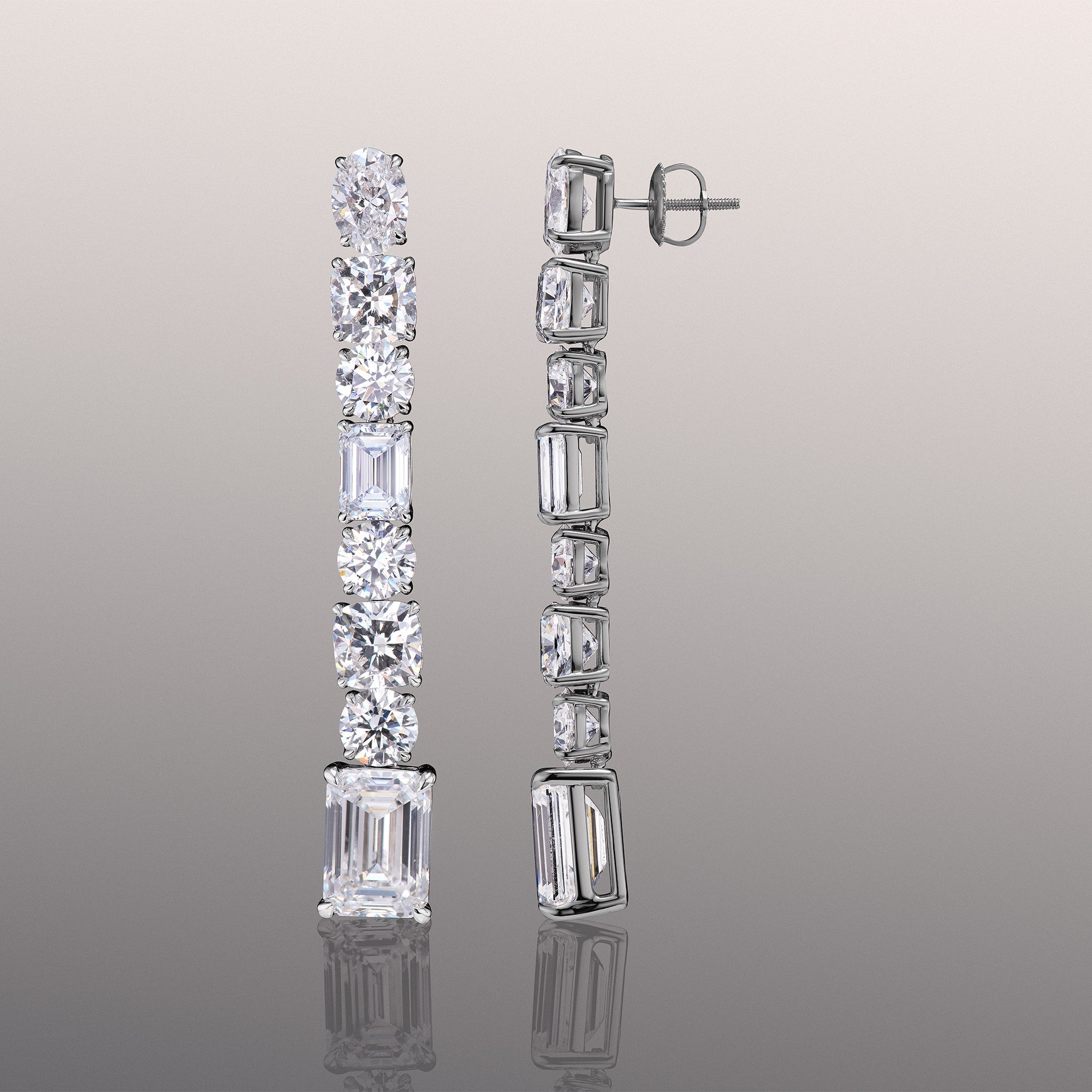 The artistry of these earrings strikes the perfect balance between simplicity and opulence. Each earring boasts a linear design that showcases a combination of round, oval, cushion, and emerald-cut diamonds arranged vertically. At the end of each glittering array is a larger emerald-cut diamond for an absolutely eye-catching finish.