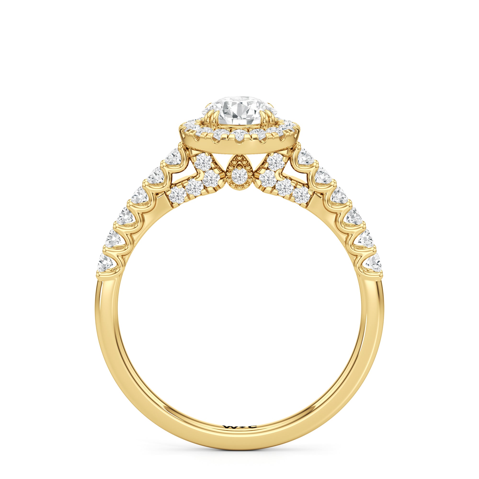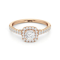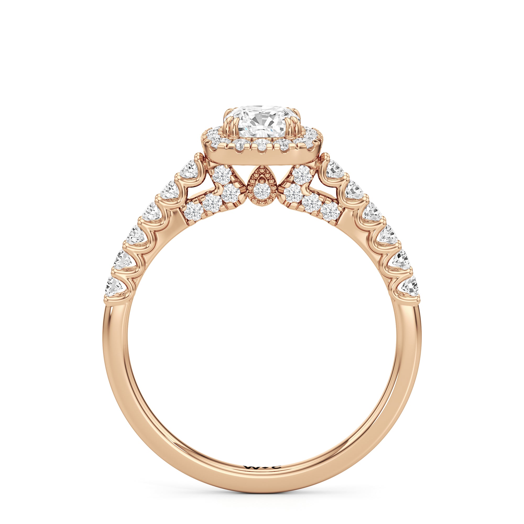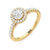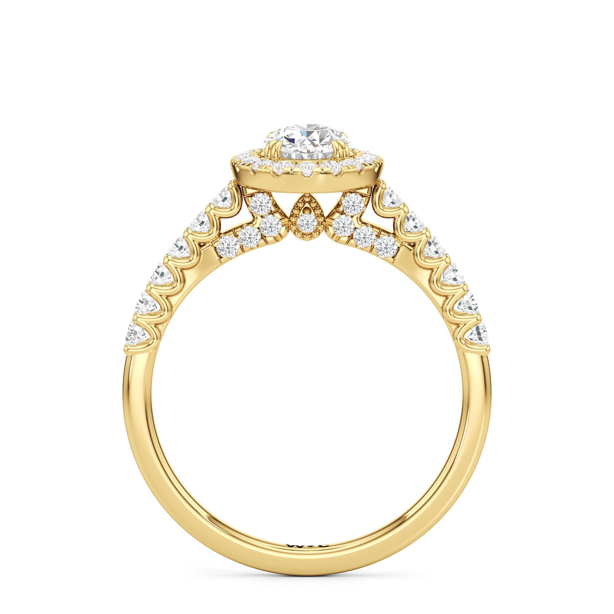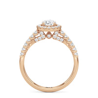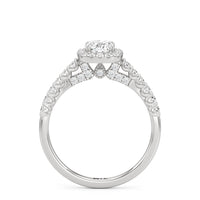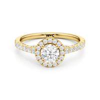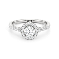 The Lucille Engagement Ring is a stunner of great detail and depth of brilliance. Petite round diamonds cover the ring's scalloped shoulders, lofty head, stylized bridge, and classic halo. The focal point of this enchanting symbol of love is a centre diamond that delivers an outstanding light performance.