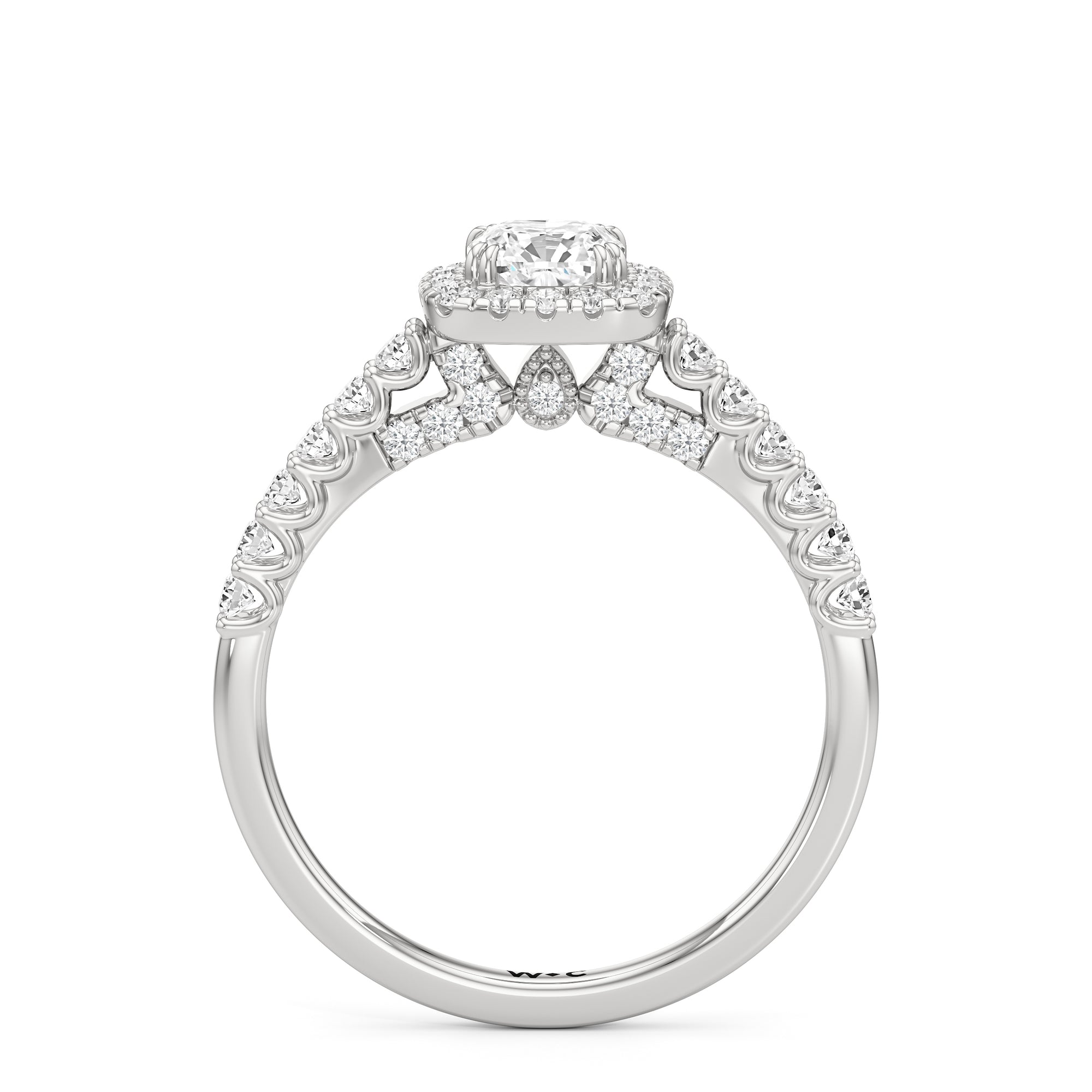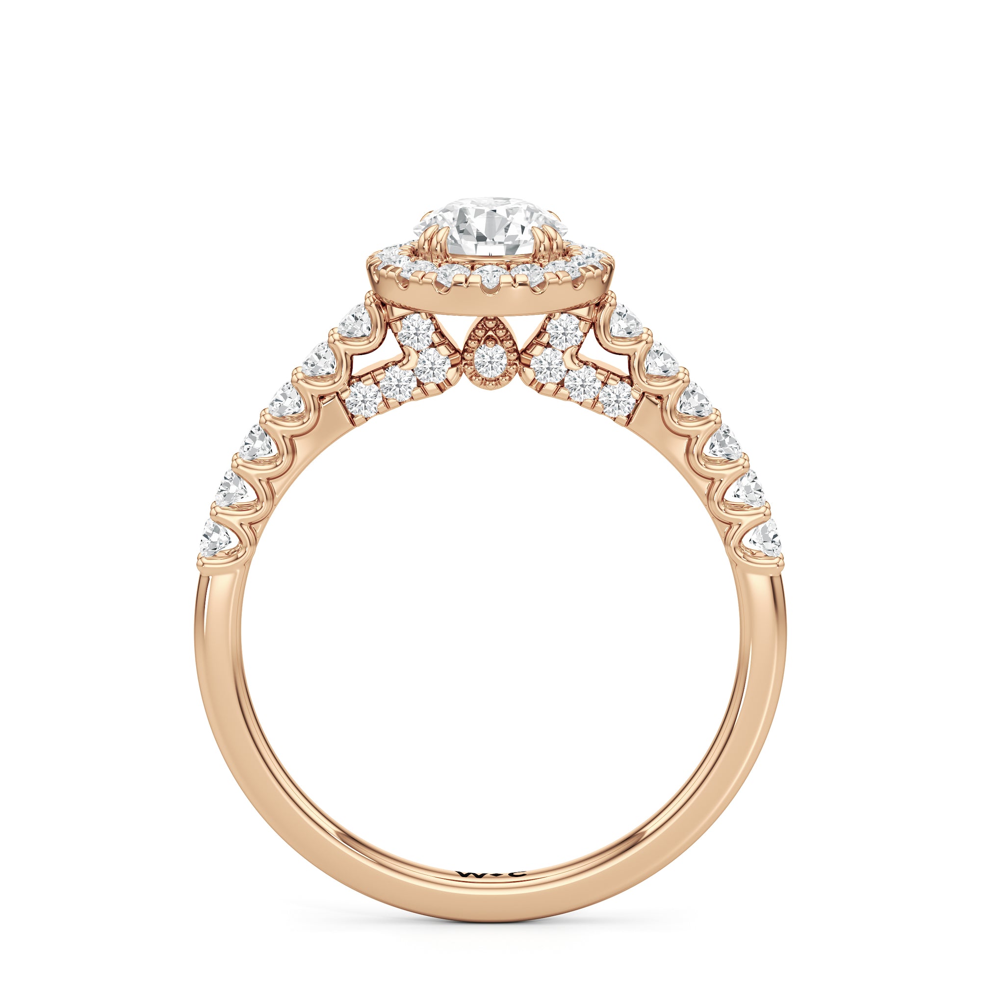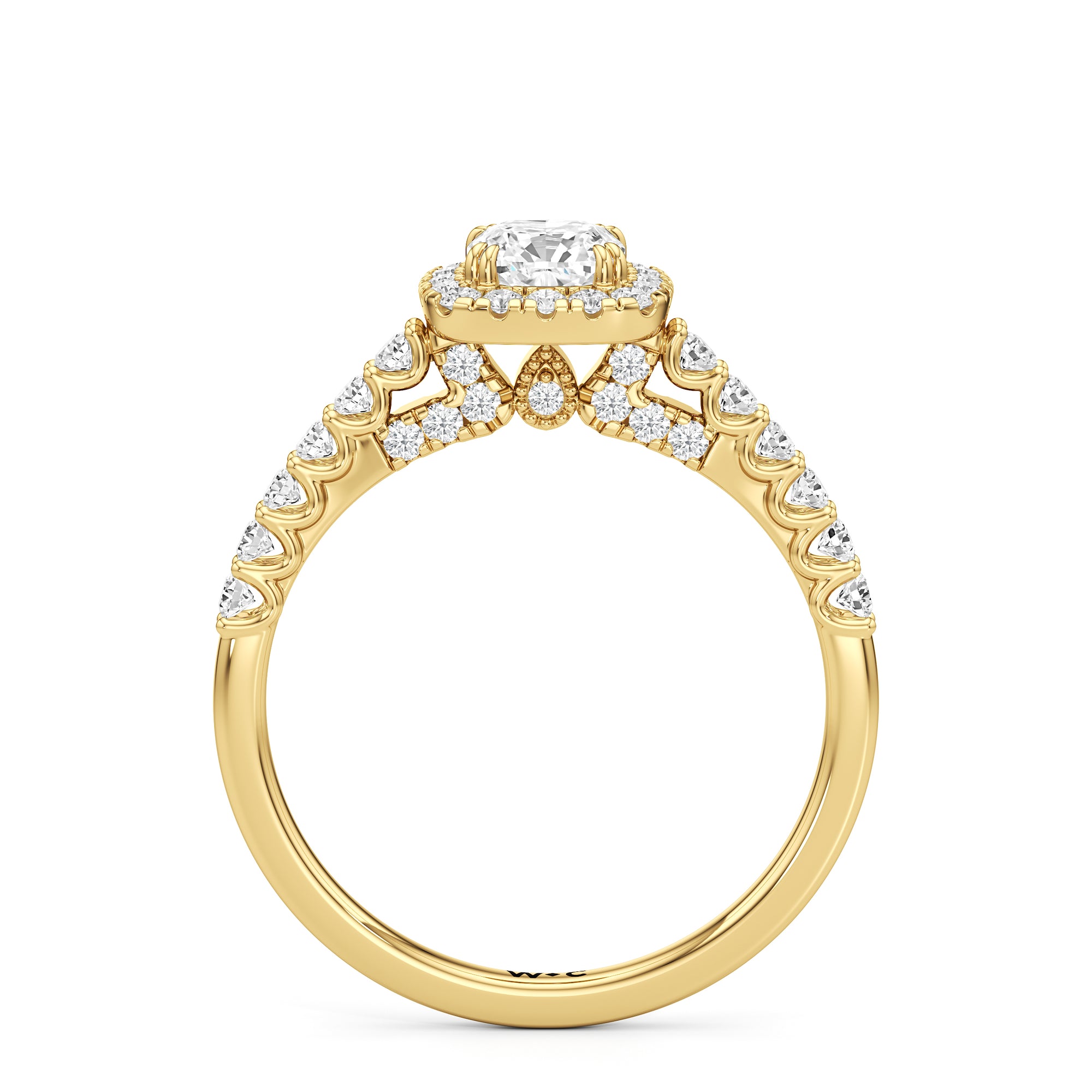 The Lucille Engagement Ring is a stunner of great detail and depth of brilliance. Petite round diamonds cover the ring's scalloped shoulders, lofty head, stylized bridge, and classic halo. The focal point of this enchanting symbol of love is a centre diamond that delivers an outstanding light performance.