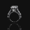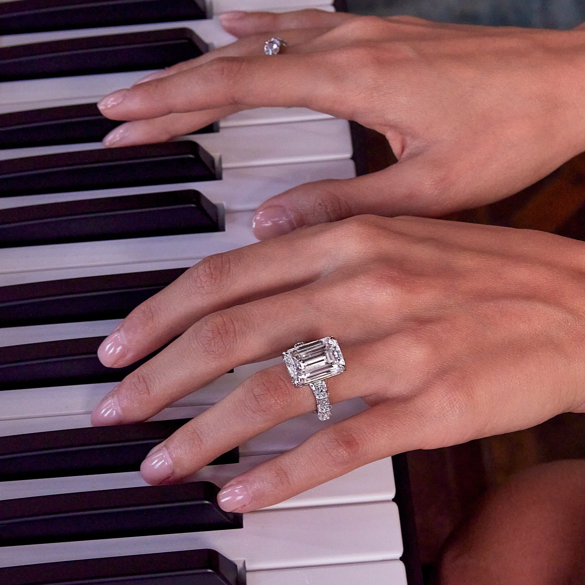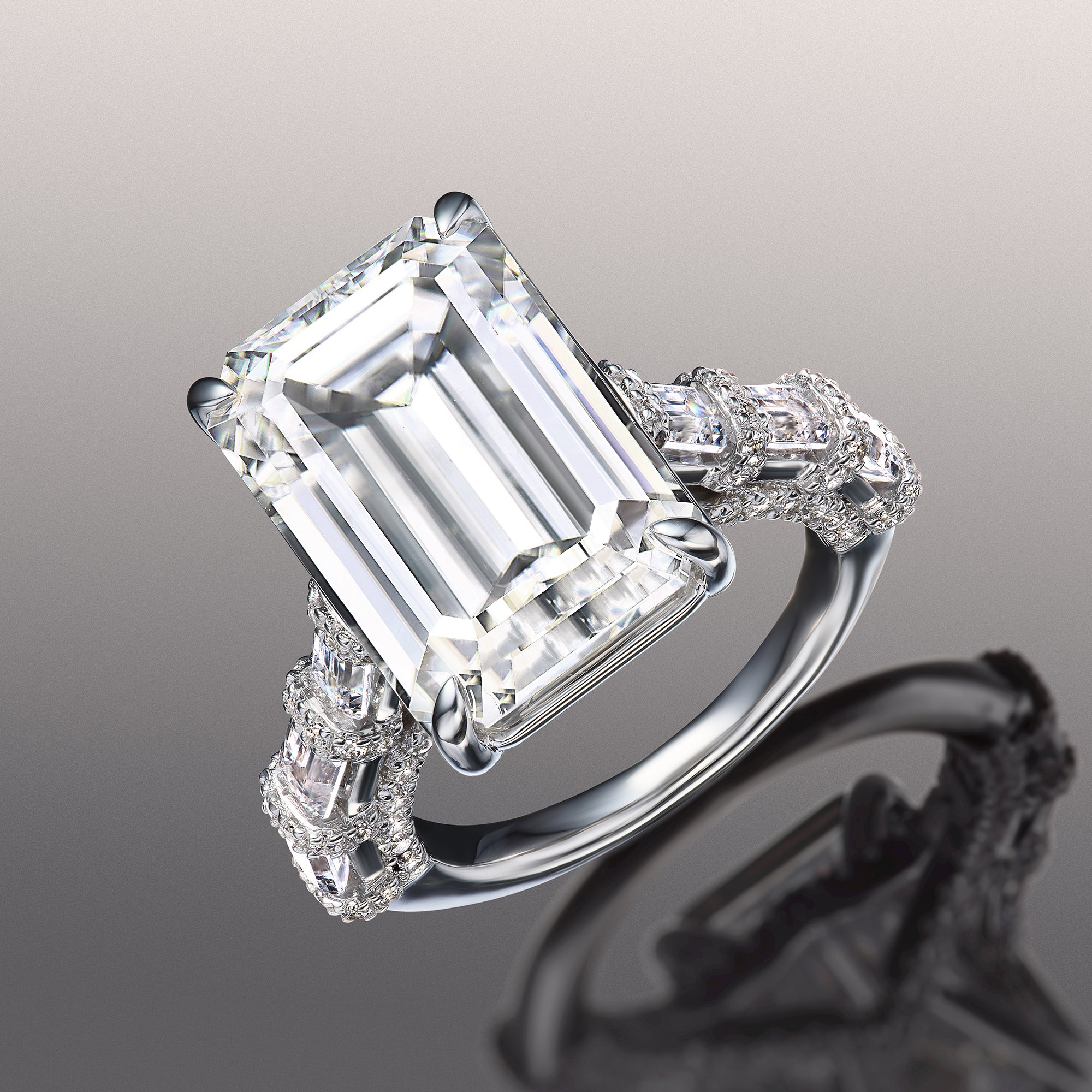 This ring is designed with the spirit of elegance with an air of mystery. It has a highly detailed cathedral shank with arching shoulders traced by emerald-cut diamonds and decorated with collars of round diamonds. A stunning emerald-cut diamond is precisely placed to sit high above the band for a look that will leave your beloved speechless. This diamond center stone is secured by a four-prong setting supported by a diamond-traced, chevron-style bridge.