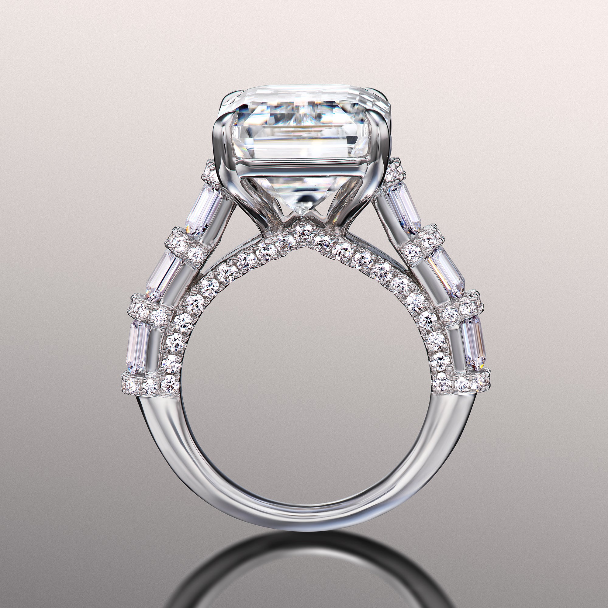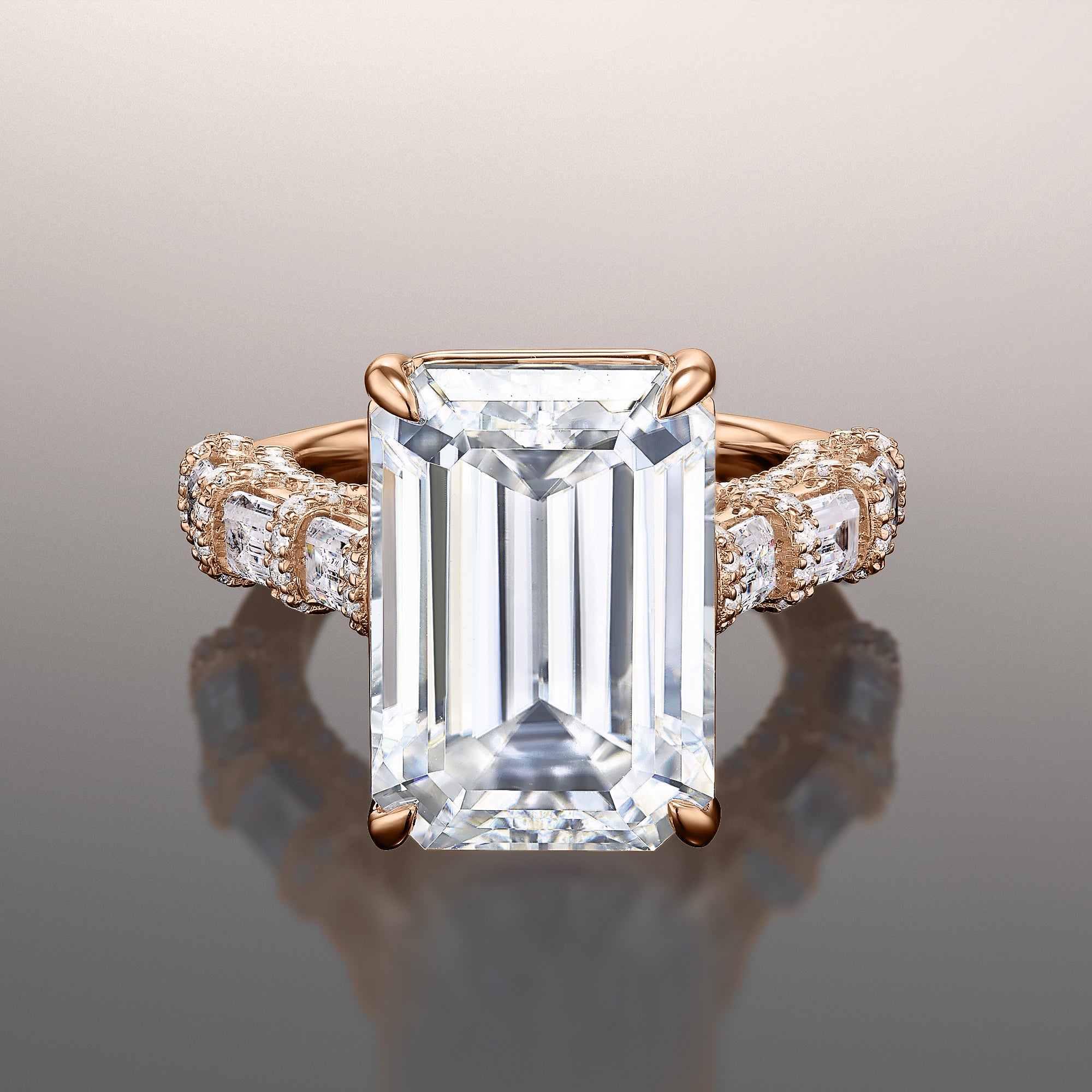 The Magritte ring is designed with the spirit of elegance and an air of mystery. It has a highly detailed cathedral shank with arching shoulders traced by emerald-cut diamonds and decorated with collars of round diamonds. A stunning 15.0 ct emerald-cut diamond is precisely placed to sit high above the band for a look that will leave your beloved speechless. This diamond center stone is secured by a four-prong setting supported by a diamond-traced, chevron-style bridge.