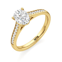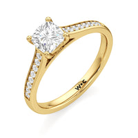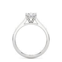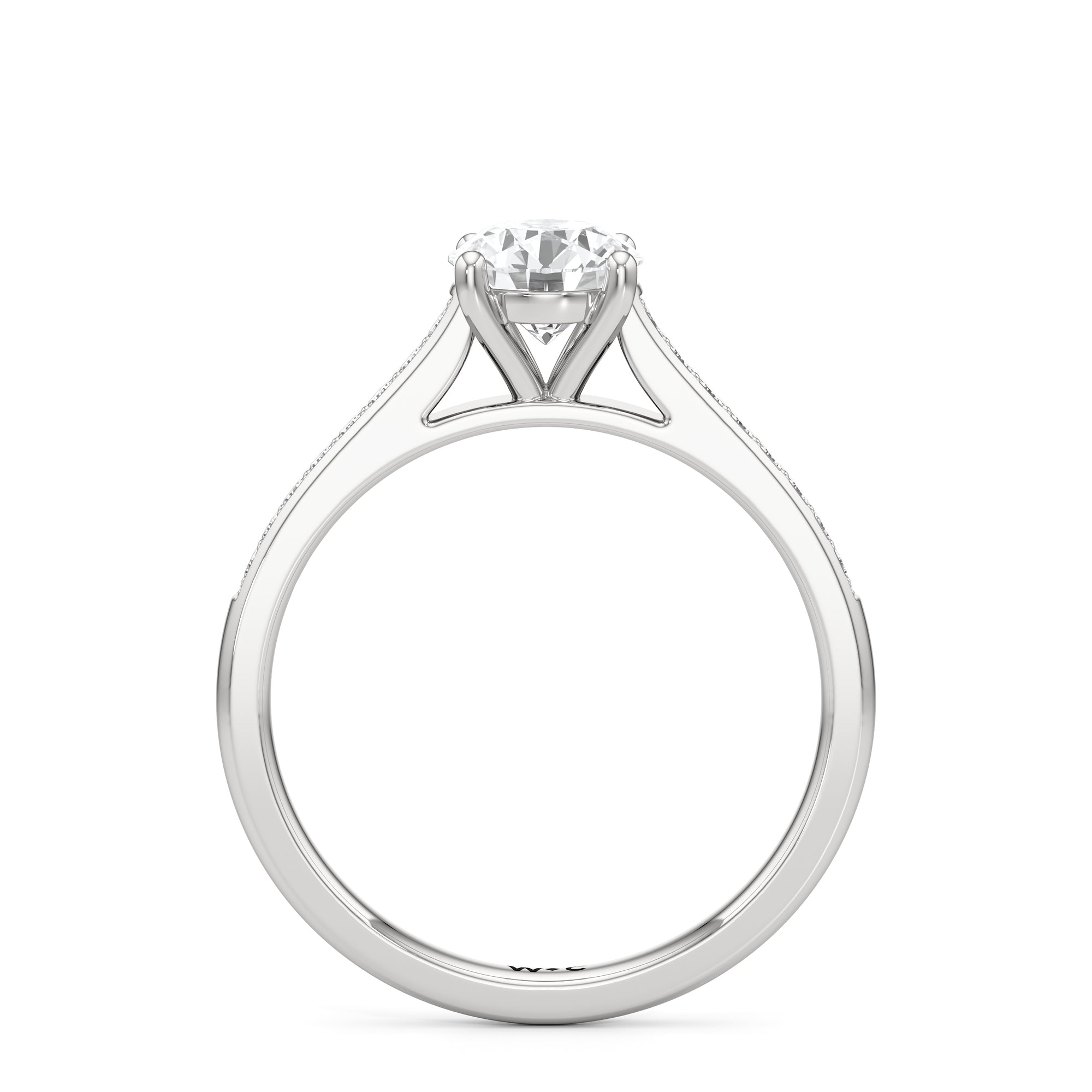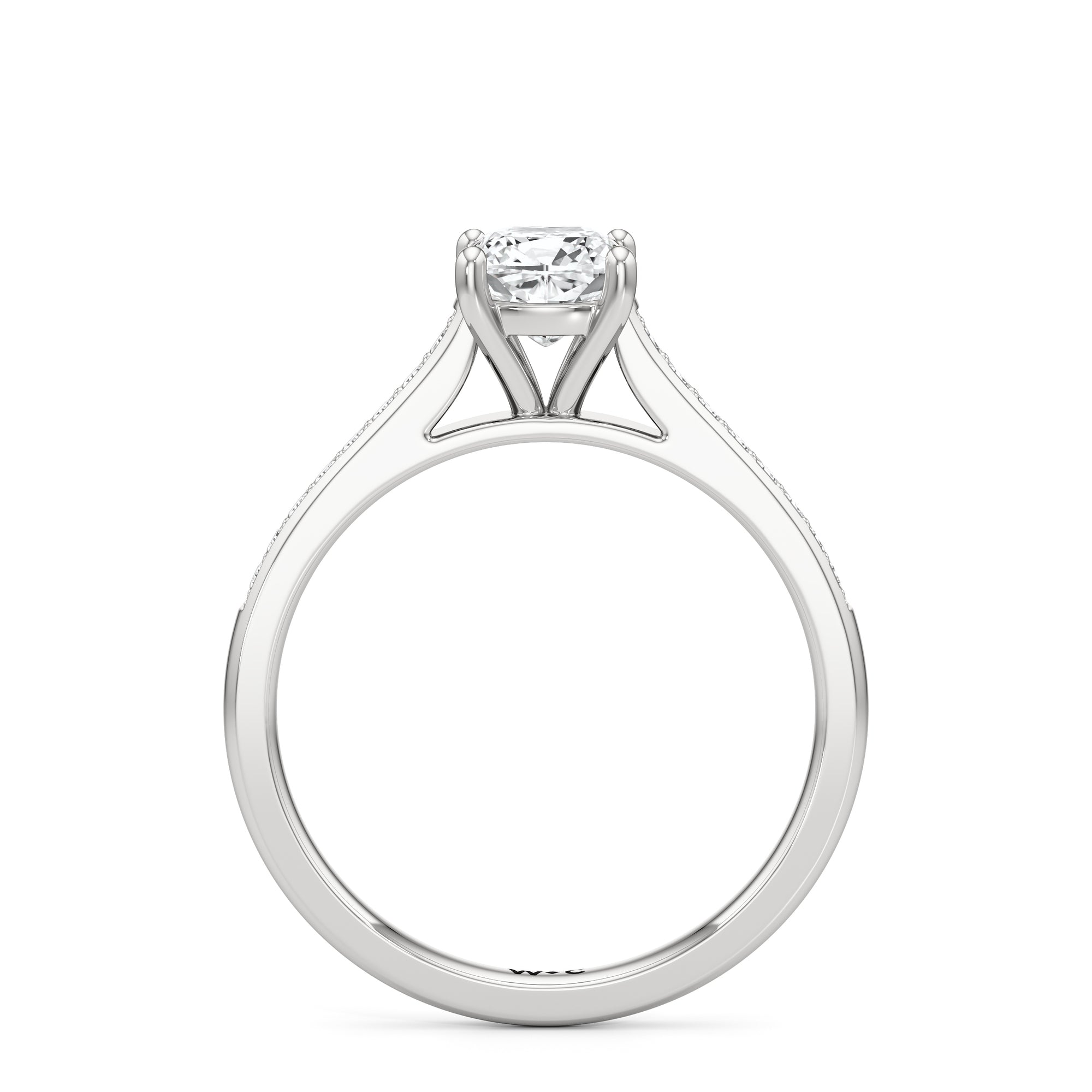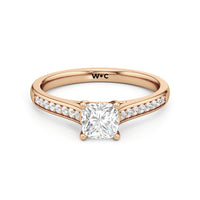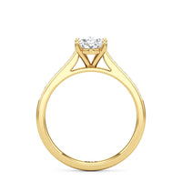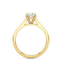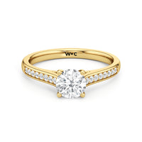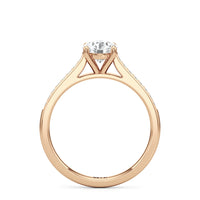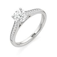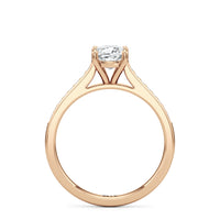 Introducing the Margot Engagement Ring, an undeniable symbol of unfading and unending love and elegance. Designed with a cathedral shank with graceful shoulders traced by a striking row of diamonds. The classic pavé band directs attention to the magnificent centre stone, which is cradled by a four-prong setting.