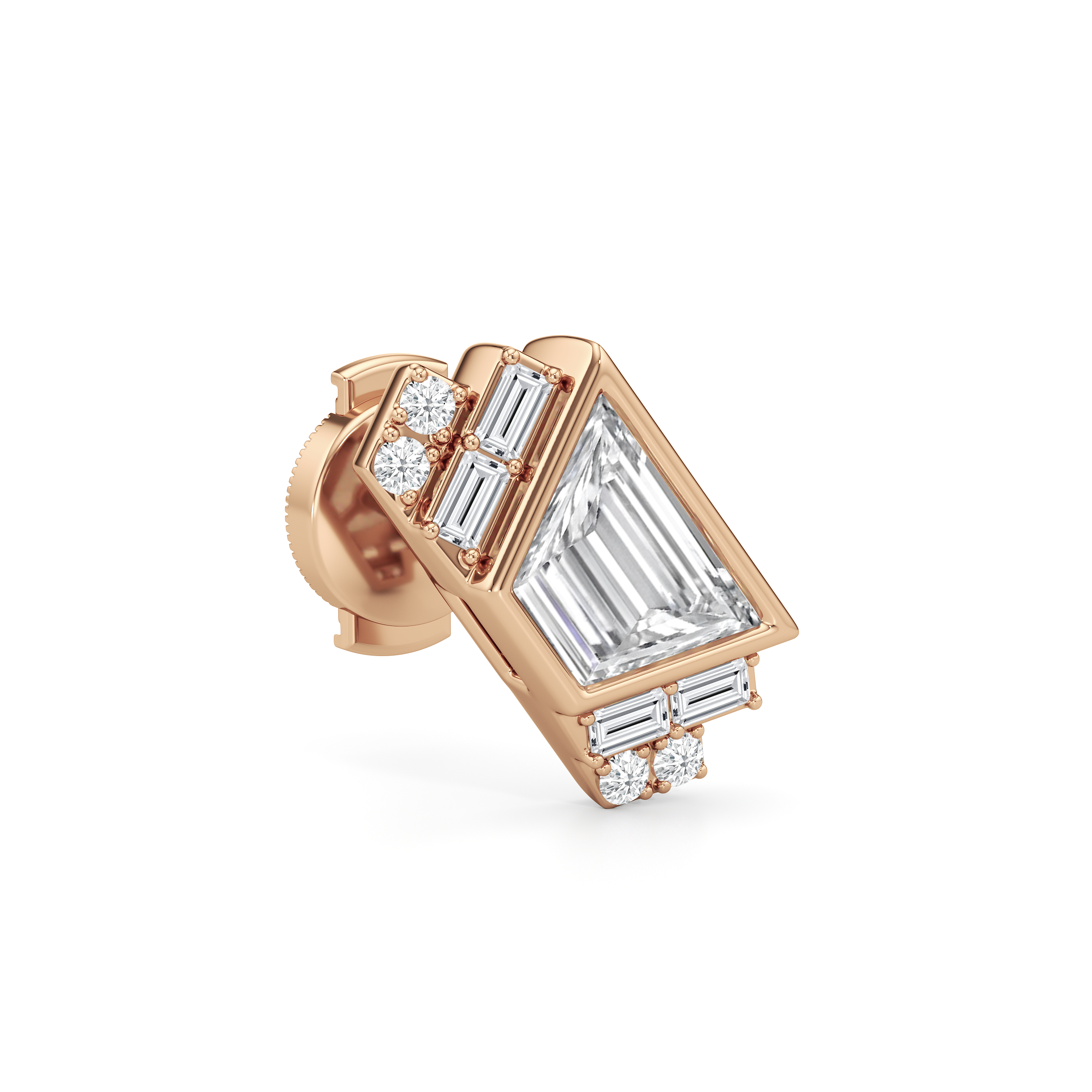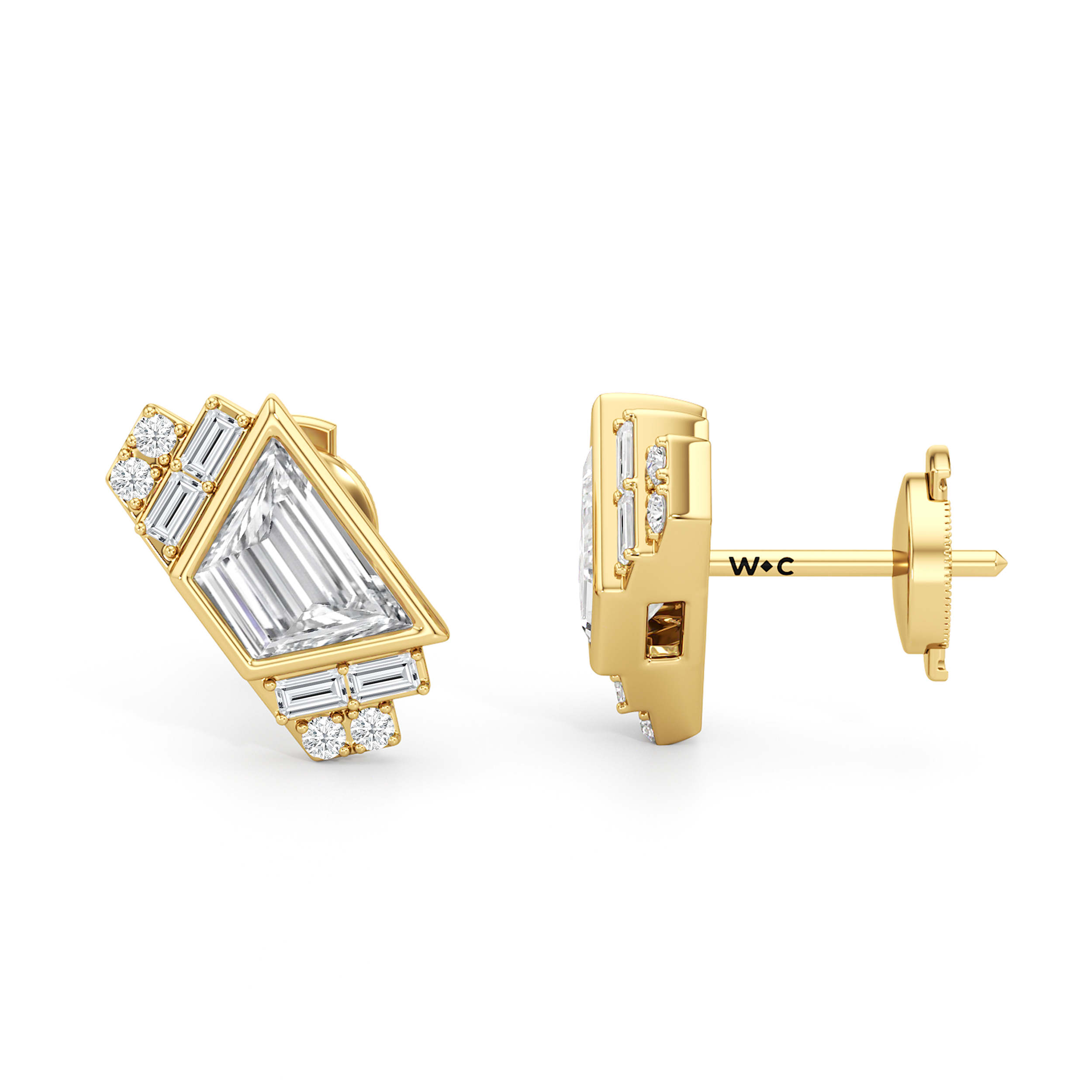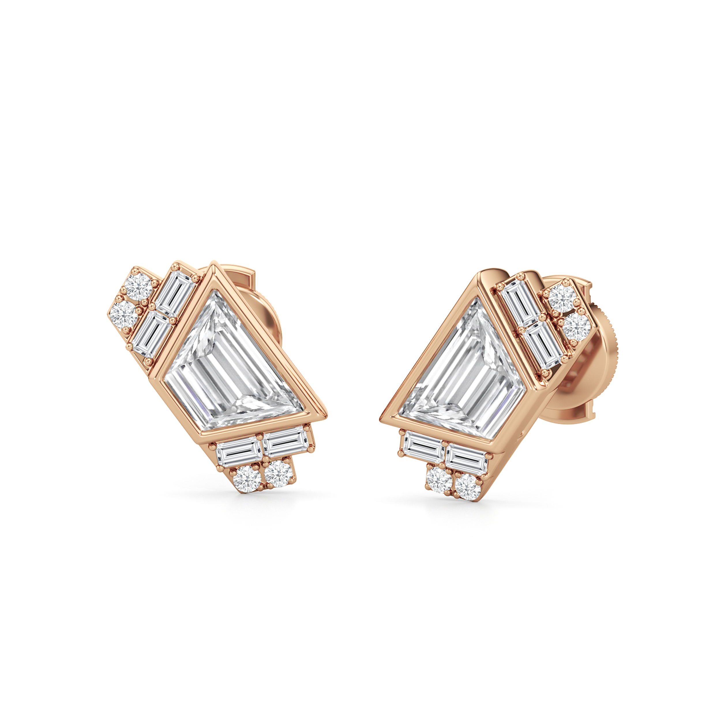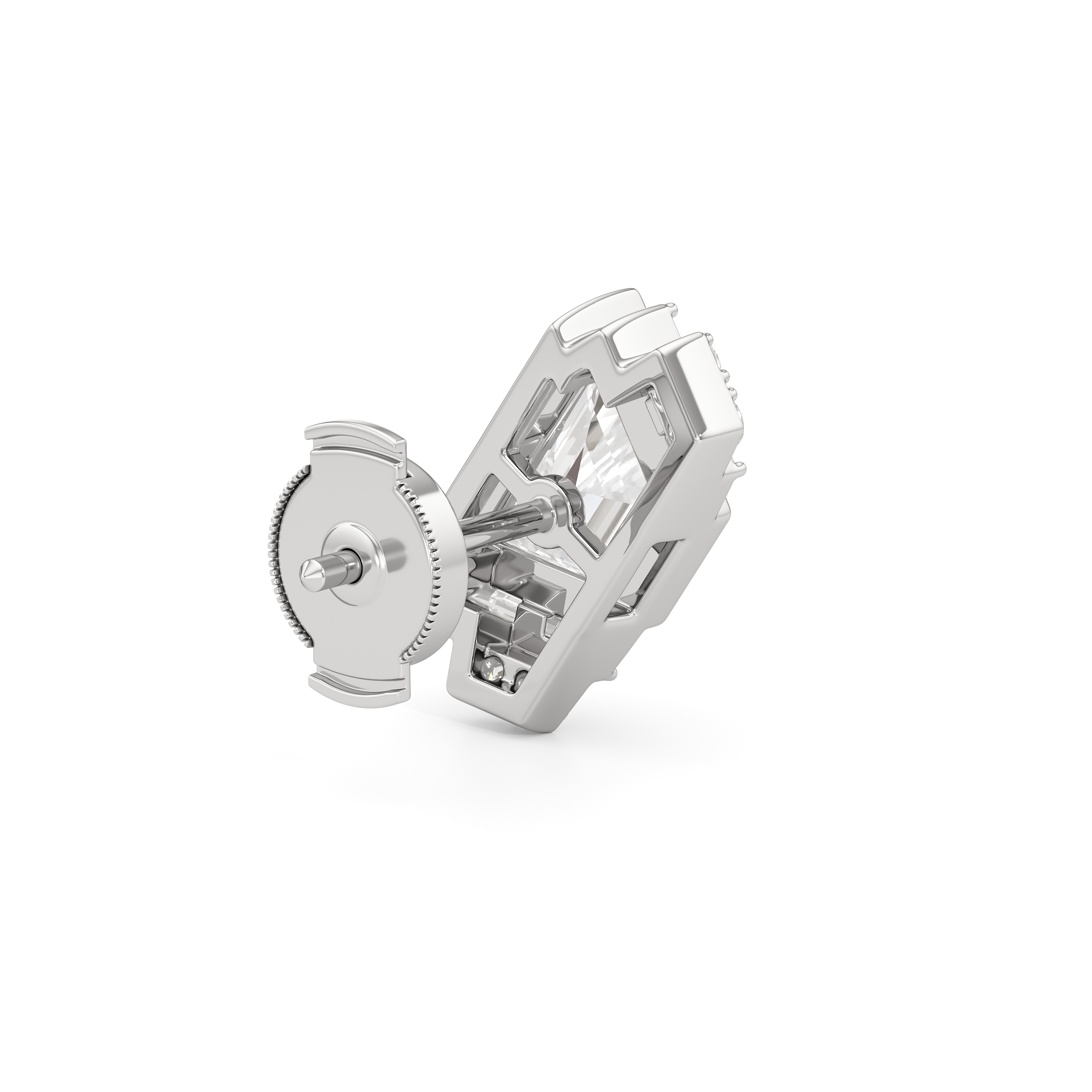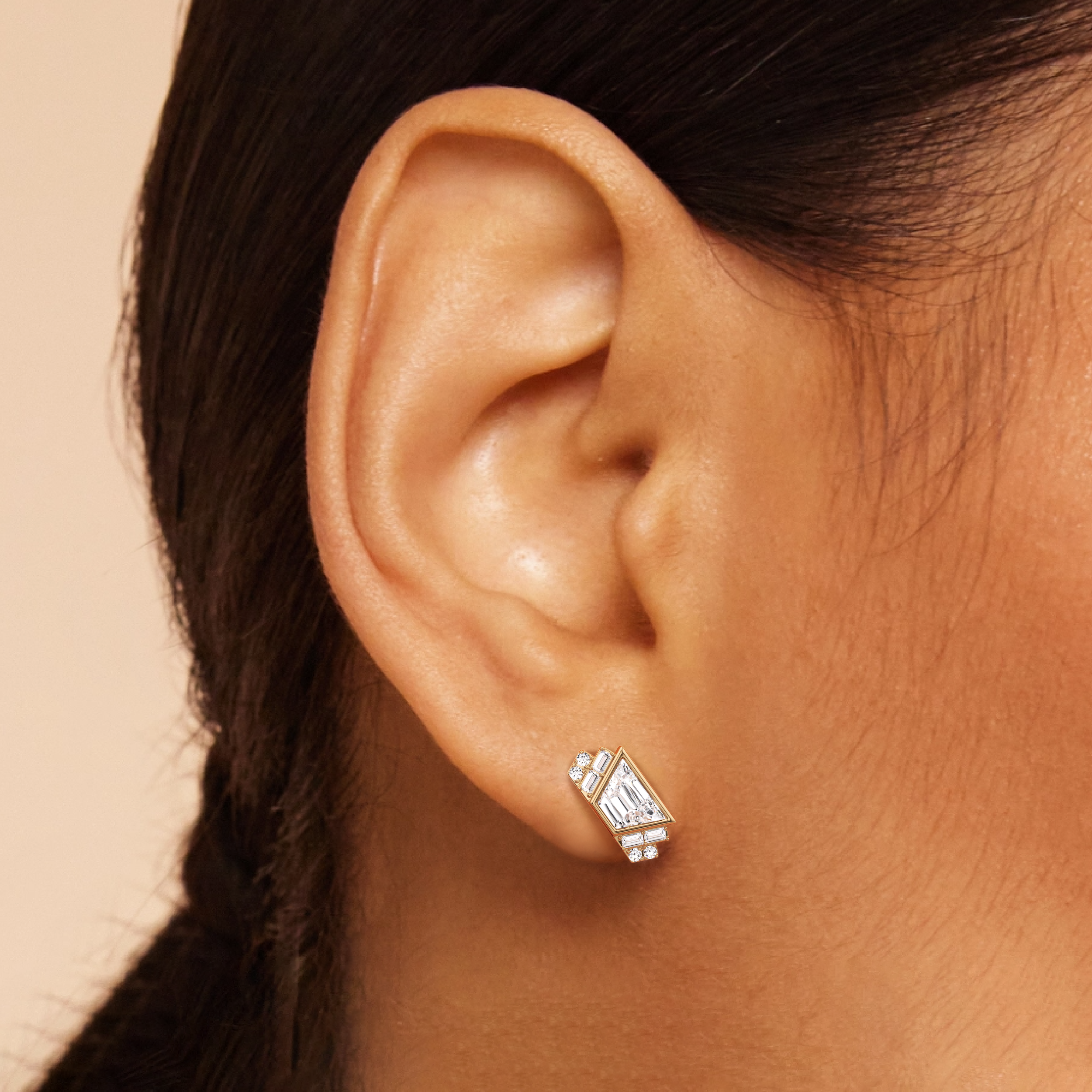 These luxurious stud earrings take their cue from the famed Art Deco styling of New York's Radio City Music Hall. Designed with a stepped silhouette, they mirror the layered architecture and dynamic symmetry found in the venue's daring interiors. At the heart of each earring is a distinct trapezoid-cut stone on bezel setting, its angular form brings to mind the geometric motifs that define the Deco period. The stepped design, finished with duos of baguette and round diamonds, adds drama and depth that perfectly captures the glamour and grandeur of both the performance venue and of the Jazz Age.