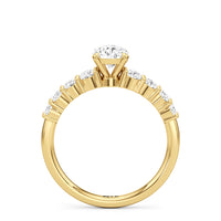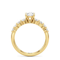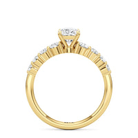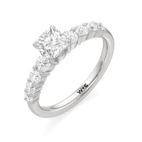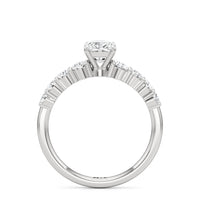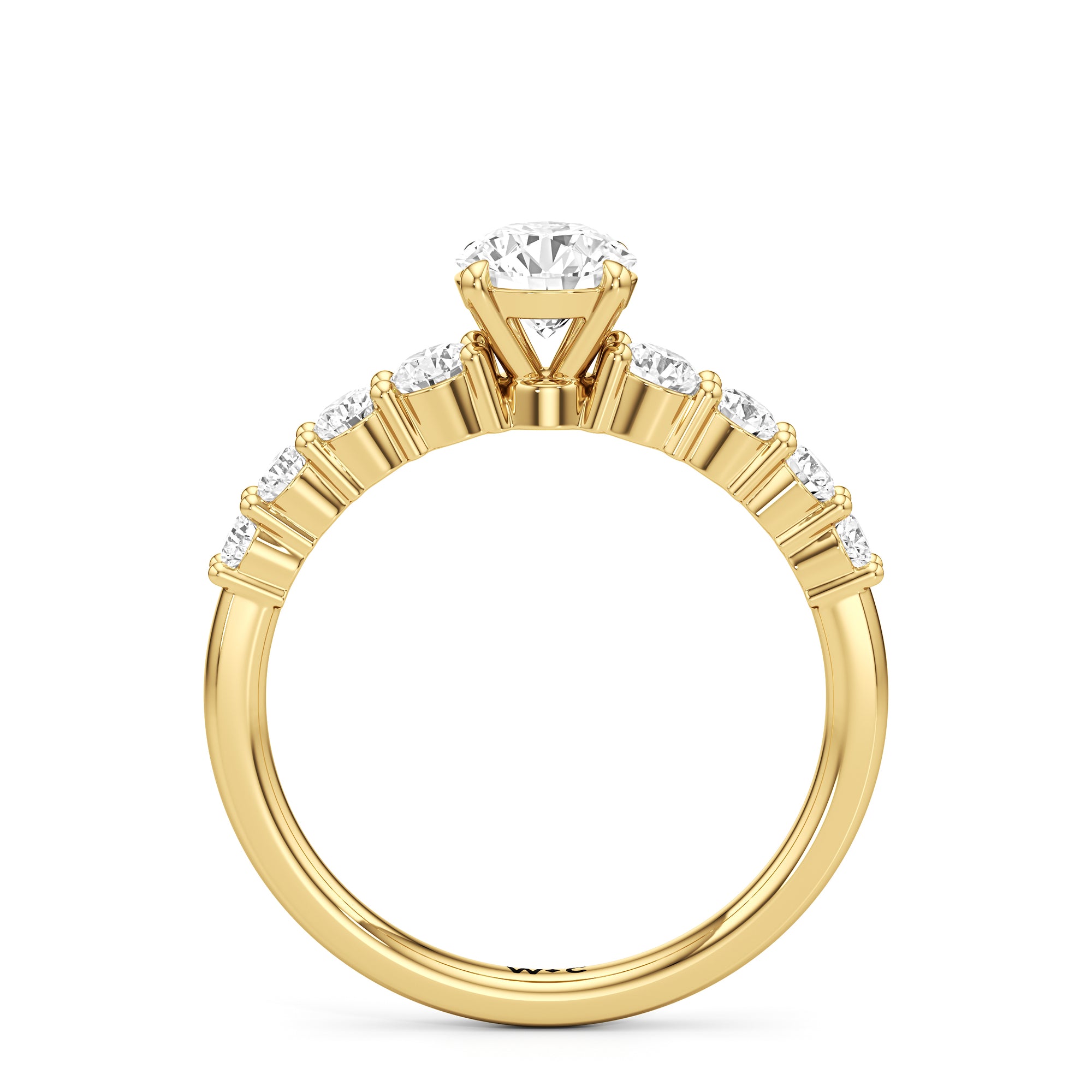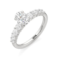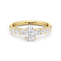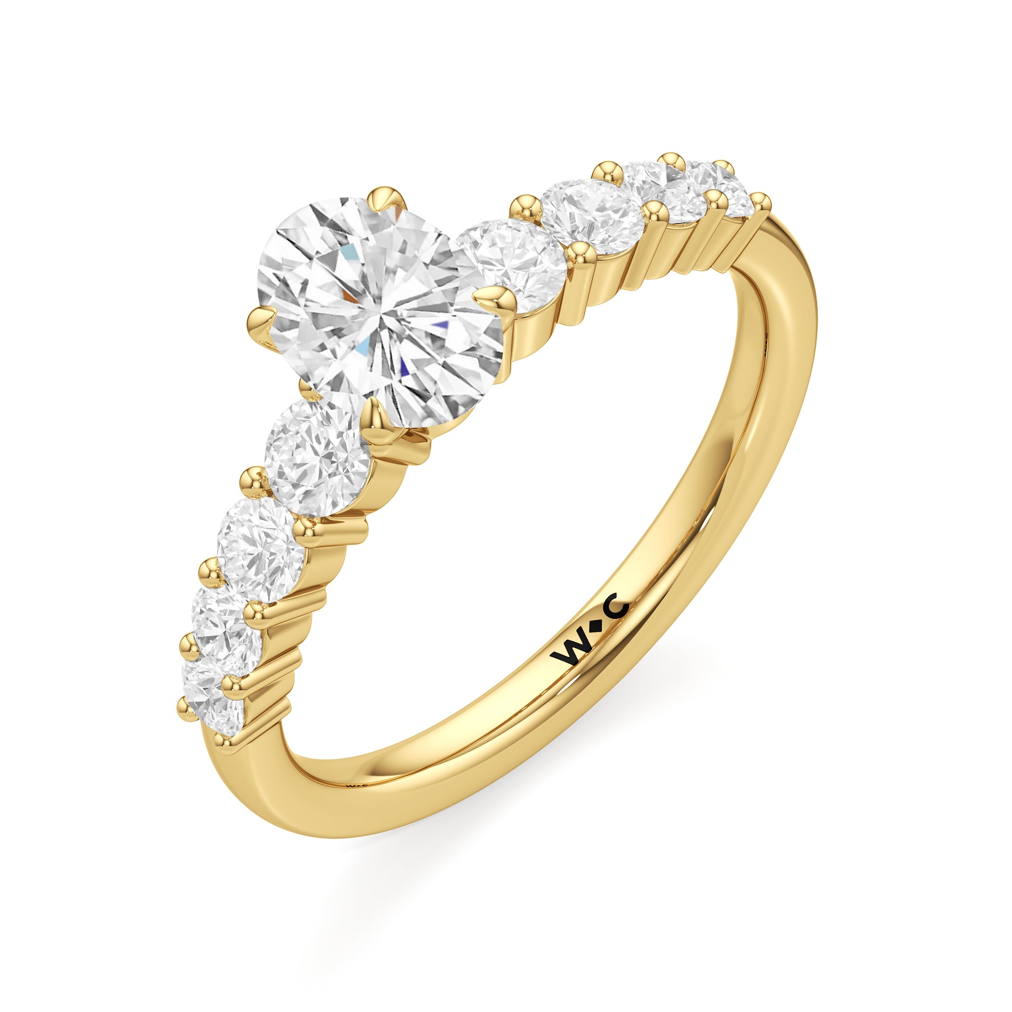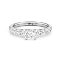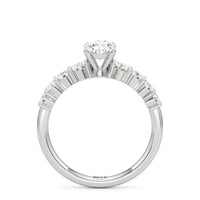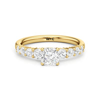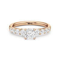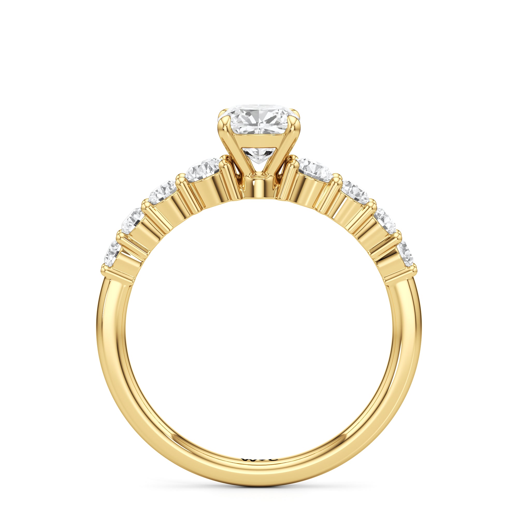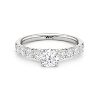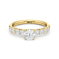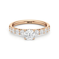The Matilda Engagement Ring is simplu mesmerizing. The band holds nine round diamonds, all ready to play with light. Eight of the nine diamonds taper in size as they line the top half of the band. They are set on shared prongs, allowing more light to enter and reflect off the precious stones. Positioned top and center is a prominent diamond centre stone held by claw prongs.