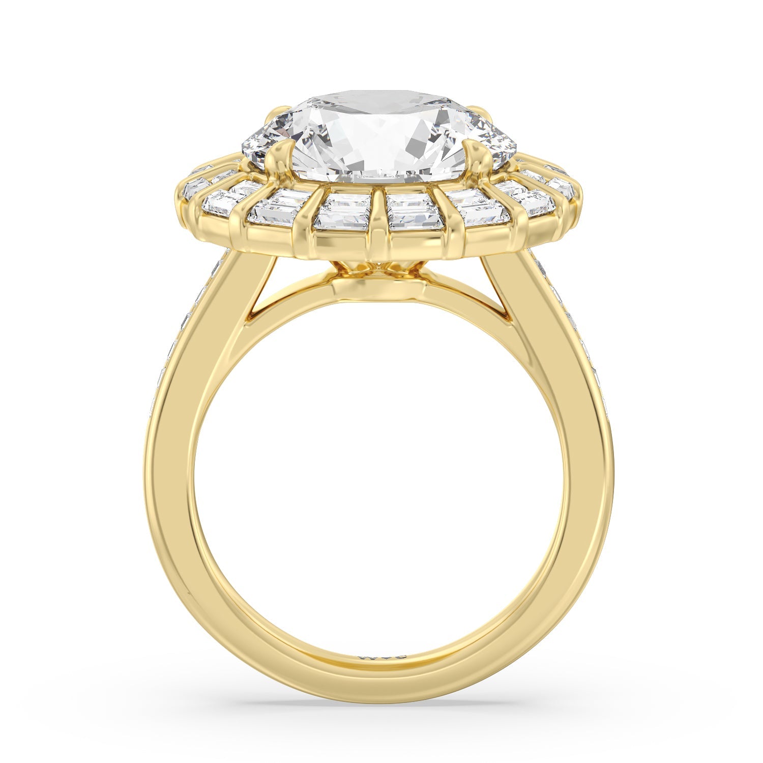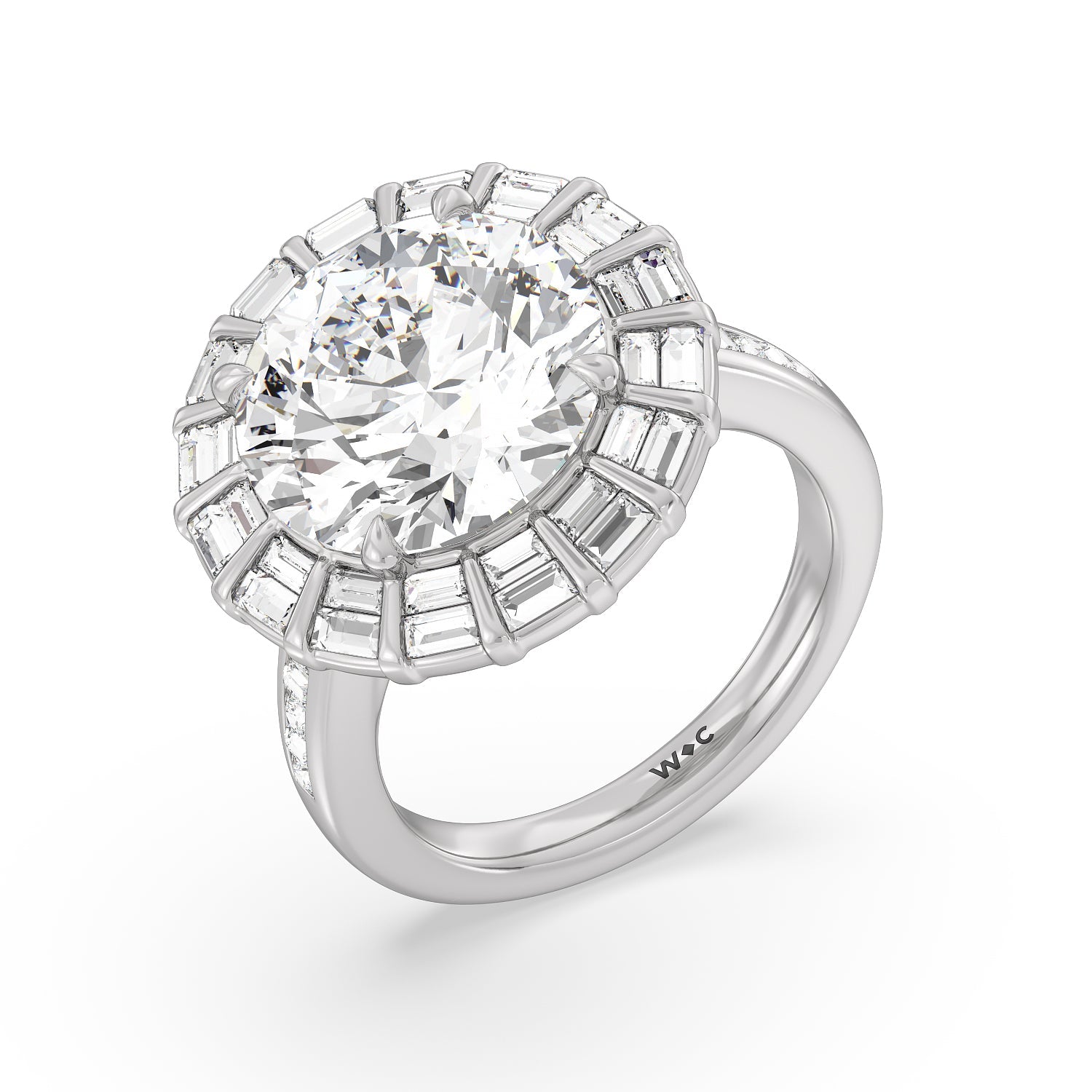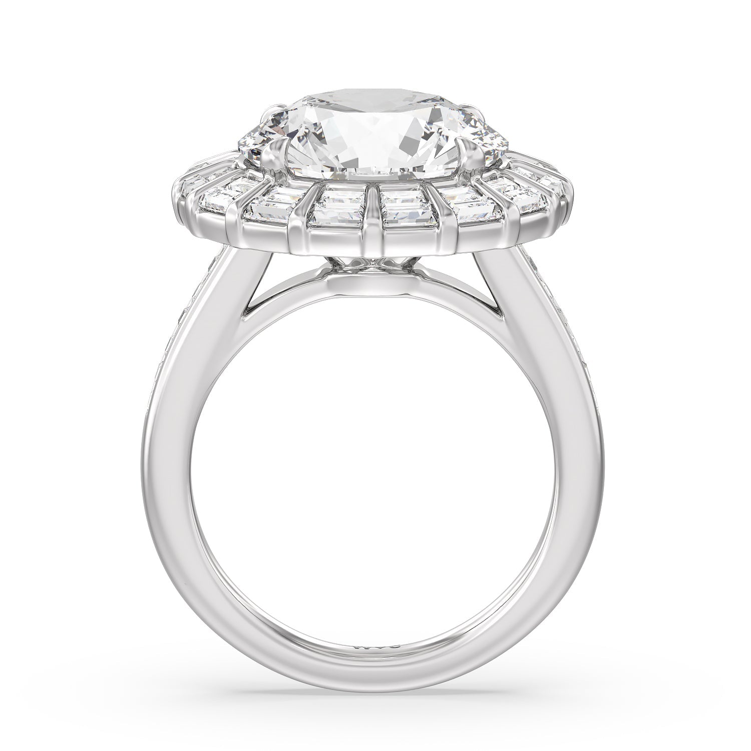 Truly bold, this ring has pushed the boundaries of jewelry making. Uncover its expressive composition featuring controlled lines and creative use of patterns. This ring is embraced by a cathedral shank with sparkling shoulders channel-set with alternating round and baguette diamonds. A magnificent 8.0 ct round diamond remains the focal point, framed by evenly arranged baguette diamonds in a channel-bar halo setting.