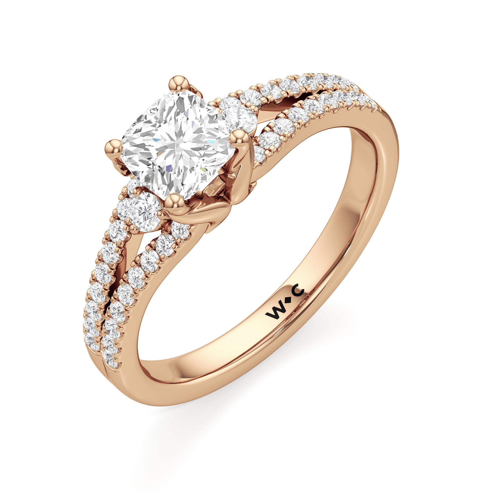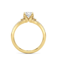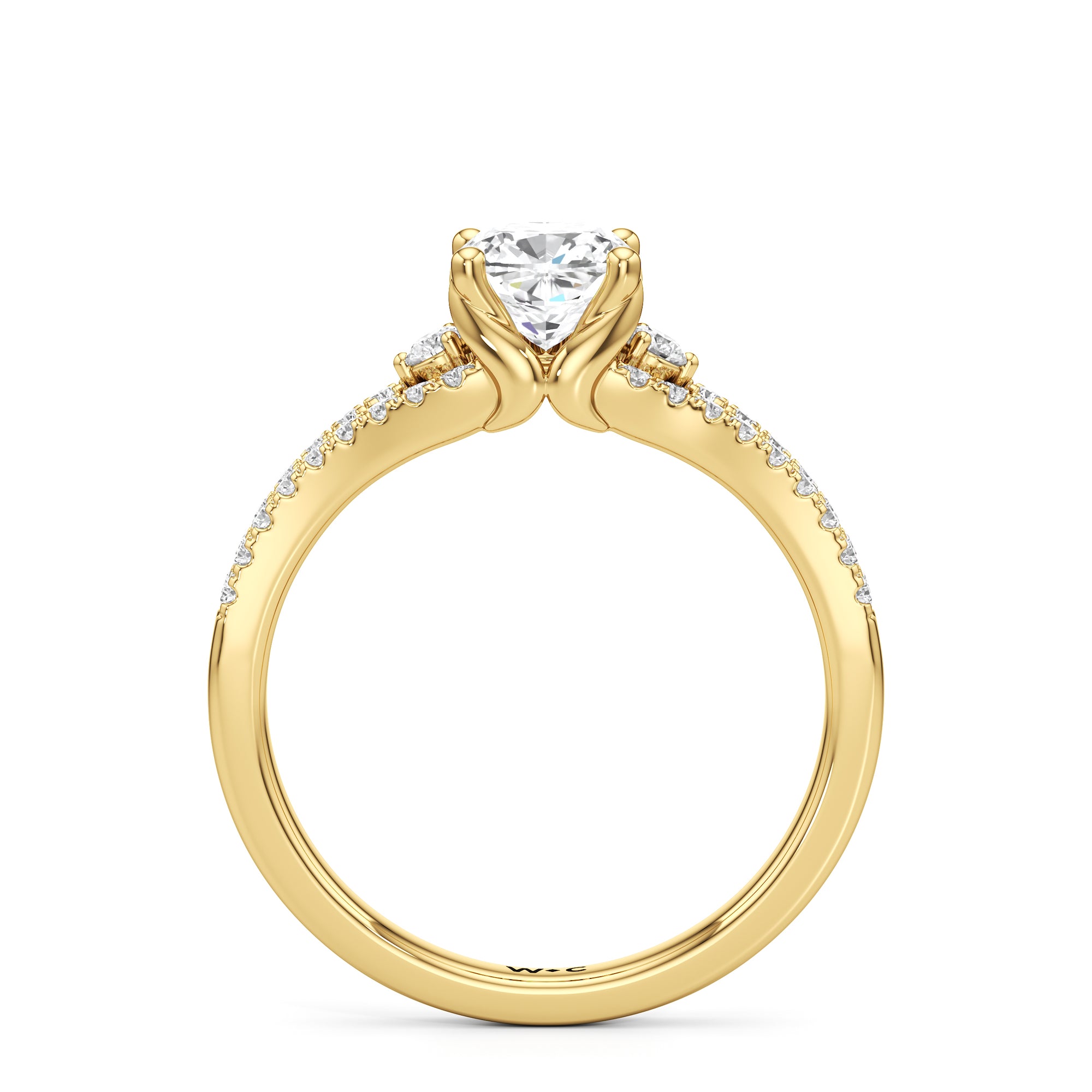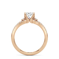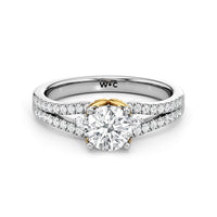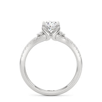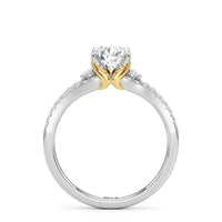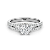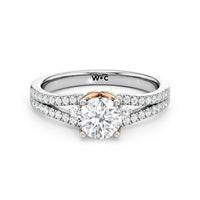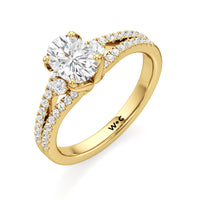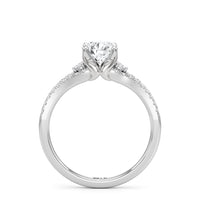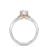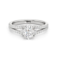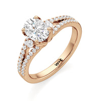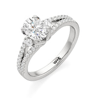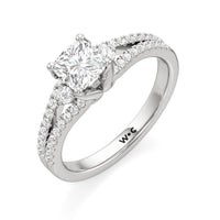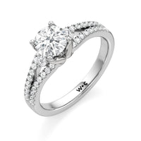 An artful engagement ring detailed with a hidden element. This diamond ring is designed with a diamond-studded split shank that holds a centre stone. The focal gem is mounted on a secure four-prong setting and is further supported by a swirled metalwork accent on the gallery. Subtly flanking the central gem is a duo of round diamonds.