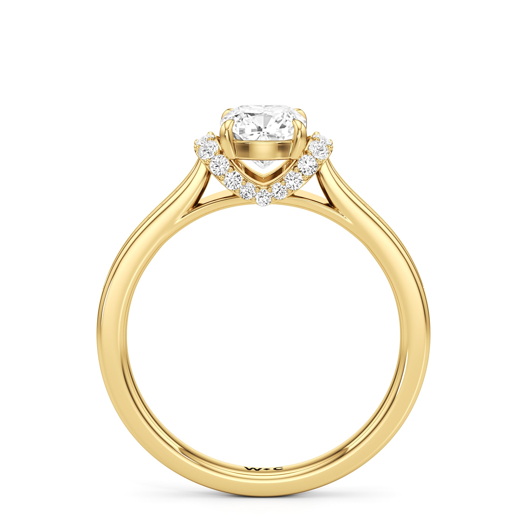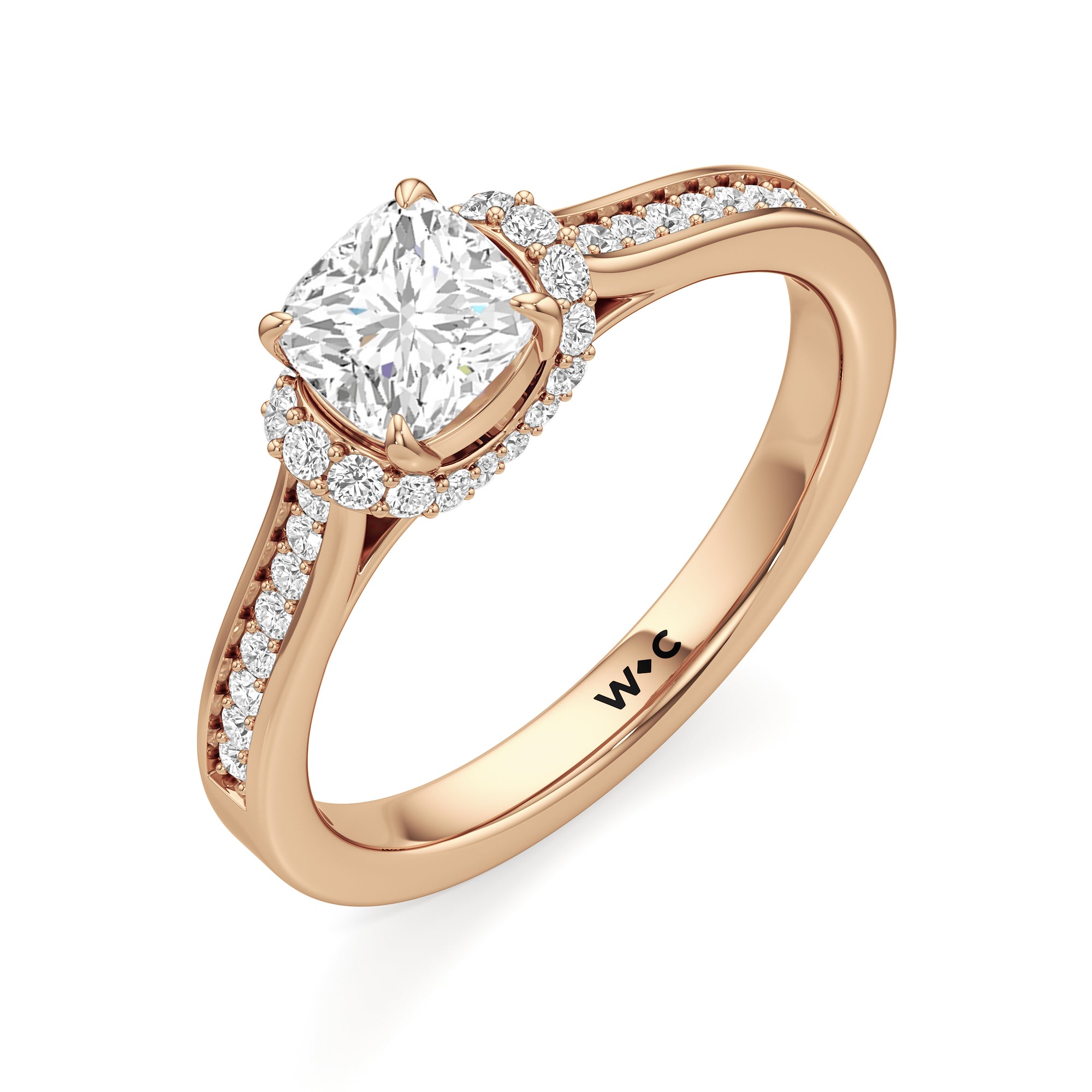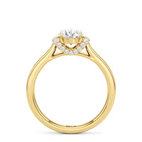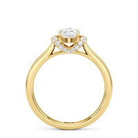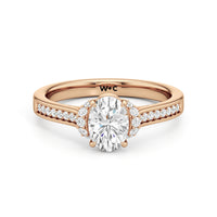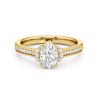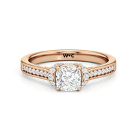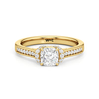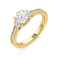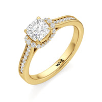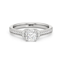 The Maya Engagement Ring is designed with contemporary artistry. Its style combines sass and sophistication effortlessly, as seen on its diamond-studded band decorated with a centre stone that is framed by a distinctive shoulder cuff. The unique shoulder cuff stylishly combines the beguiling brilliance of a halo with the refinement of a cathedral shank's diamond-traced shoulders. This uncommon design creates a decorative structure that frames the prong-set centre diamond from below, doubling its charm and enhancing its appeal.