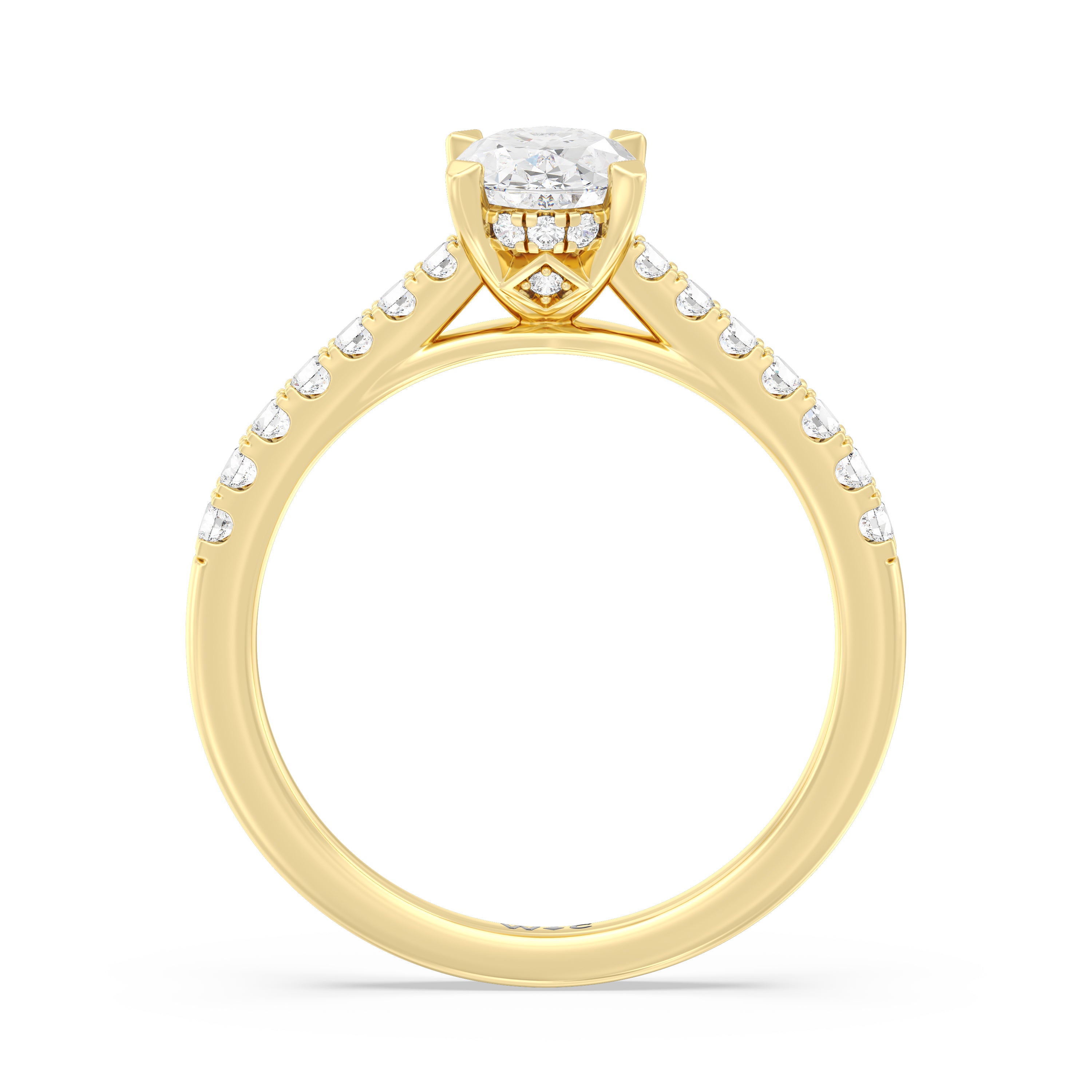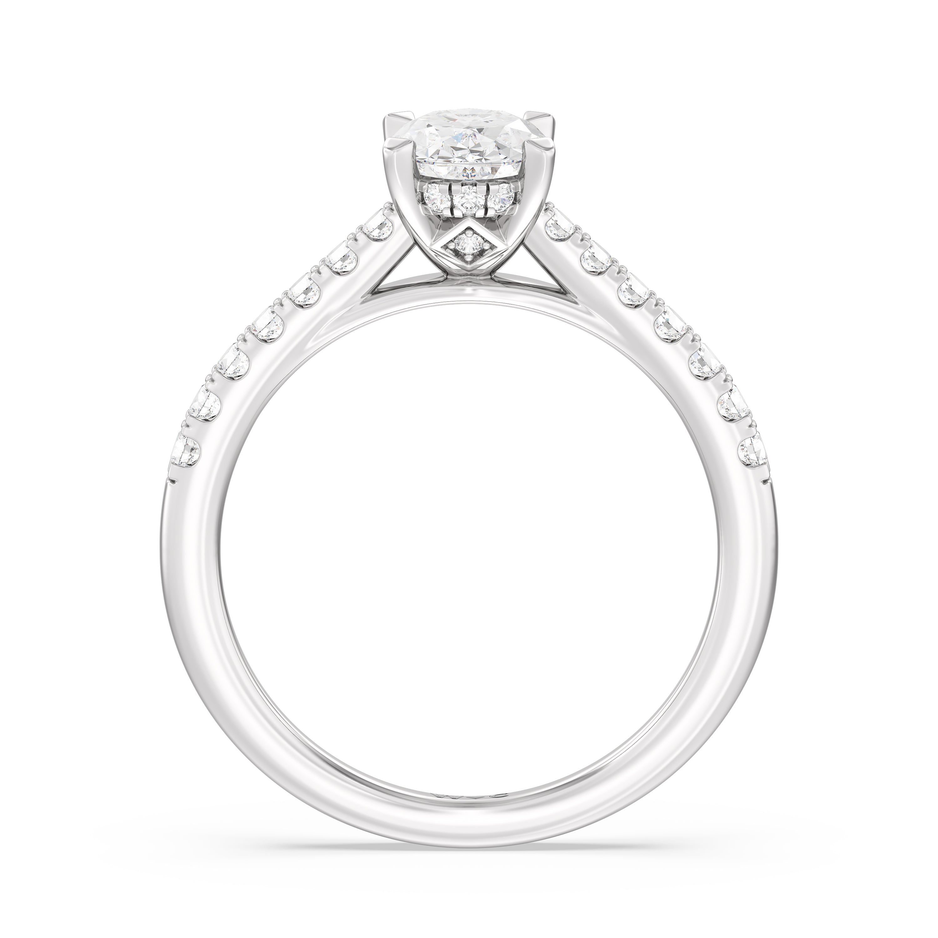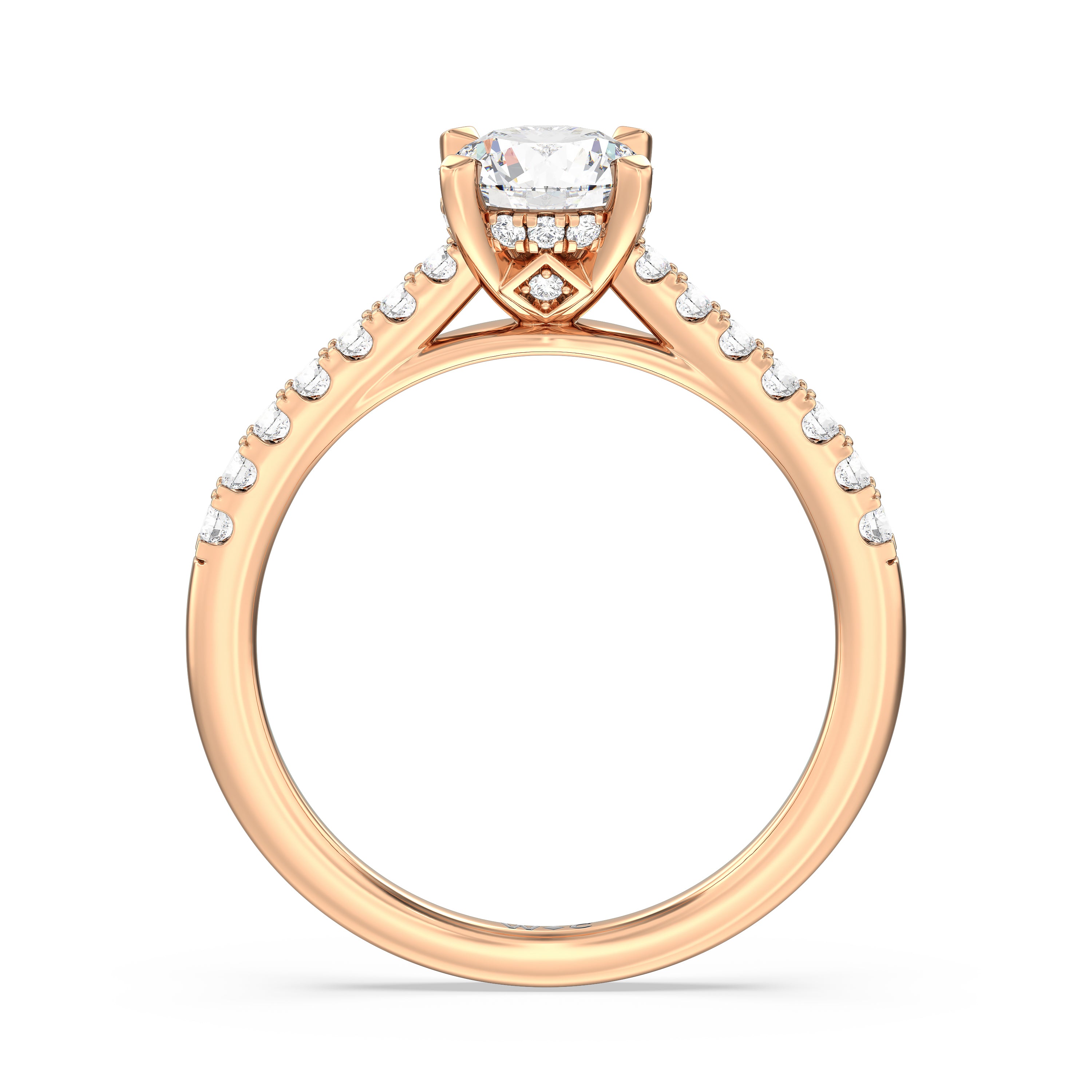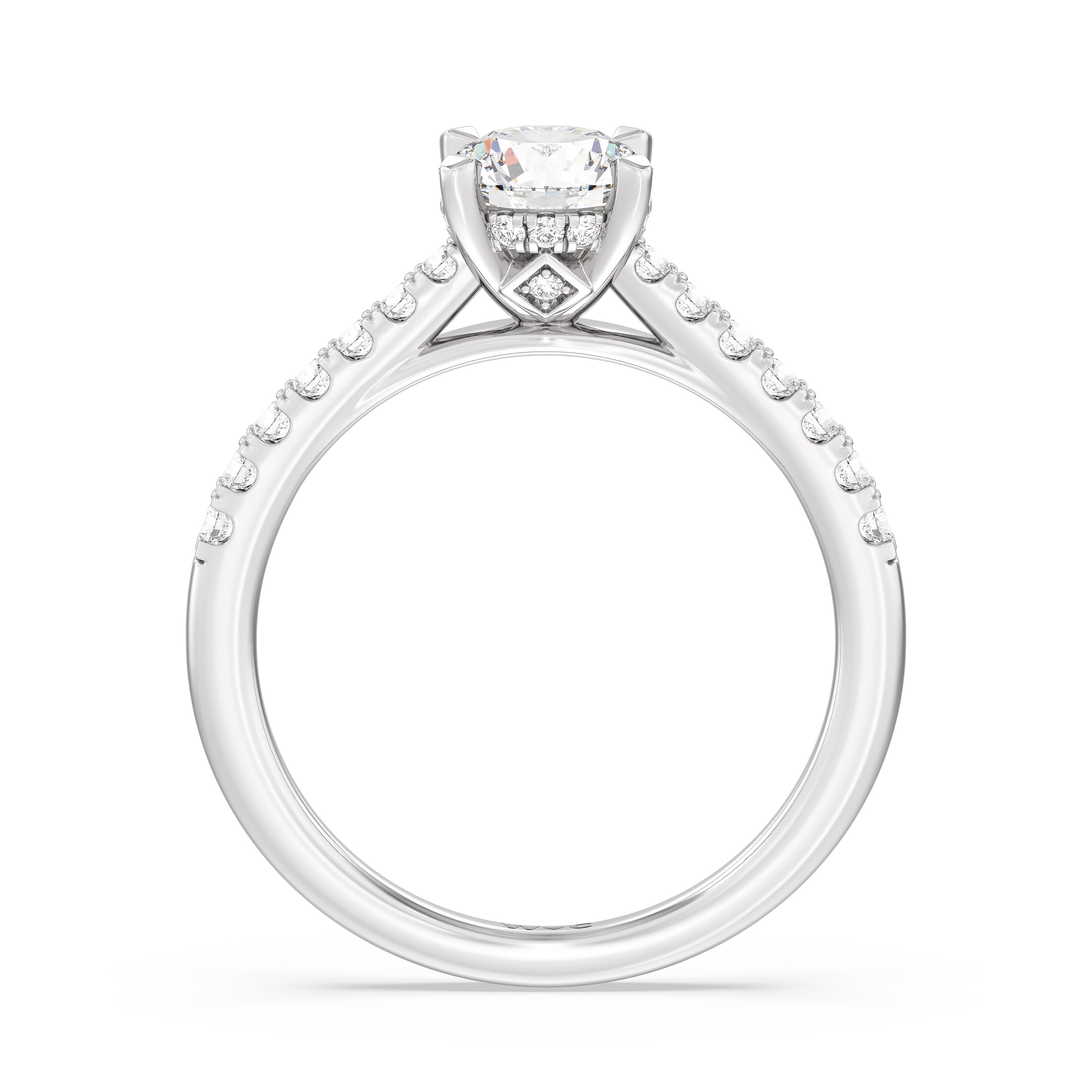 The Melody Engagement Ring impresses with its diamond centre that offers a high level of brilliance and fire. The focal gem is mounted on split prongs on a diamond-studded cathedral shank. A hidden halo adds an understated detail and an unexpected layer of sparkle.
