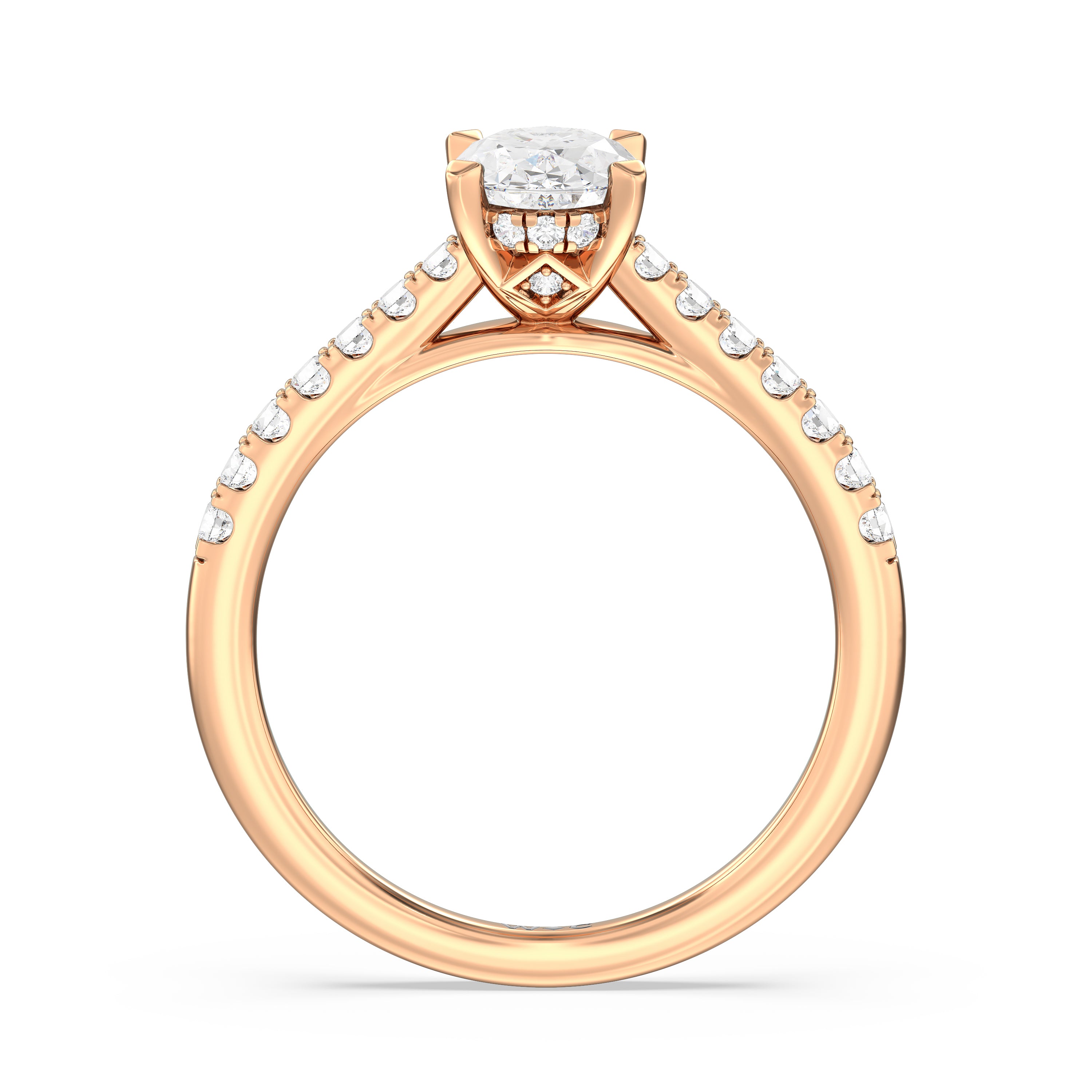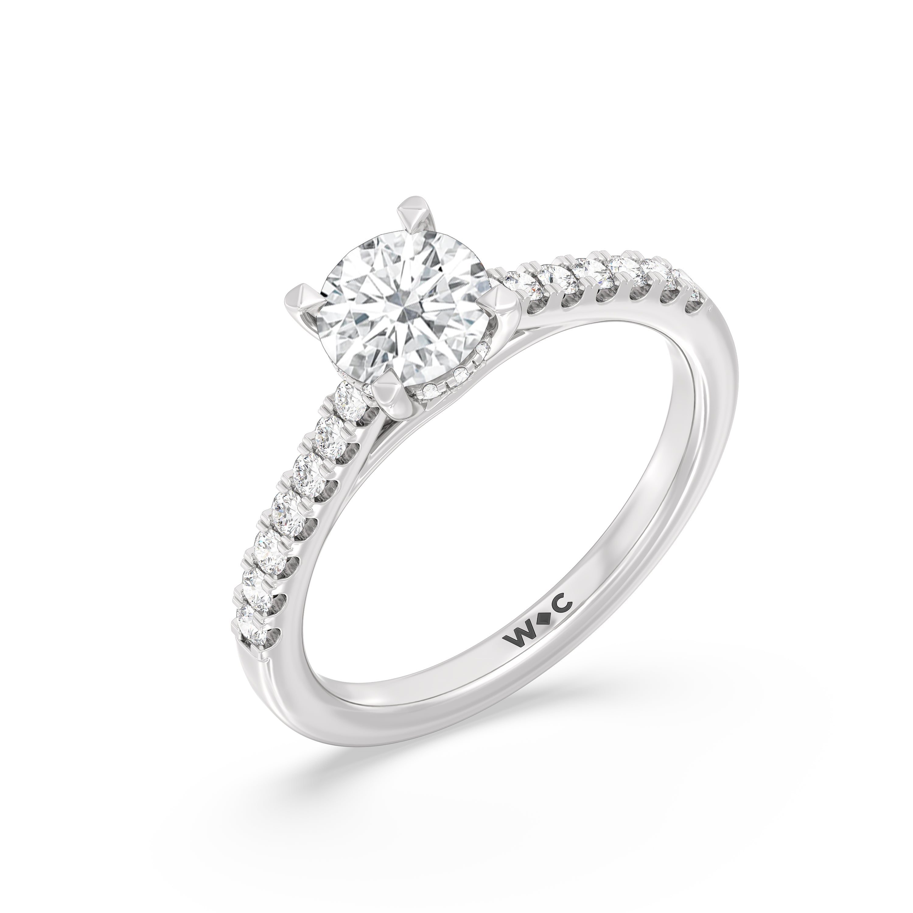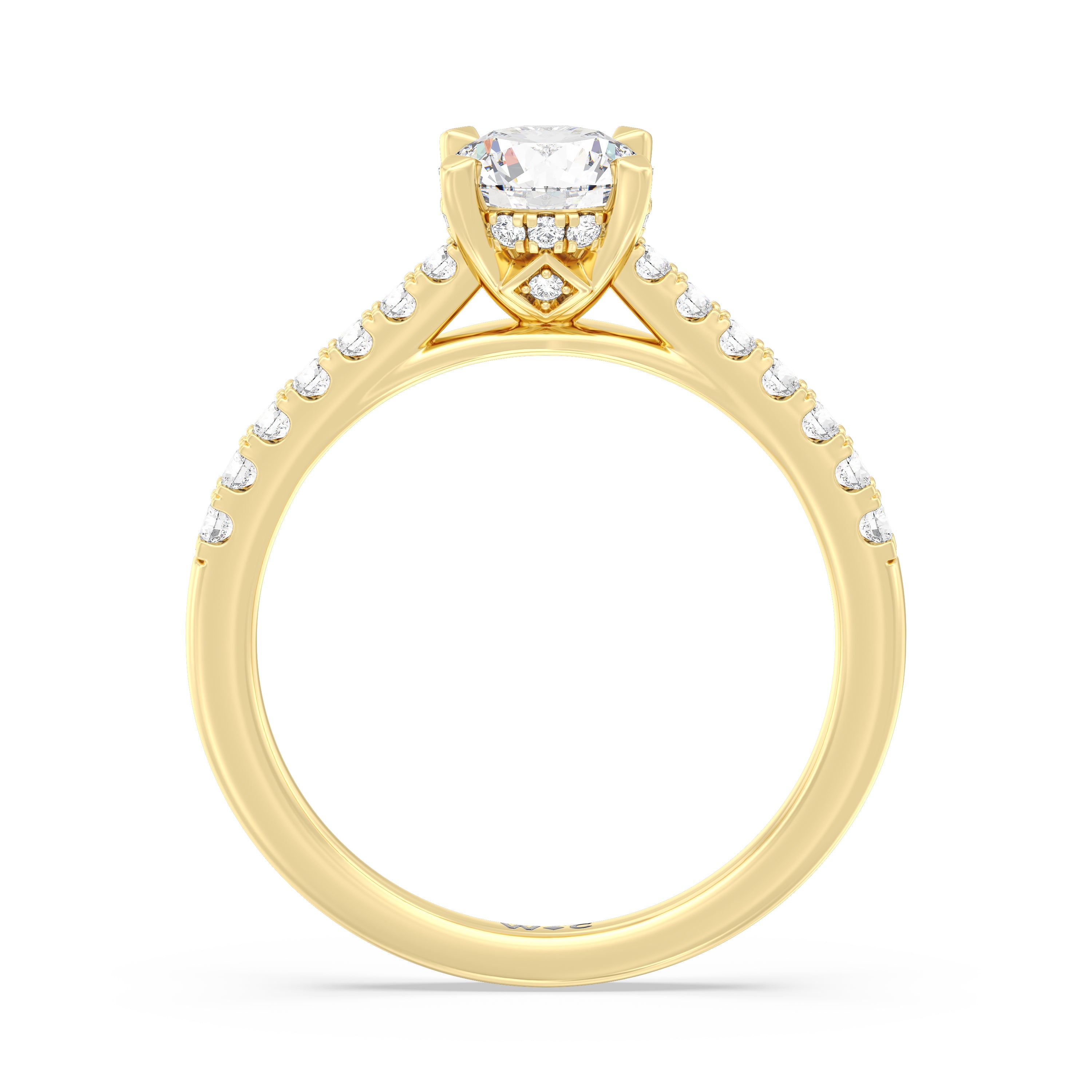 The Melody Engagement Ring impresses with its diamond centre that offers a high level of brilliance and fire. The focal gem is mounted on split prongs on a diamond-studded cathedral shank. A hidden halo adds an understated detail and an unexpected layer of sparkle.
