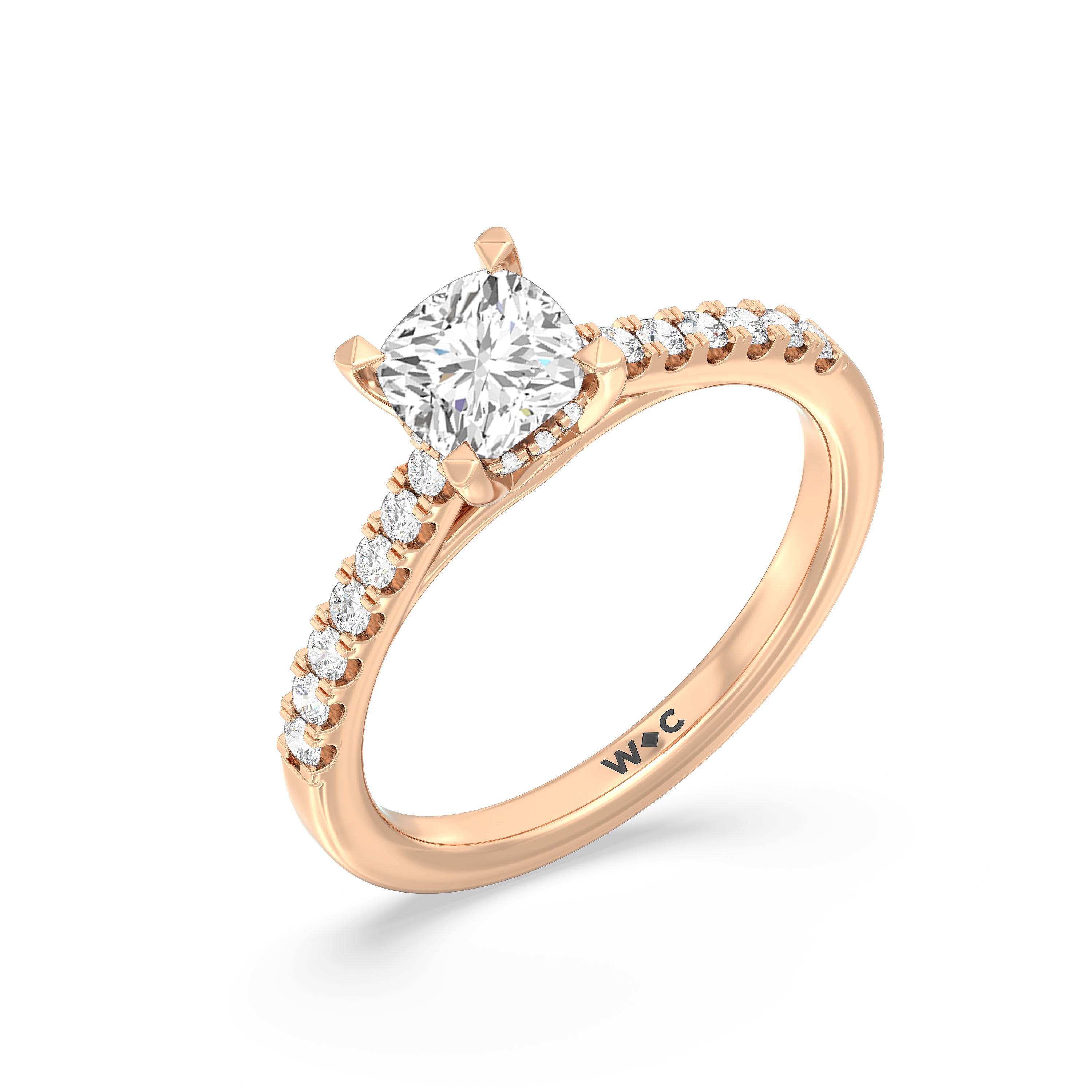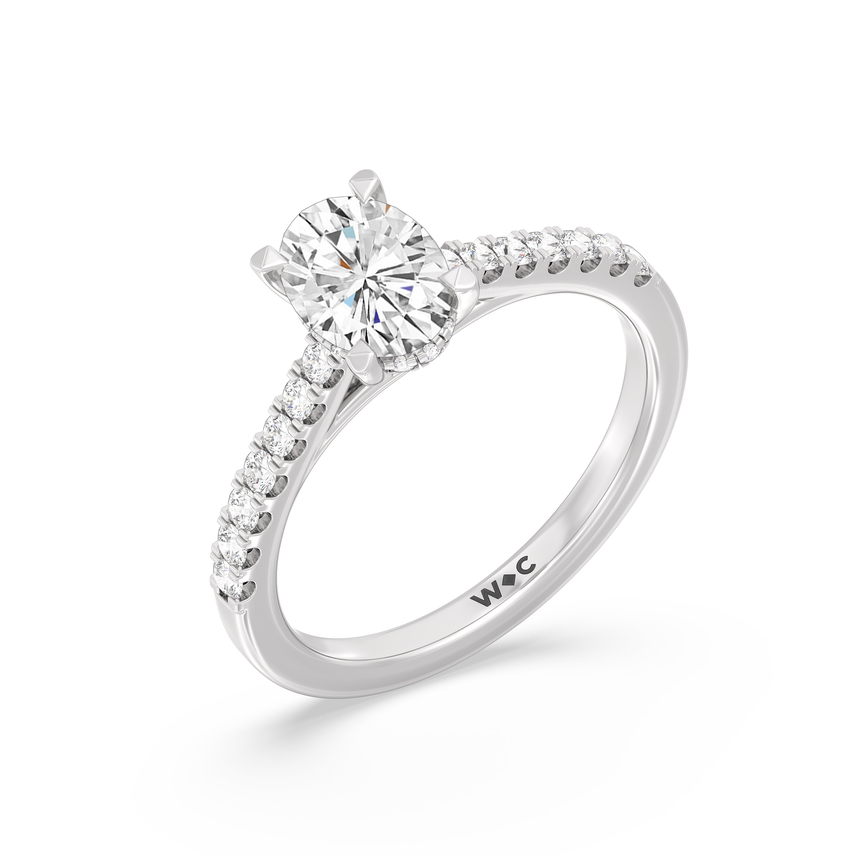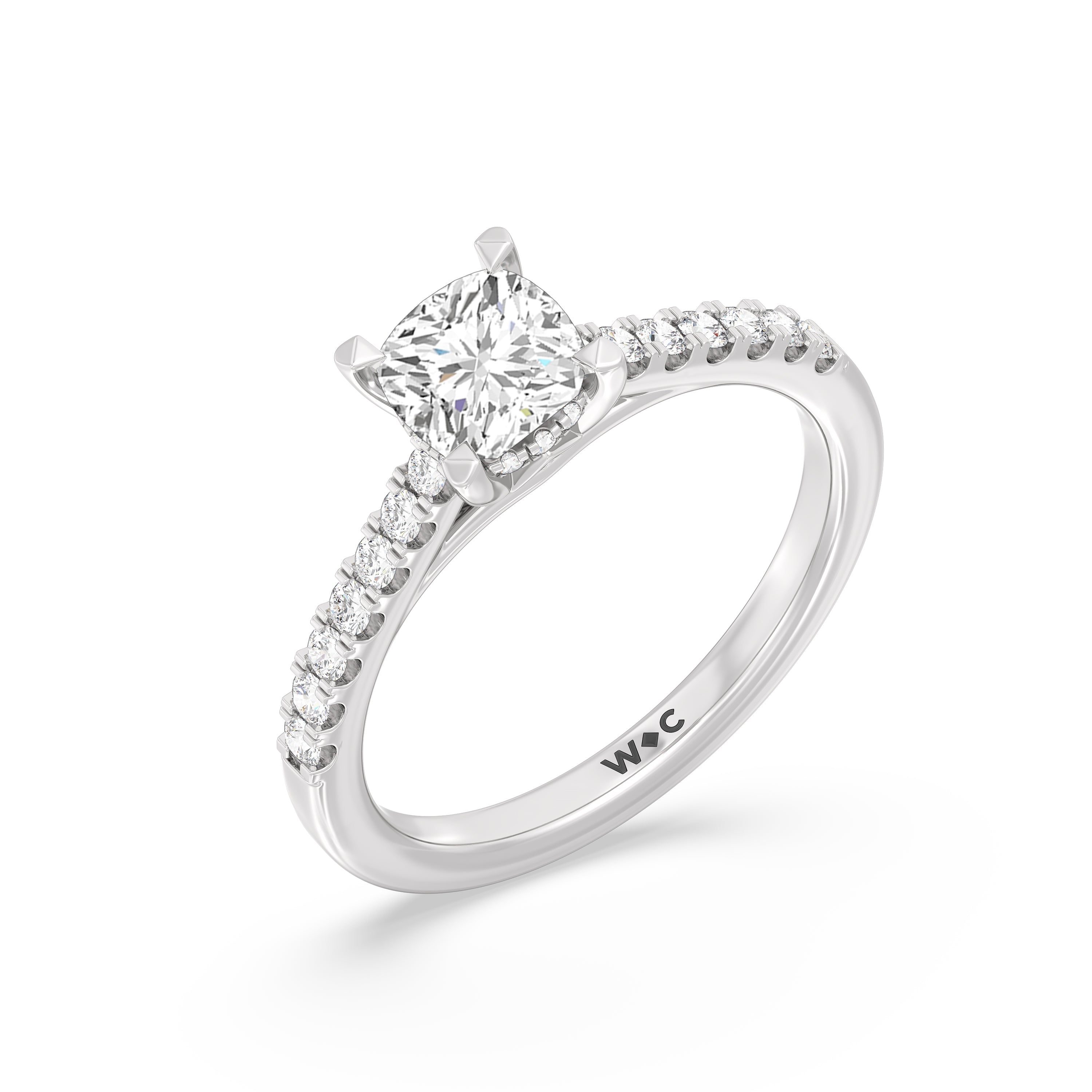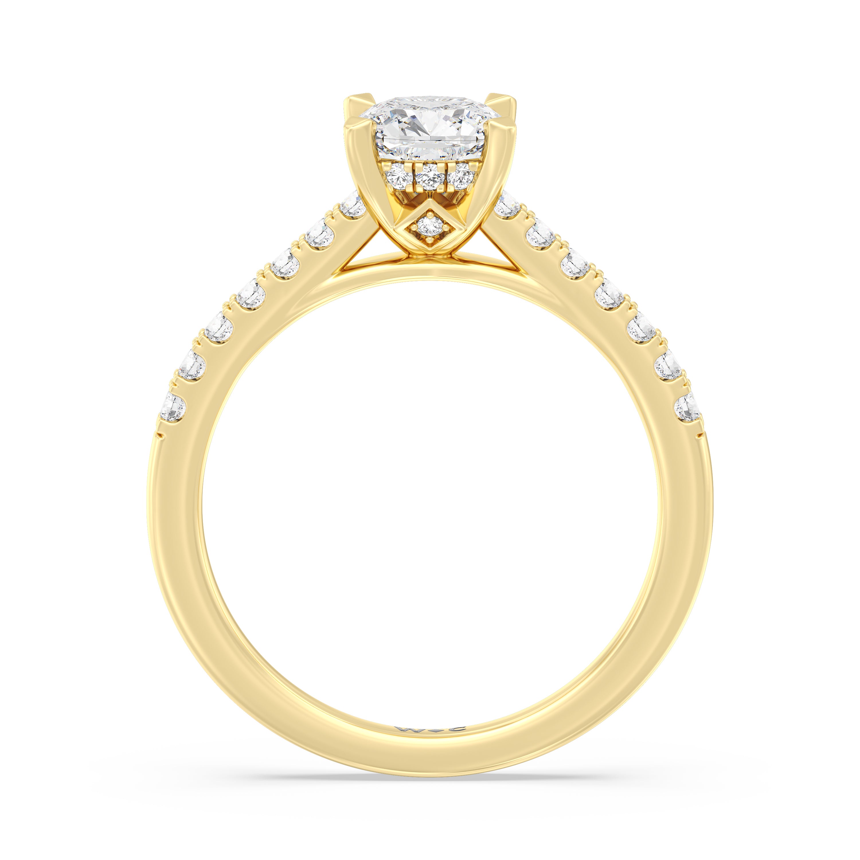 The Melody Engagement Ring impresses with its diamond centre that offers a high level of brilliance and fire. The focal gem is mounted on split prongs on a diamond-studded cathedral shank. A hidden halo adds an understated detail and an unexpected layer of sparkle.