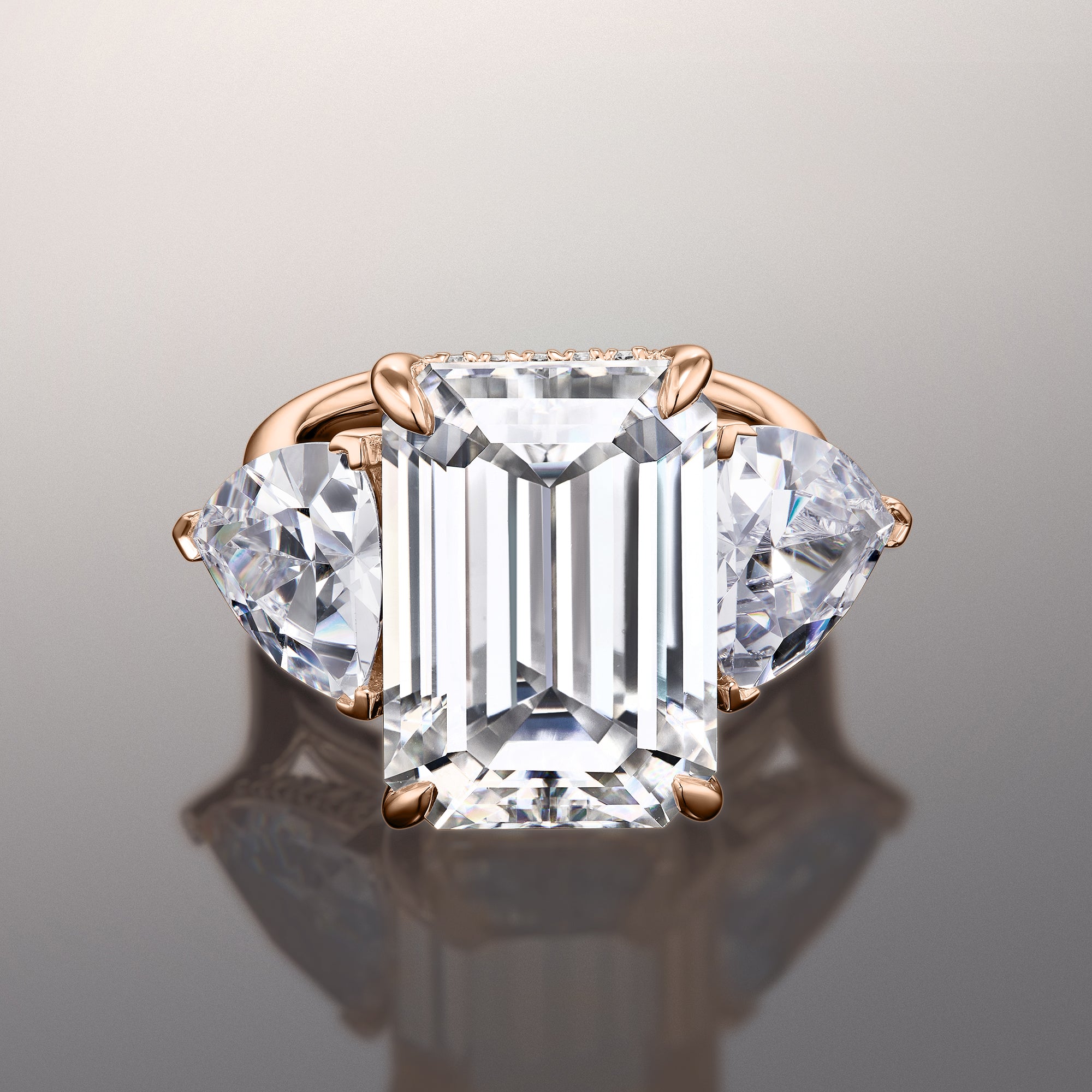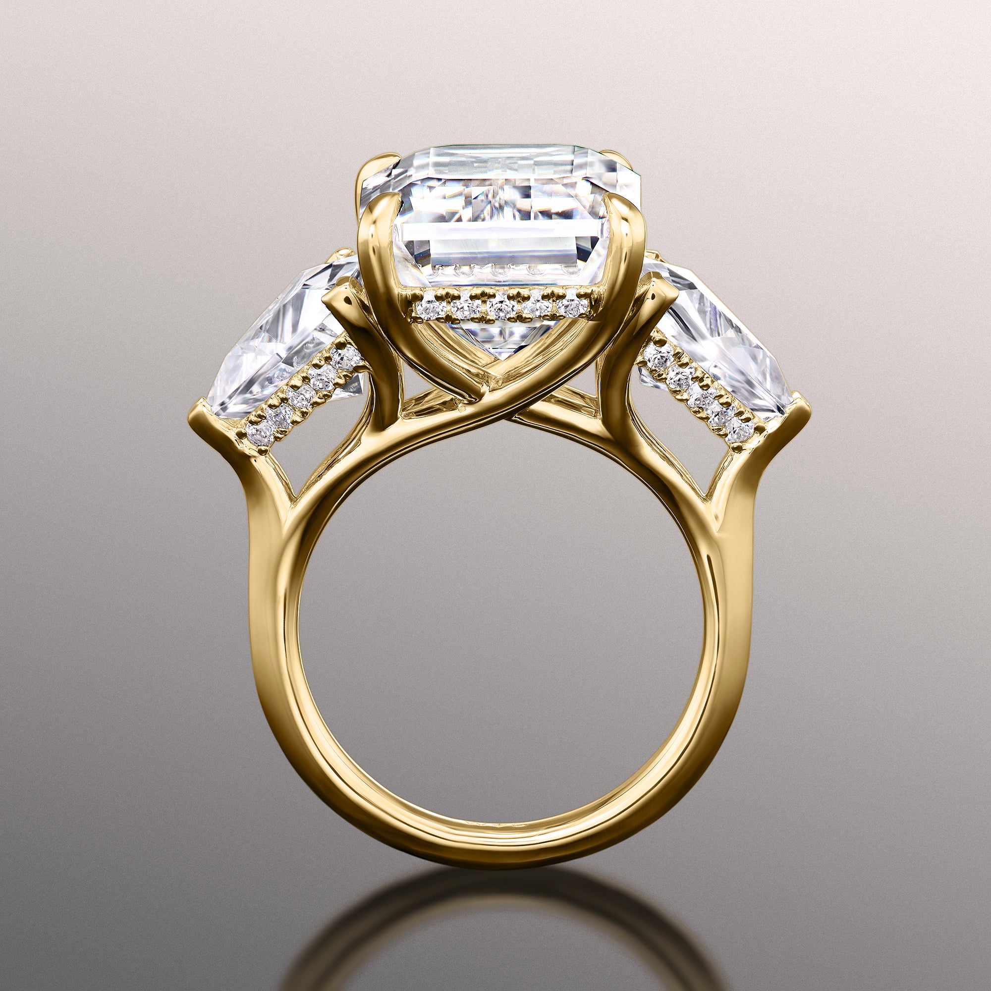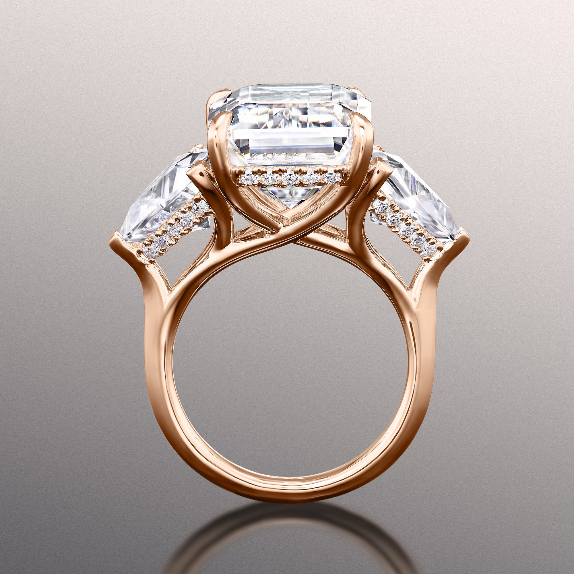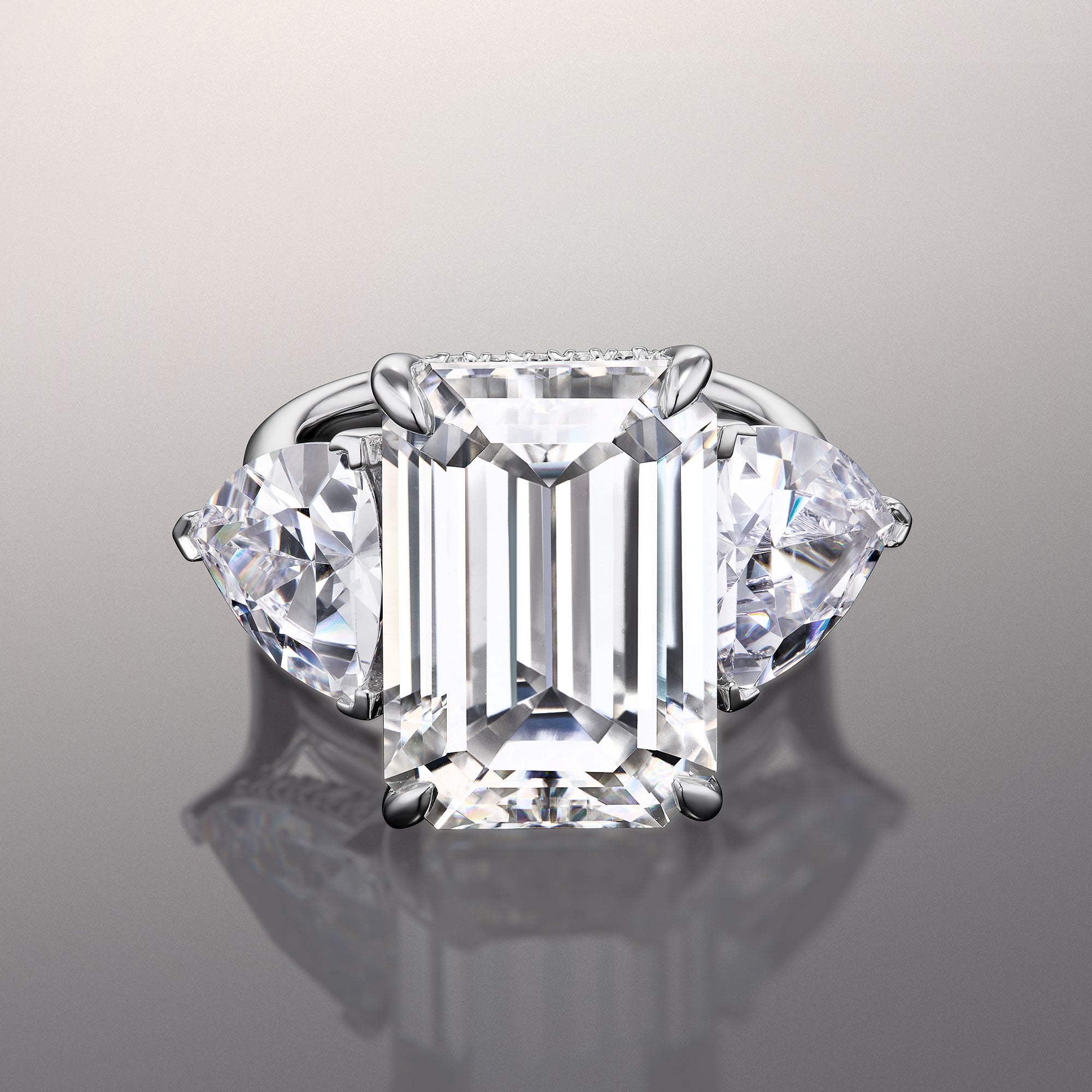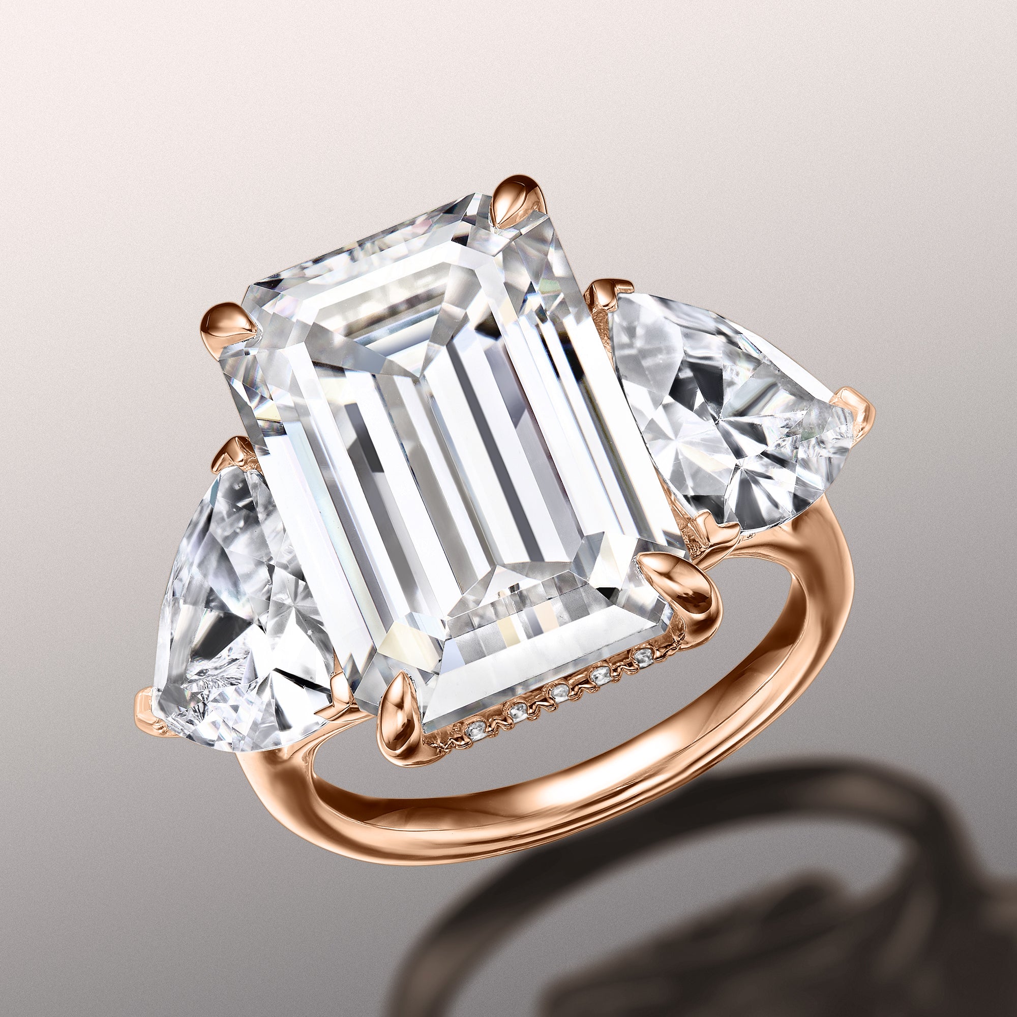 The intensely brilliant Michelangelo ring promises an everlasting appeal. The ring boasts a captivating 15.0 ct emerald-cut diamond center stone, set in between two trillion-cut diamond side stones. The triangular shape of the side stones gives an intriguing geometric look to the ring. Each of the precious stones in this three-stone engagement ring is nestled on a prong setting with diamond-encrusted rails.