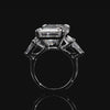 Expressive and imbued with meaning, this ring makes a statement with its effervescent trio of diamonds. It bears an emerald-cut diamond center stone, in between two kite-cut diamonds on v-shaped prongs. The three stones represent the past, present, and future of a love journey are supported by the graceful curves of a trellis, which also adds interest to the ring's side face.