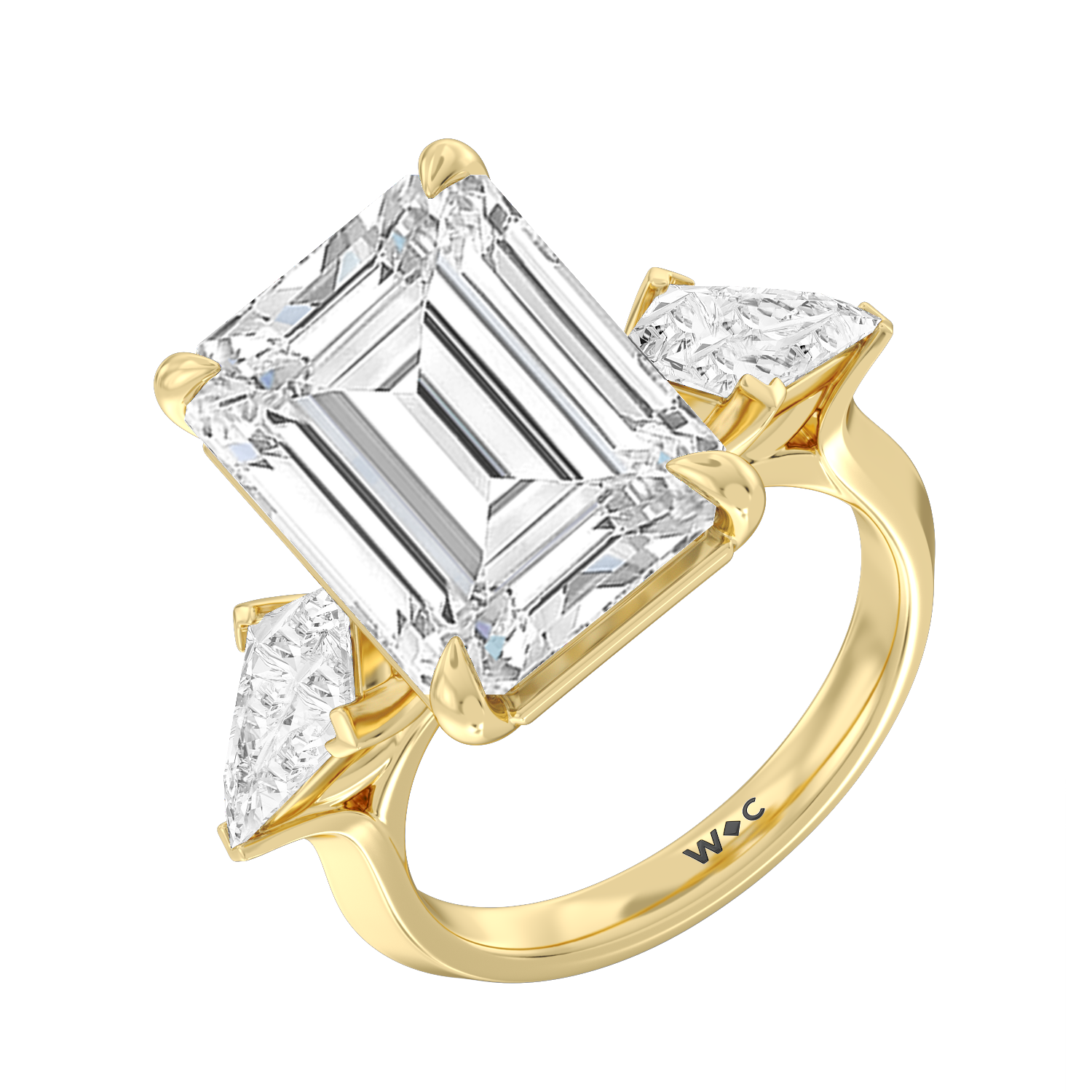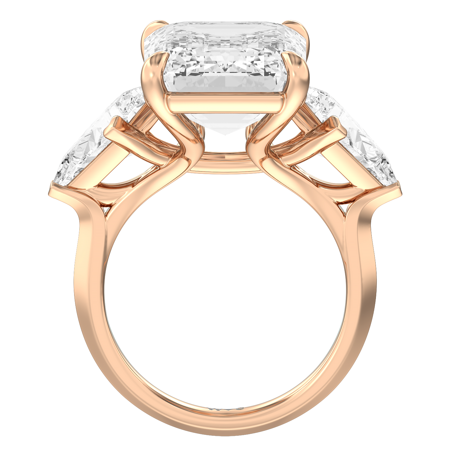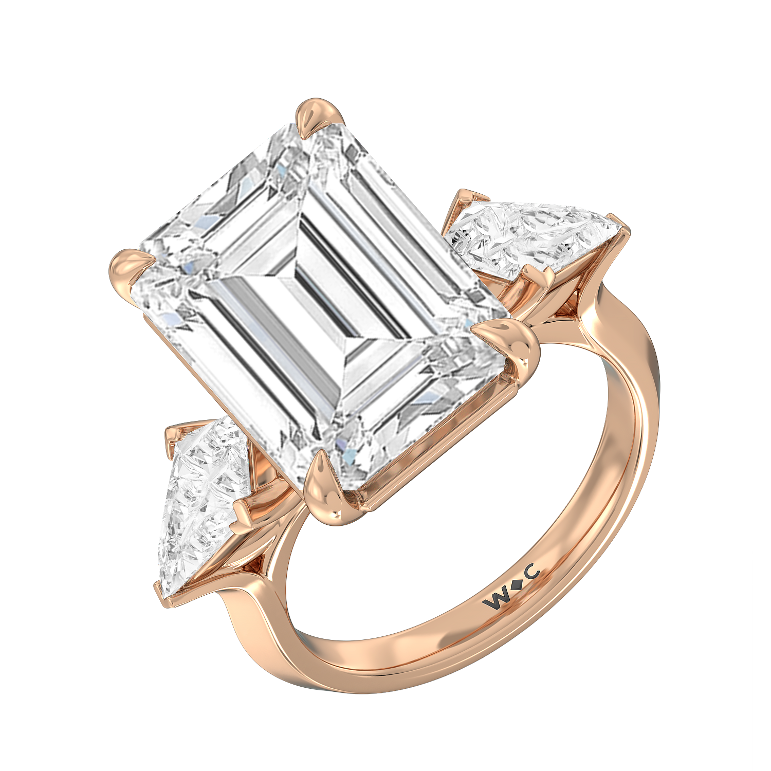 Expressive and imbued with meaning, the Miró ring makes a statement with its effervescent trio of diamonds. It bears a 15.0 ct emerald-cut diamond center stone, in between two 1.0 ct kite-cut diamonds on v-shaped prongs. The three stones are supported by the graceful curves of a trellis which also adds interest to the ring's side face.