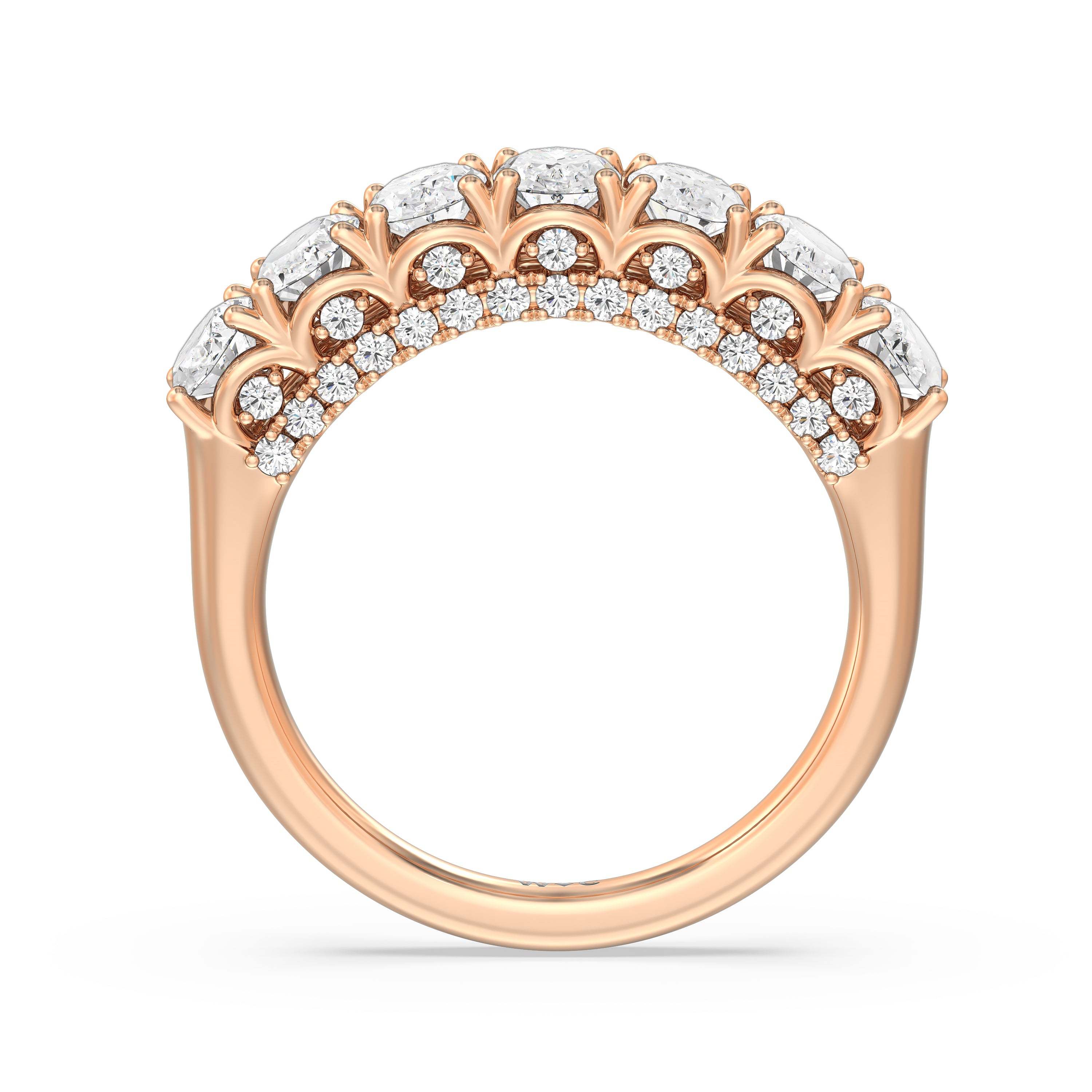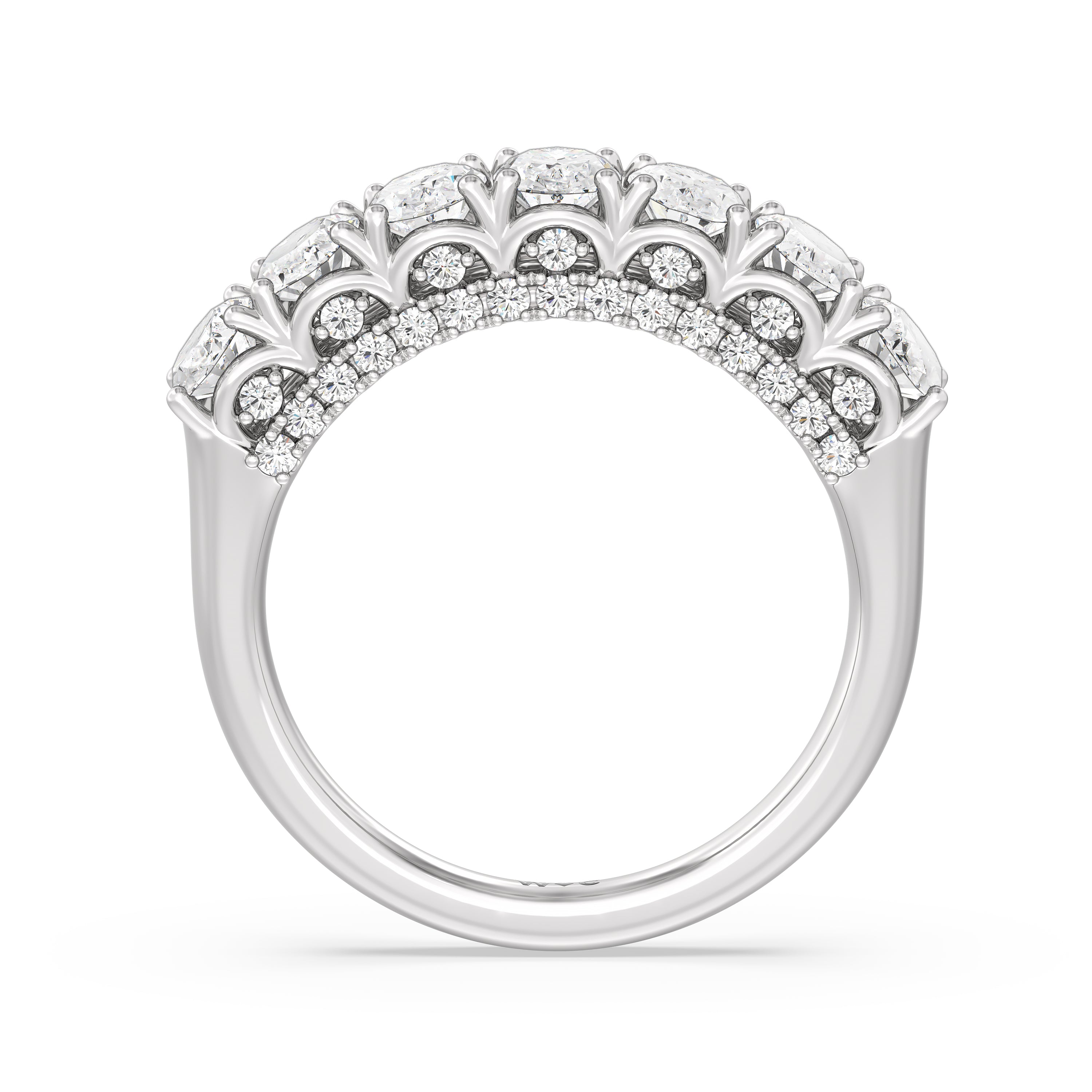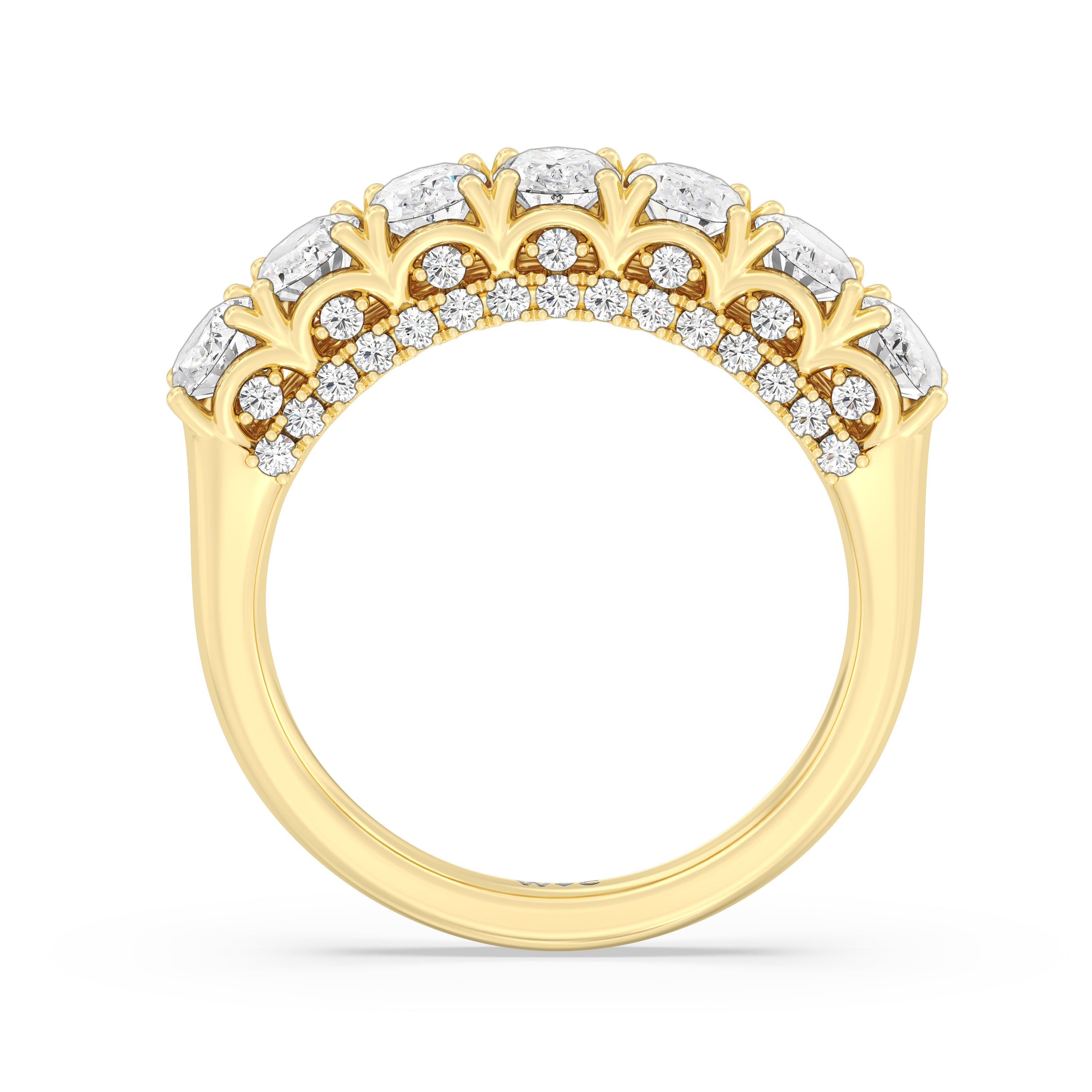 Just like the radiant sunshine, this yellow gold anniversary ring bursts with brilliance. The elegant ring features shared split prongs in a well-defined pattern securing a never-ending circle of oval diamonds. A view from the sides showcases more petite round diamonds tracing the entire circumference of the ring.