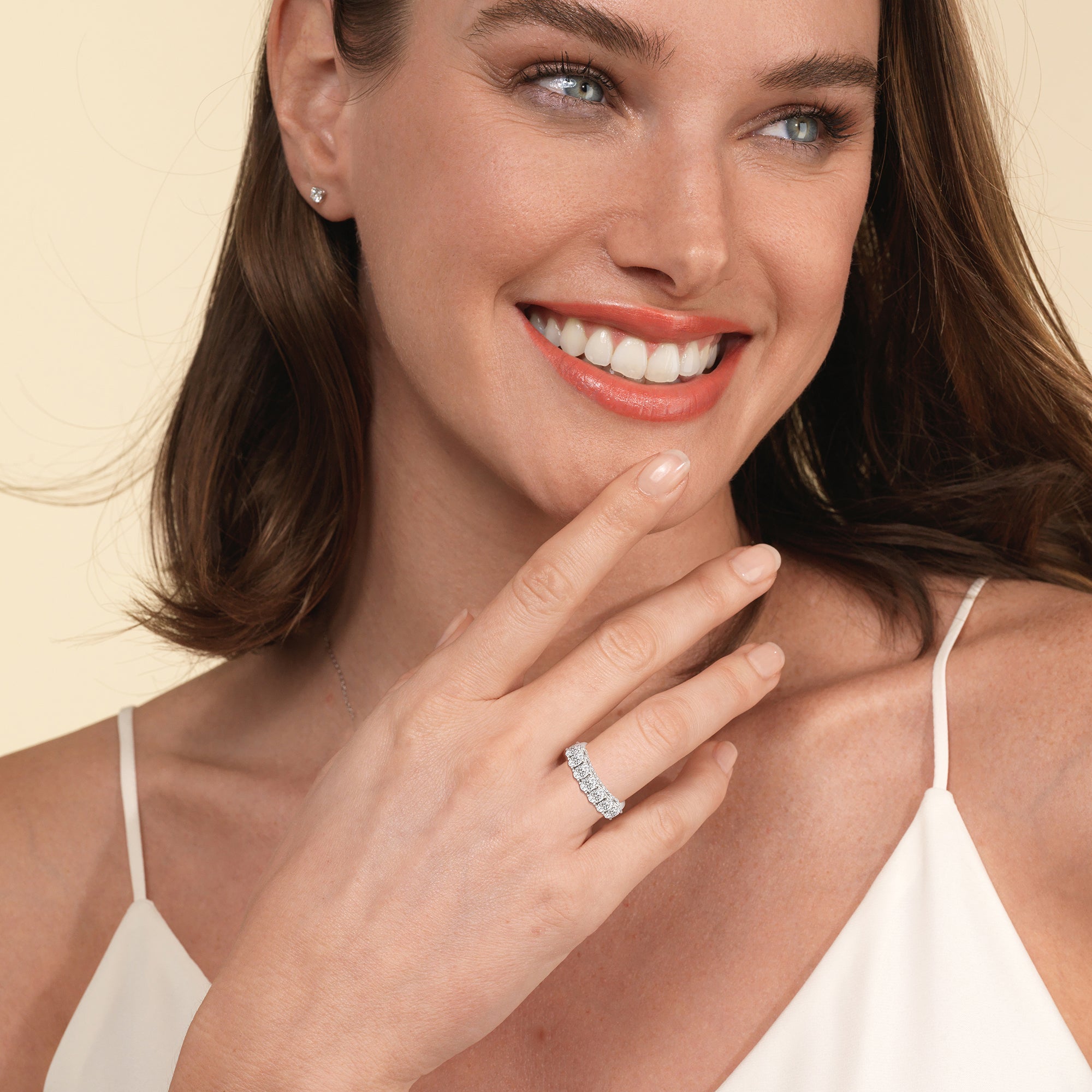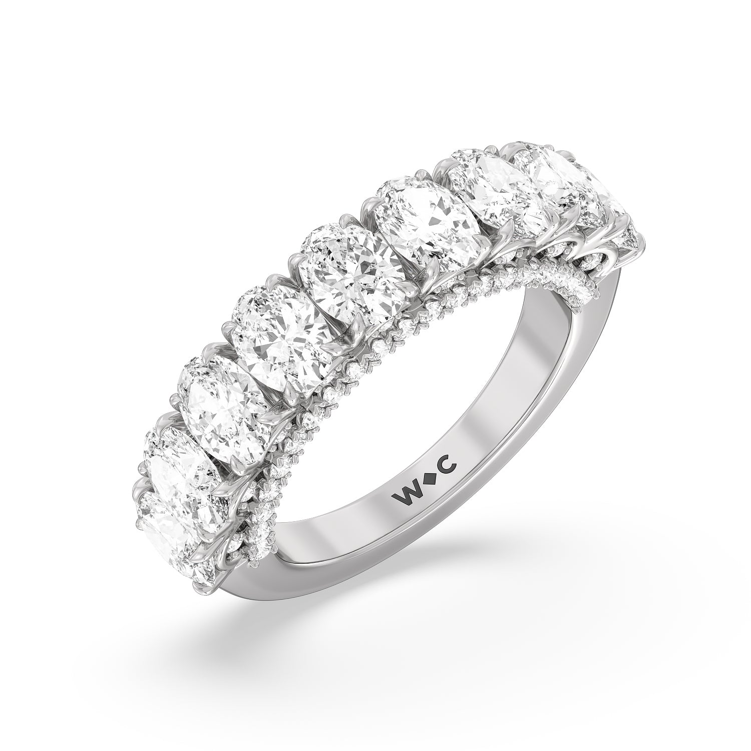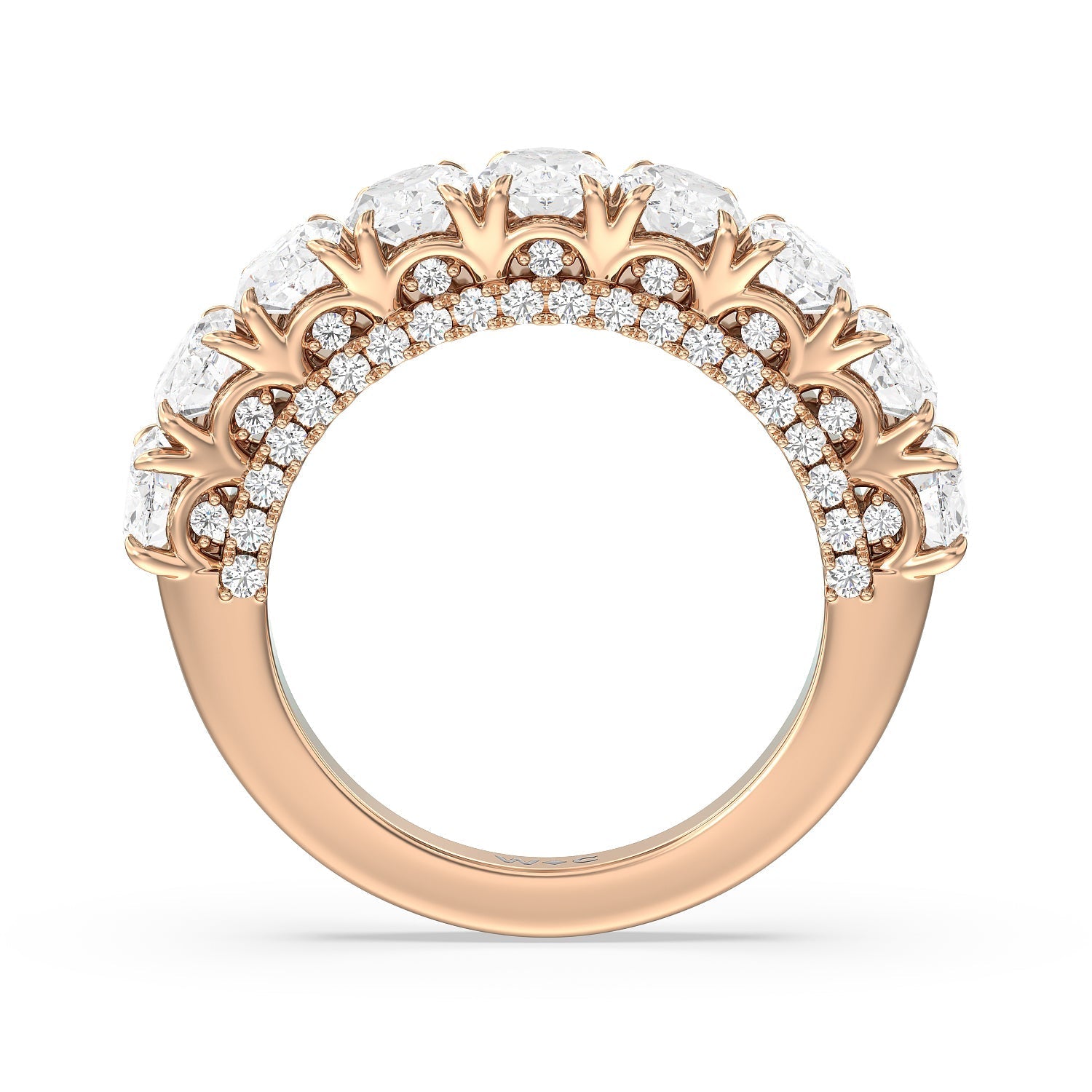 Just like the radiant sunshine, this yellow gold anniversary ring bursts with brilliance. The elegant ring features shared split prongs in a well-defined pattern securing a never-ending circle of oval diamonds. A view from the sides showcases more petite round diamonds tracing the entire circumference of the ring.