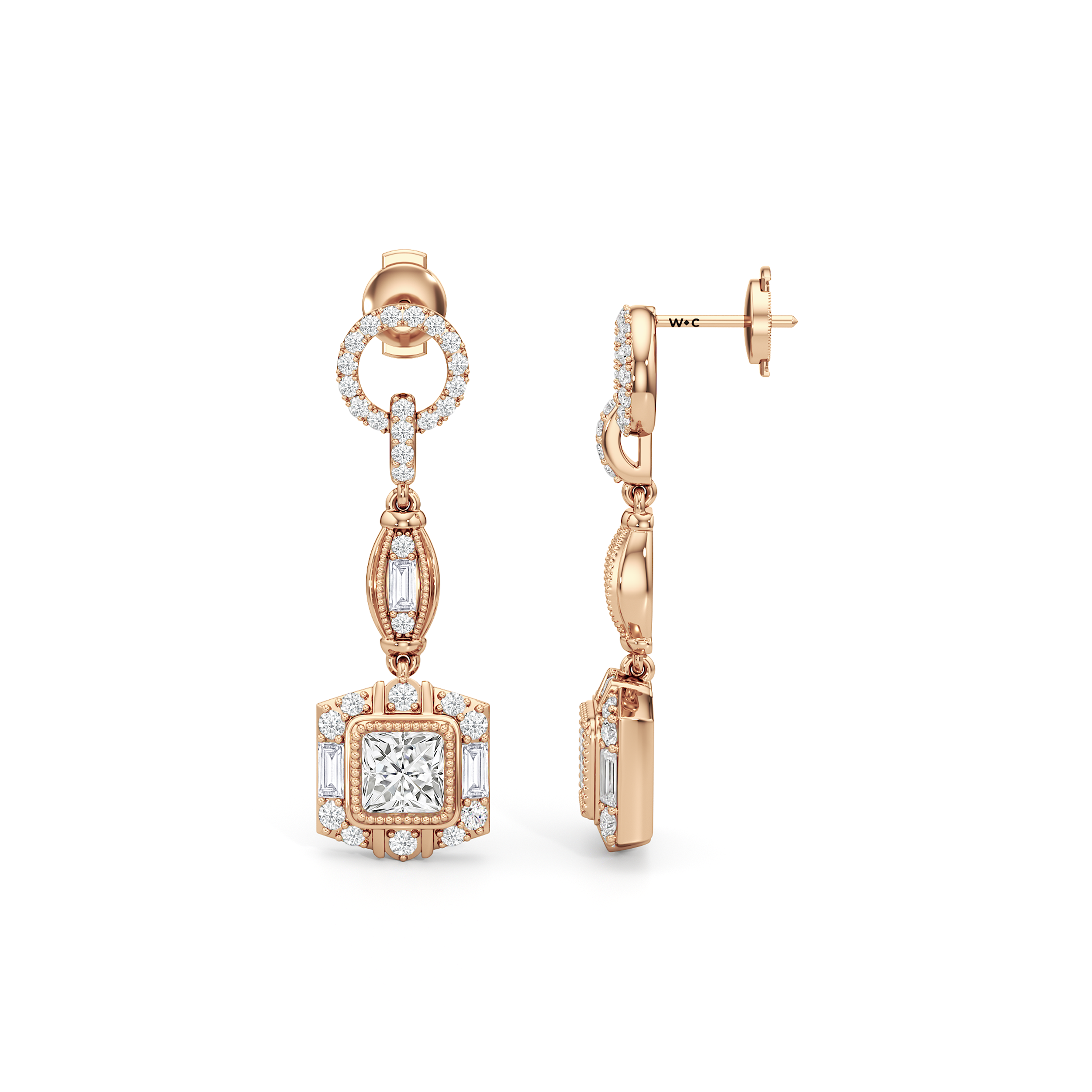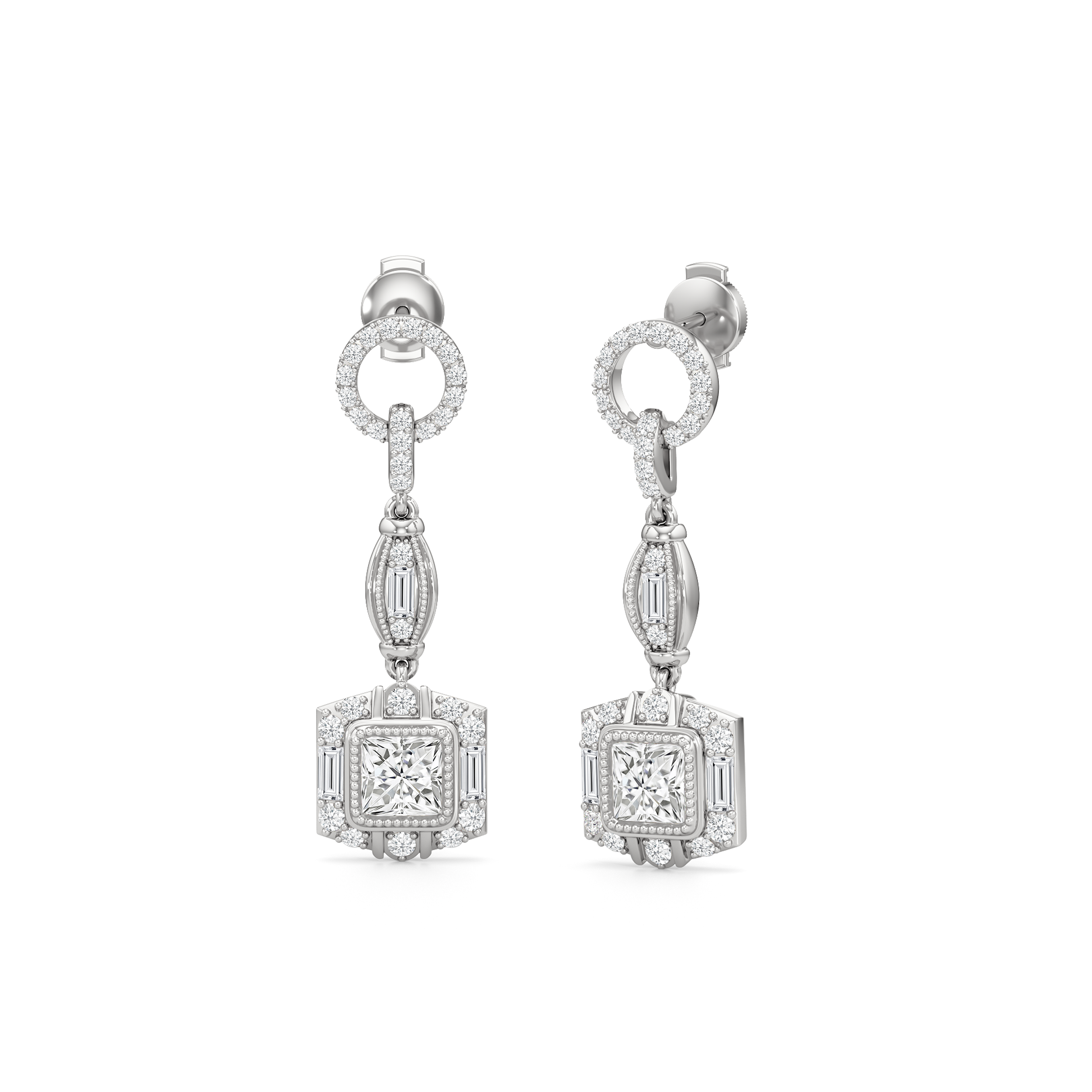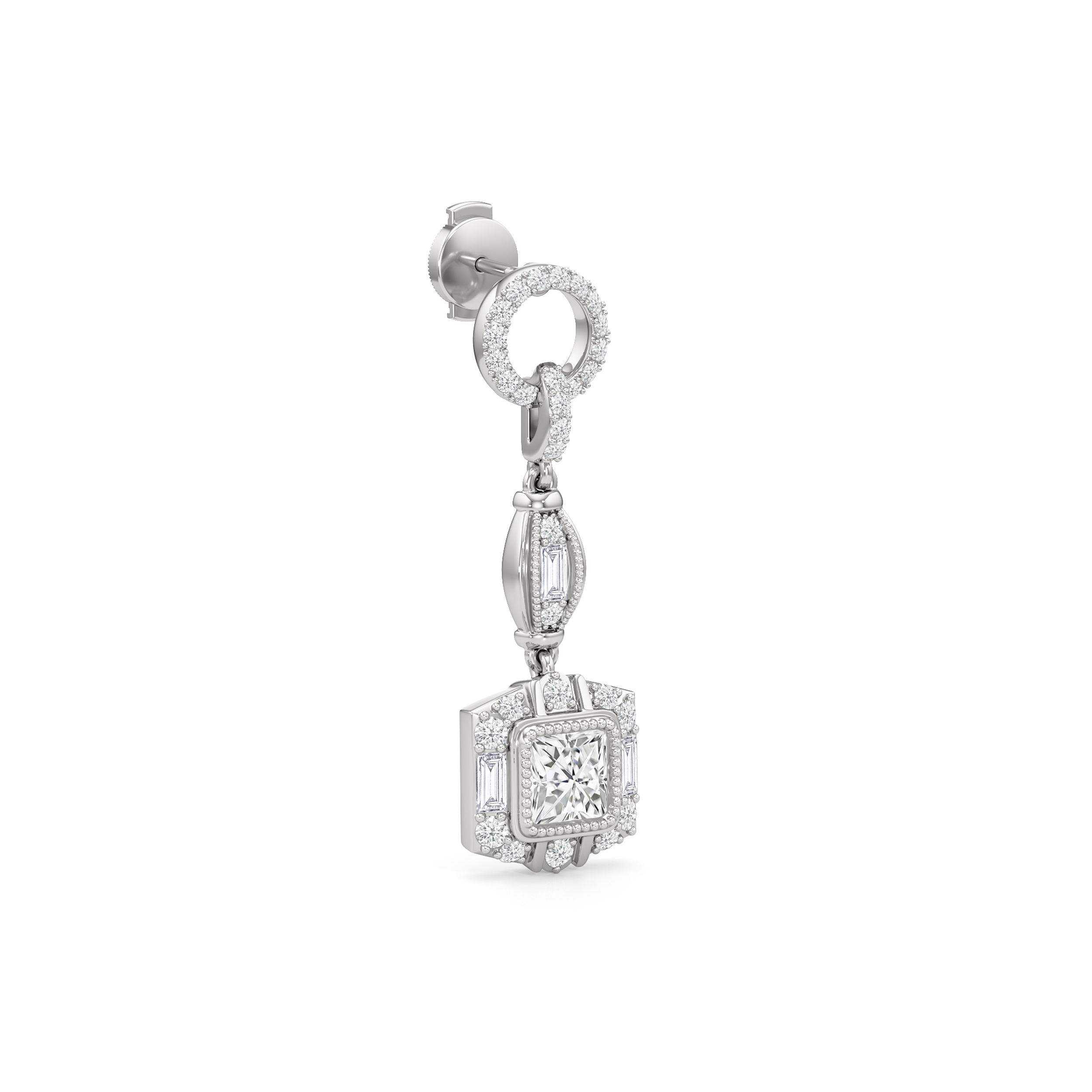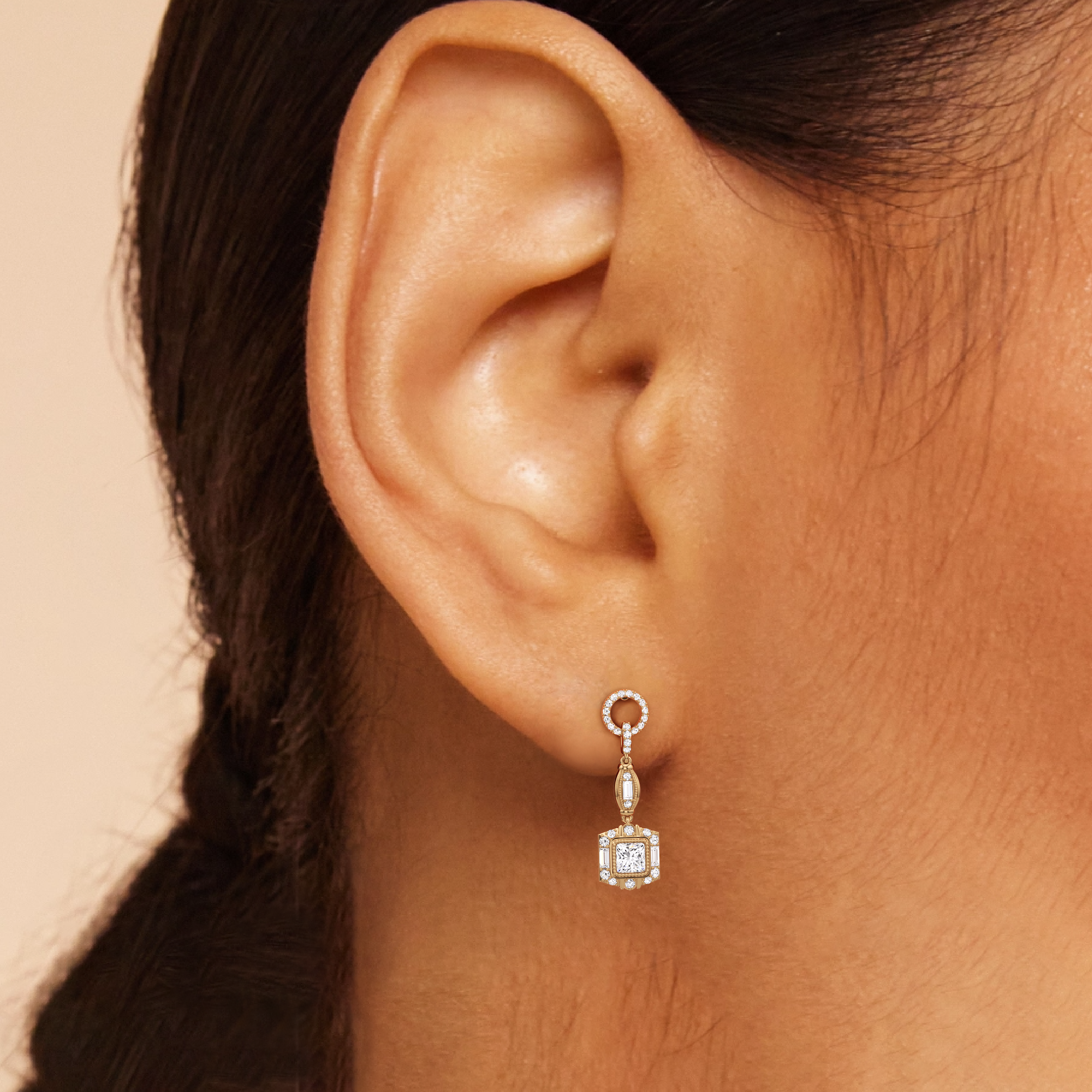 Drawing inspiration from the Art Deco Capital of the World, the Napier Earrings carry with them every decorative theme found on the buildings of Napier—from the sweeping curves and sense of movement of sunbursts and fountains to the elongated lines and geometric shapes symbolizing speed and power. The earrings feature a three-part design: a hoop-like post that anchors the design with its radiant simplicity, a milgrain-detailed and diamond-embellished ellipse link that adds a sense of fluidity, and a princess-cut diamond, set within a stylized cushion-shaped frame and adorned with milgrain beads, baguette diamonds, and prong-set round diamonds, that serves as the radiant focal point. The clean symmetry and meticulous arrangement of stones illustrate the refined glamour of an era when precision and dynamic energy danced hand in hand, creating a rhythmic harmony of form, light, and movement.