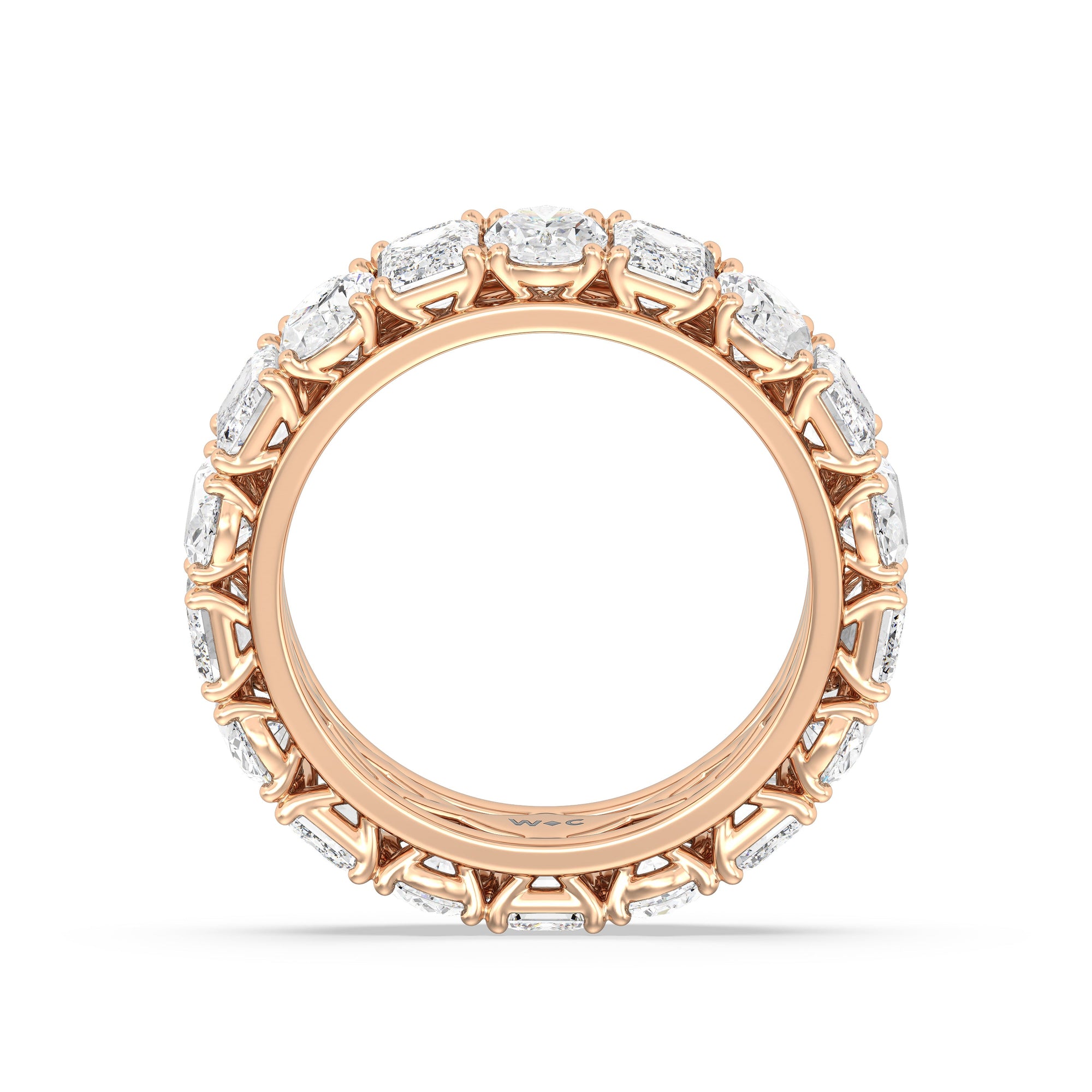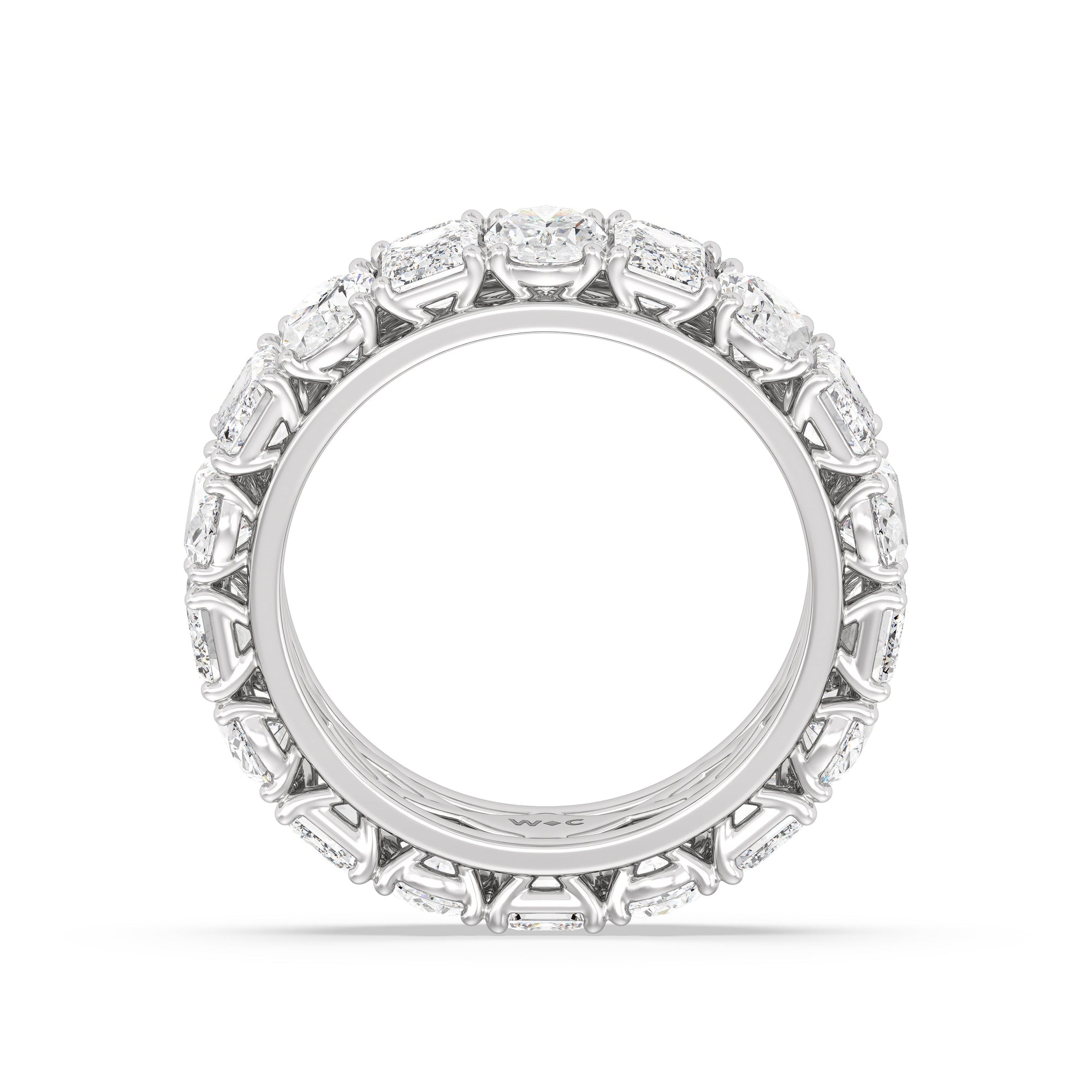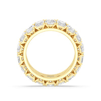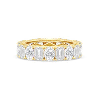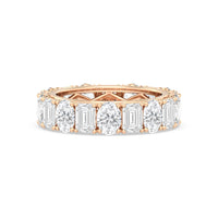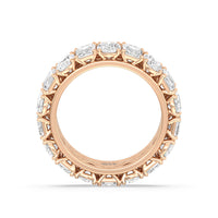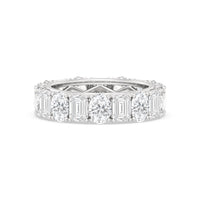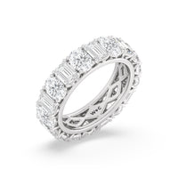 This ring is anything but subtle with its brilliant design. The shank is surrounded by eleven emerald-cut and eleven oval-cut diamonds on v-shaped prongs, alternating in a mesmerizing pattern. The larger than life shine of this ring perfectly reflects the strength of the love that binds you and your partner together.