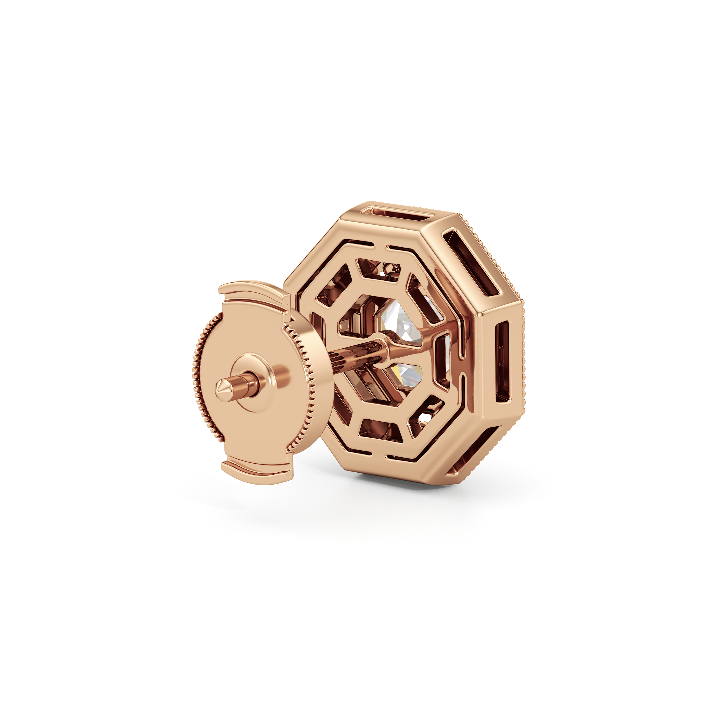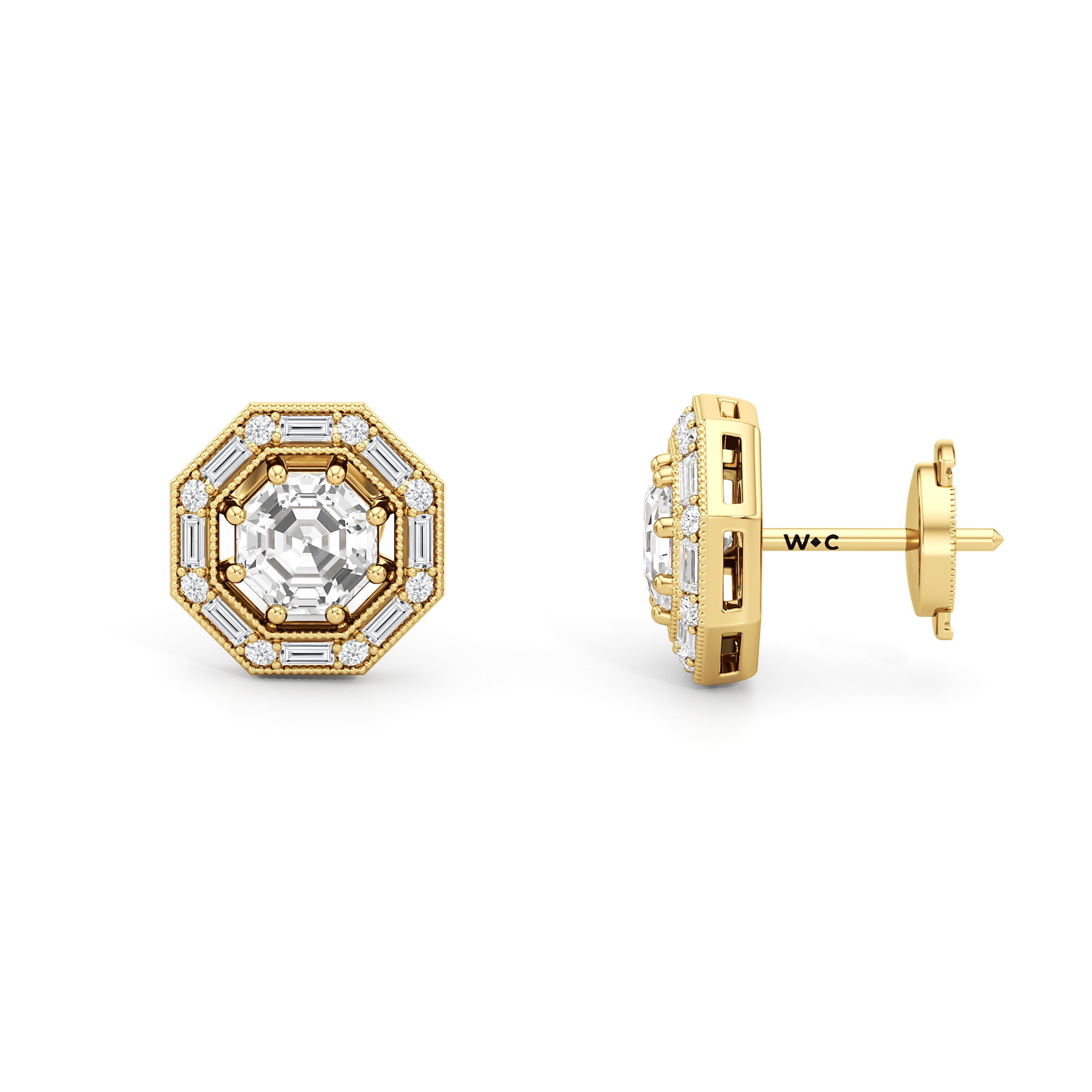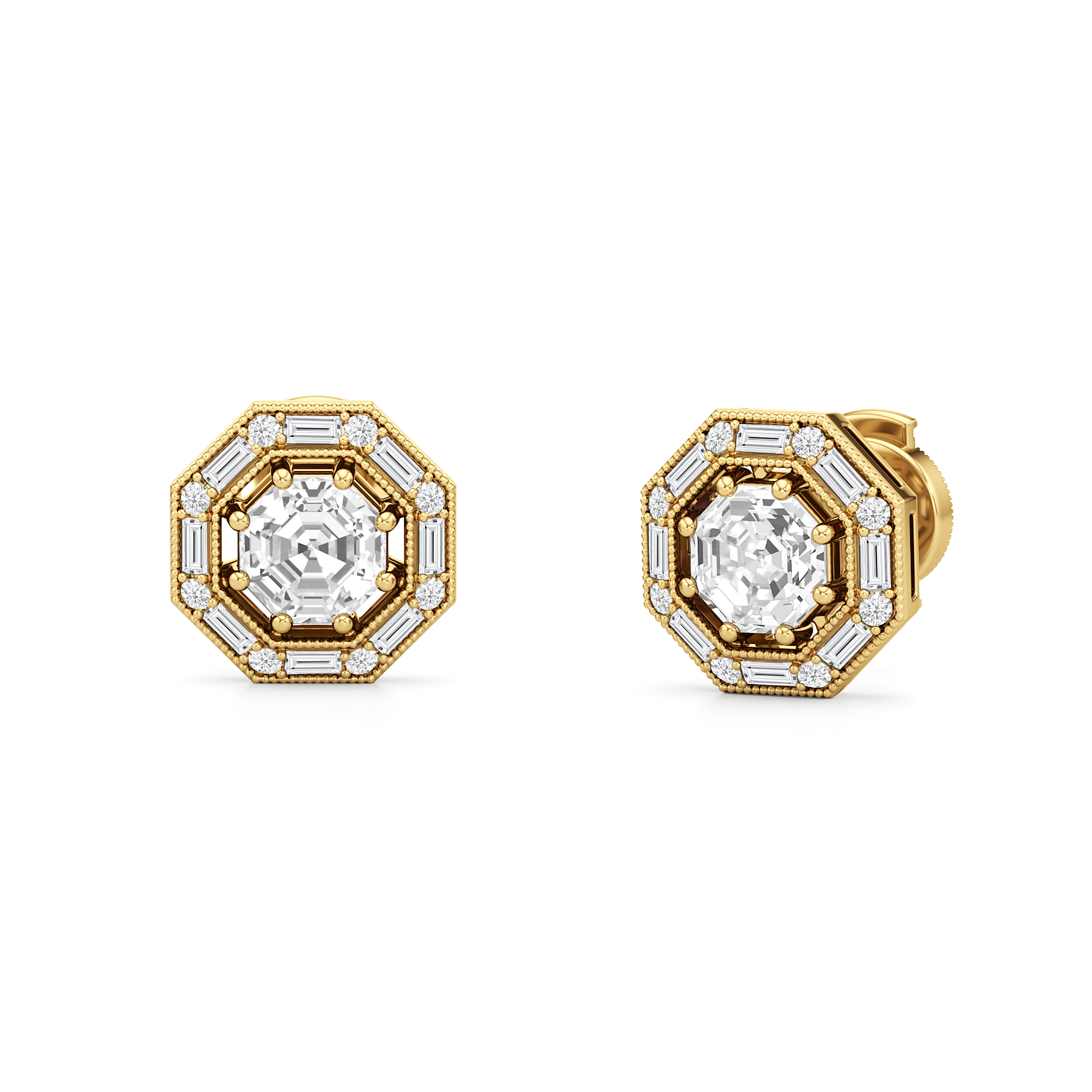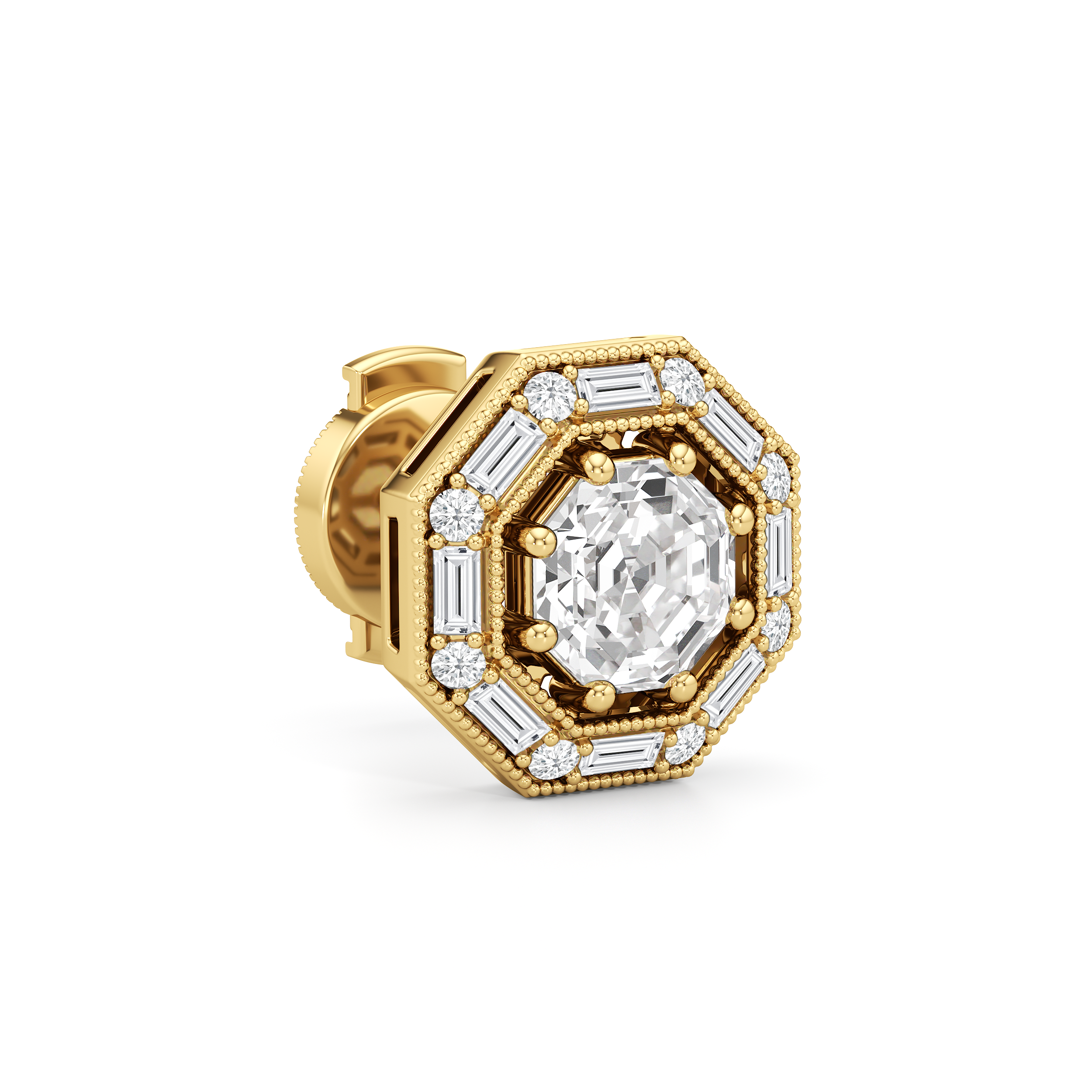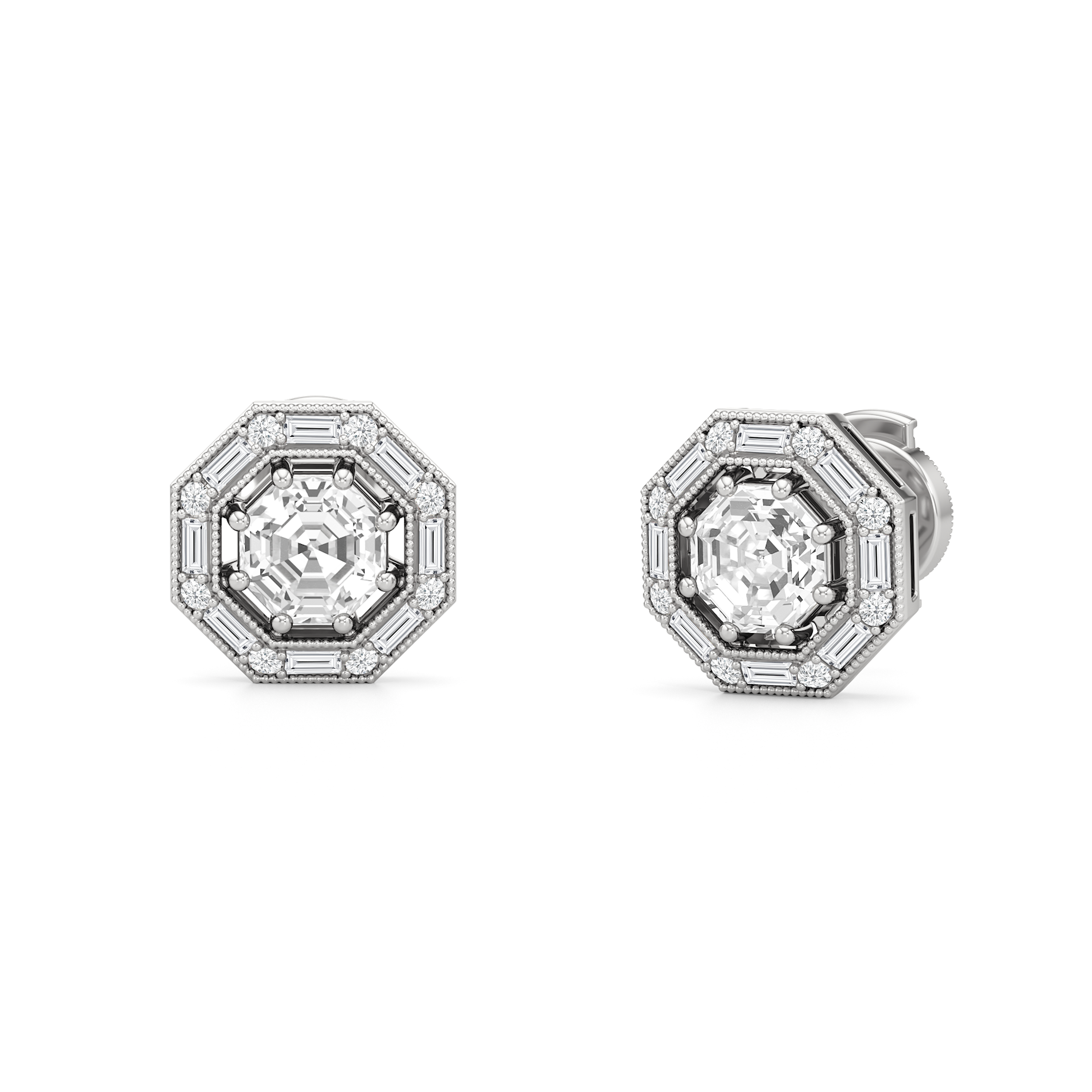Geometric precision and visual harmony are qualities central to Art Deco movement's visual language, and they're clearly evident in this pair of stud earrings. Each earring features an octagon-cut center stone cradled by an eight-sided frame that embraces symmetry. The frame is adorned with alternating baguette and round stones, set within pavé walls and finished with delicate milgrain beading. The octagonal silhouette of these studs demonstrates sculptural sophistication, reflecting the Art Deco commitment to refined opulence.