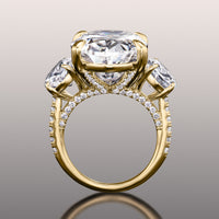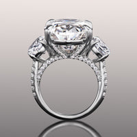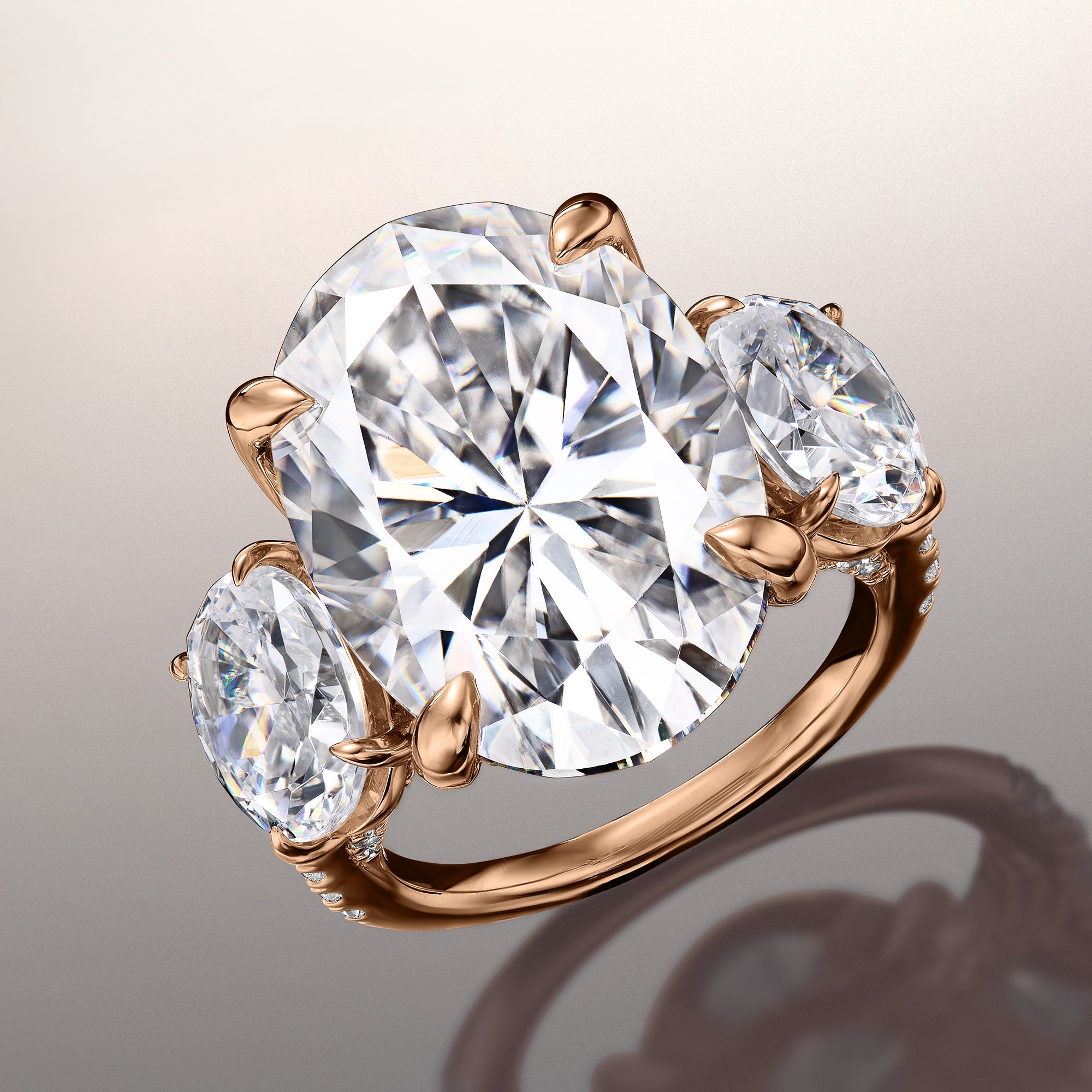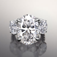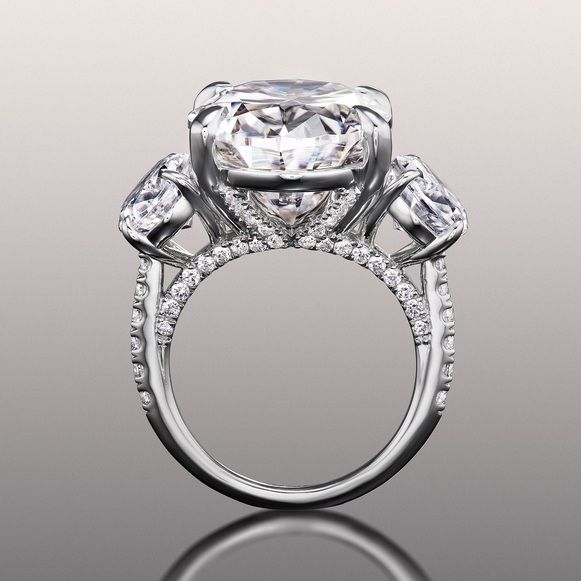 An utterly magnificent three-stone ring with intricate detailing. This ring holds an oval diamond center stone in between two oval diamond side stones. Each of the three main gems is securely cradled by a four-prong basket setting. Petite round diamonds are meticulously applied on the band's shoulders, bridge, and gallery for a dramatic and rhythmic play of light.