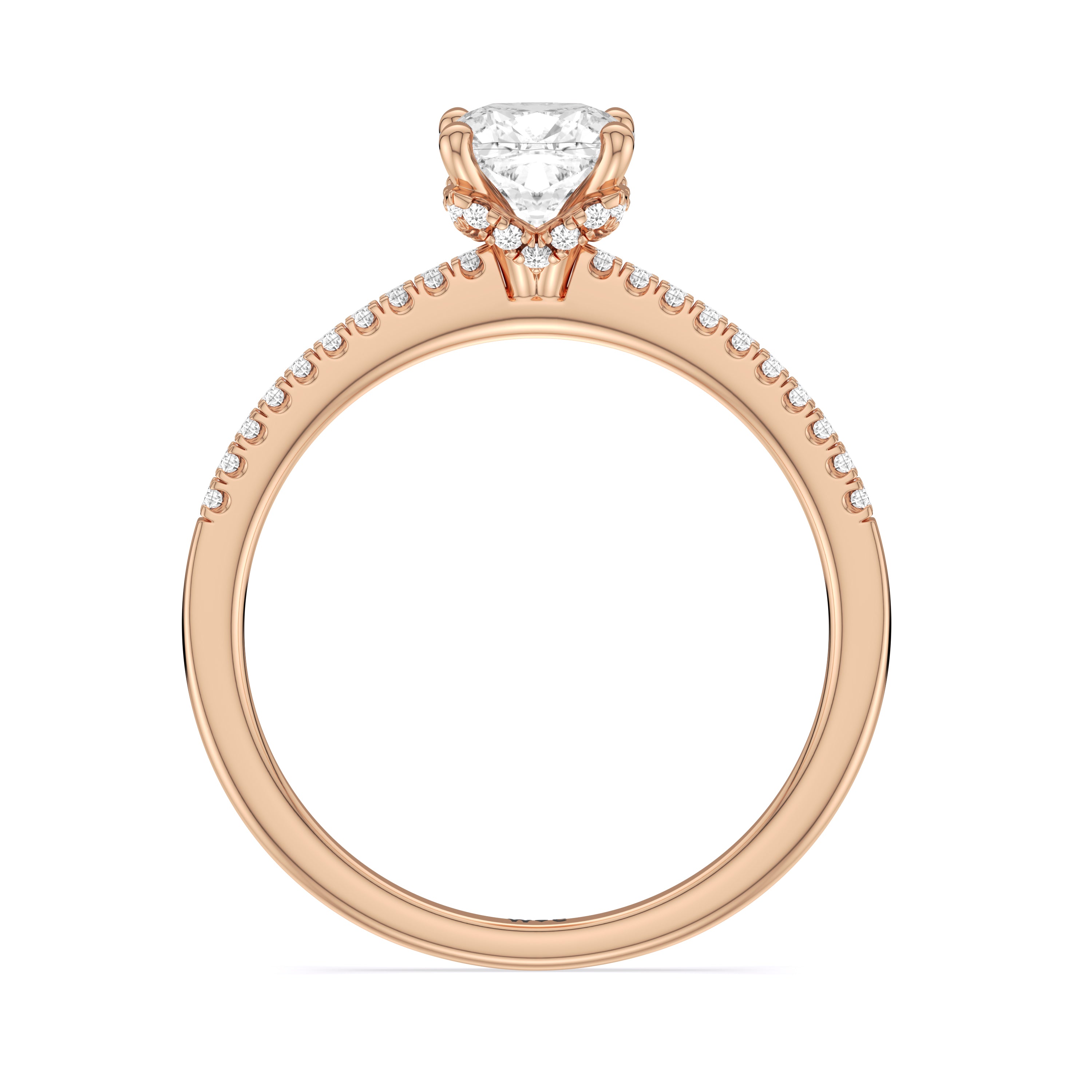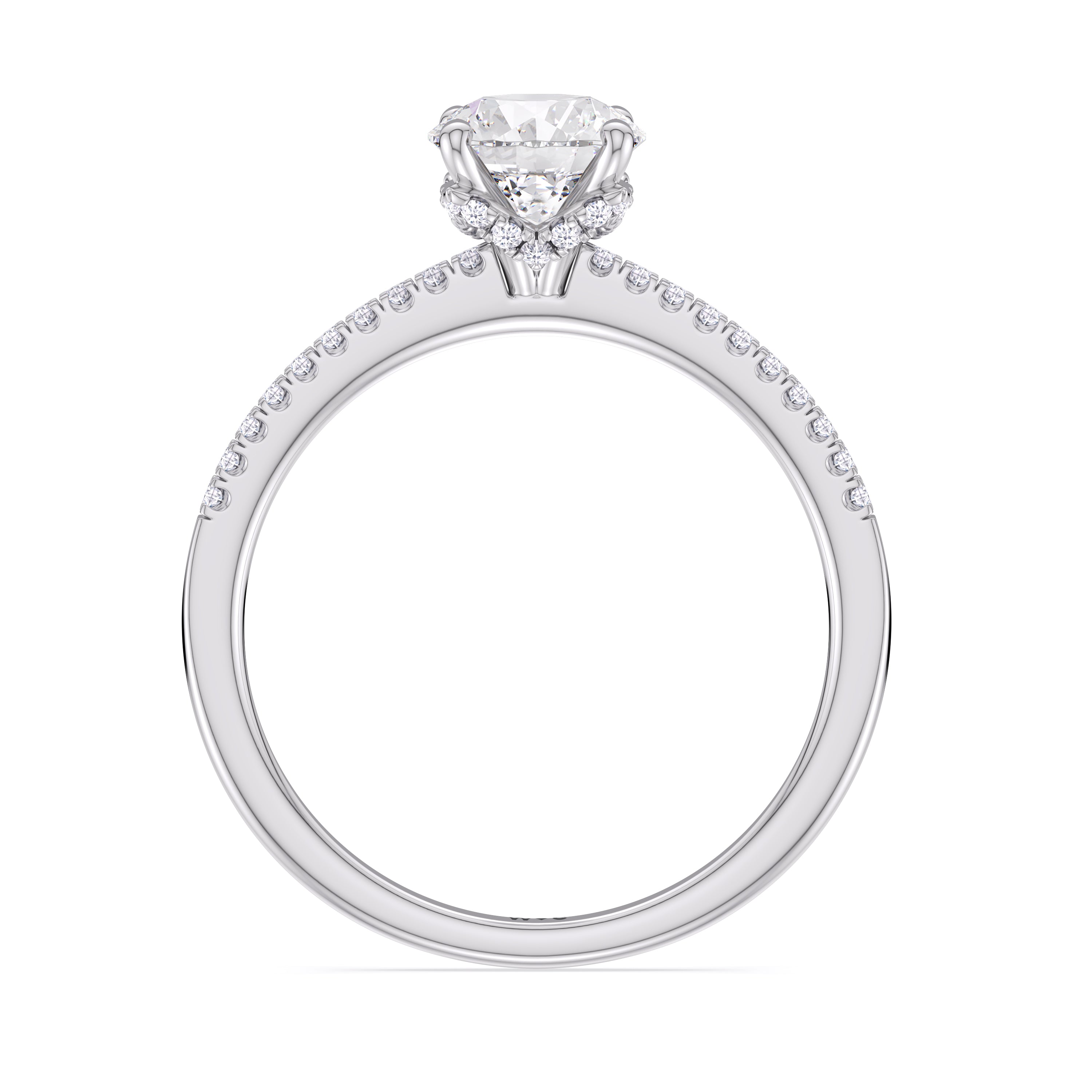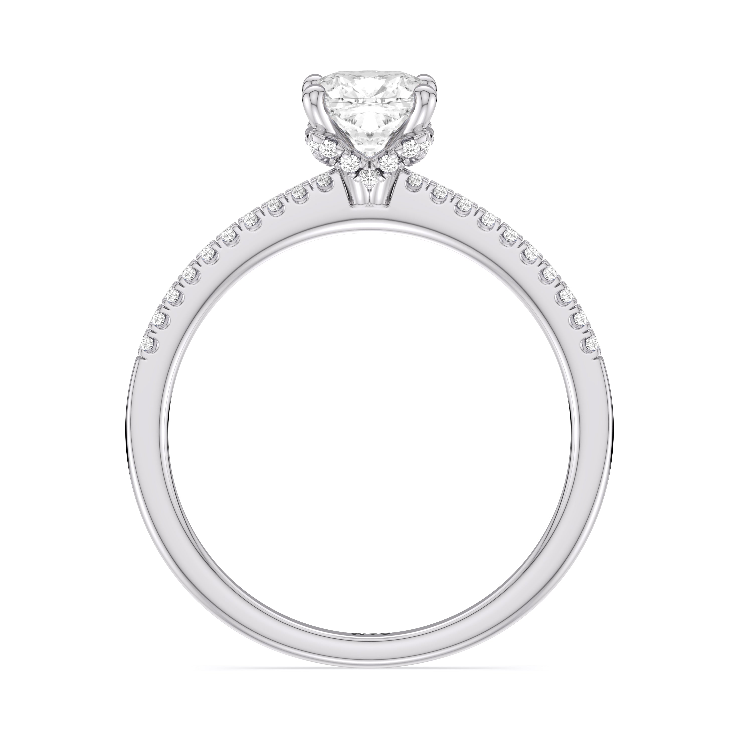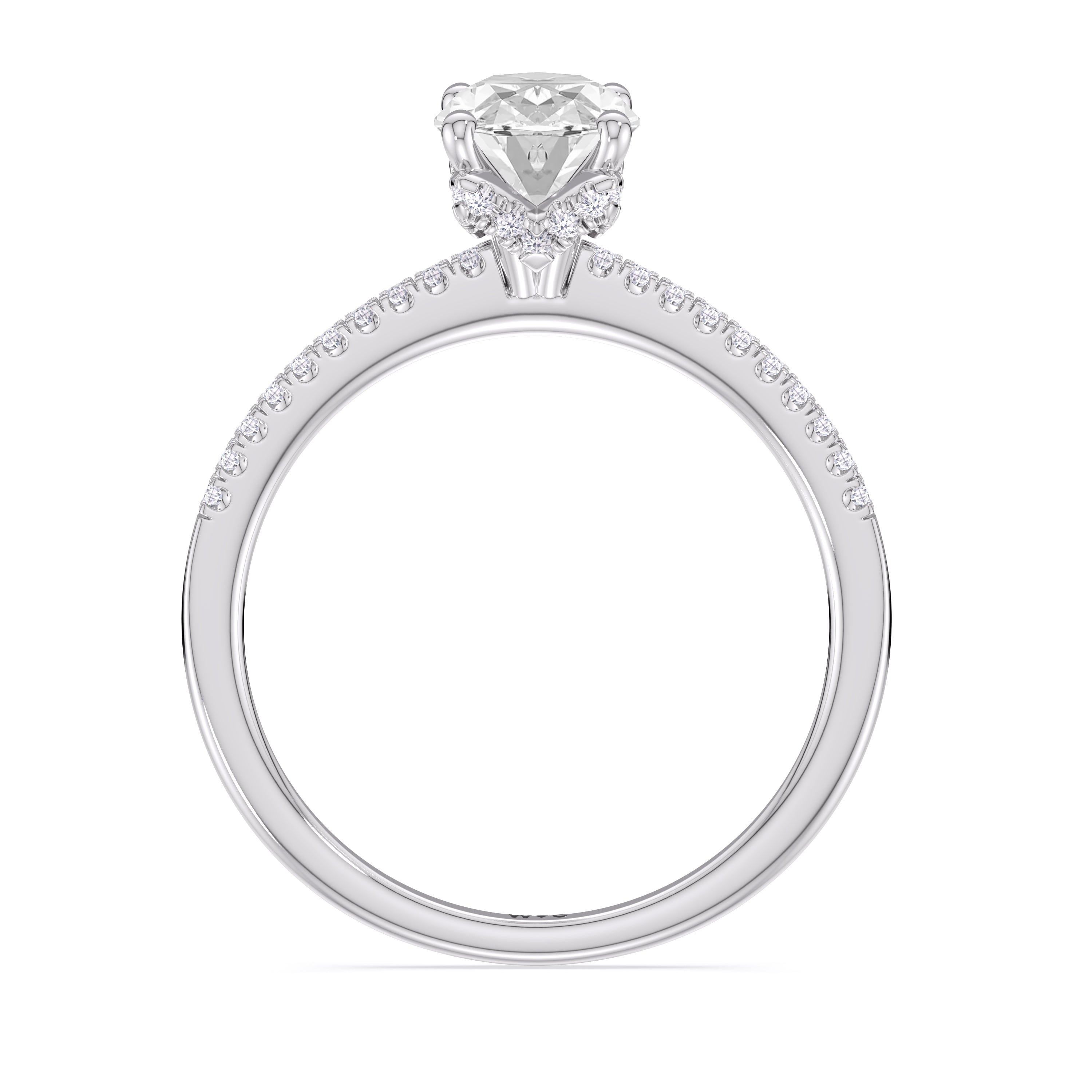 Meet Olivia, a diamond engagement ring that fused minimalist design with a timeless aesthetic. The look of this ring starts with a classic solitaire. The focal stone is cradled by a diamond-studded four-prong setting. The band is also encrusted with petite round diamonds on a micro pavé setting.
