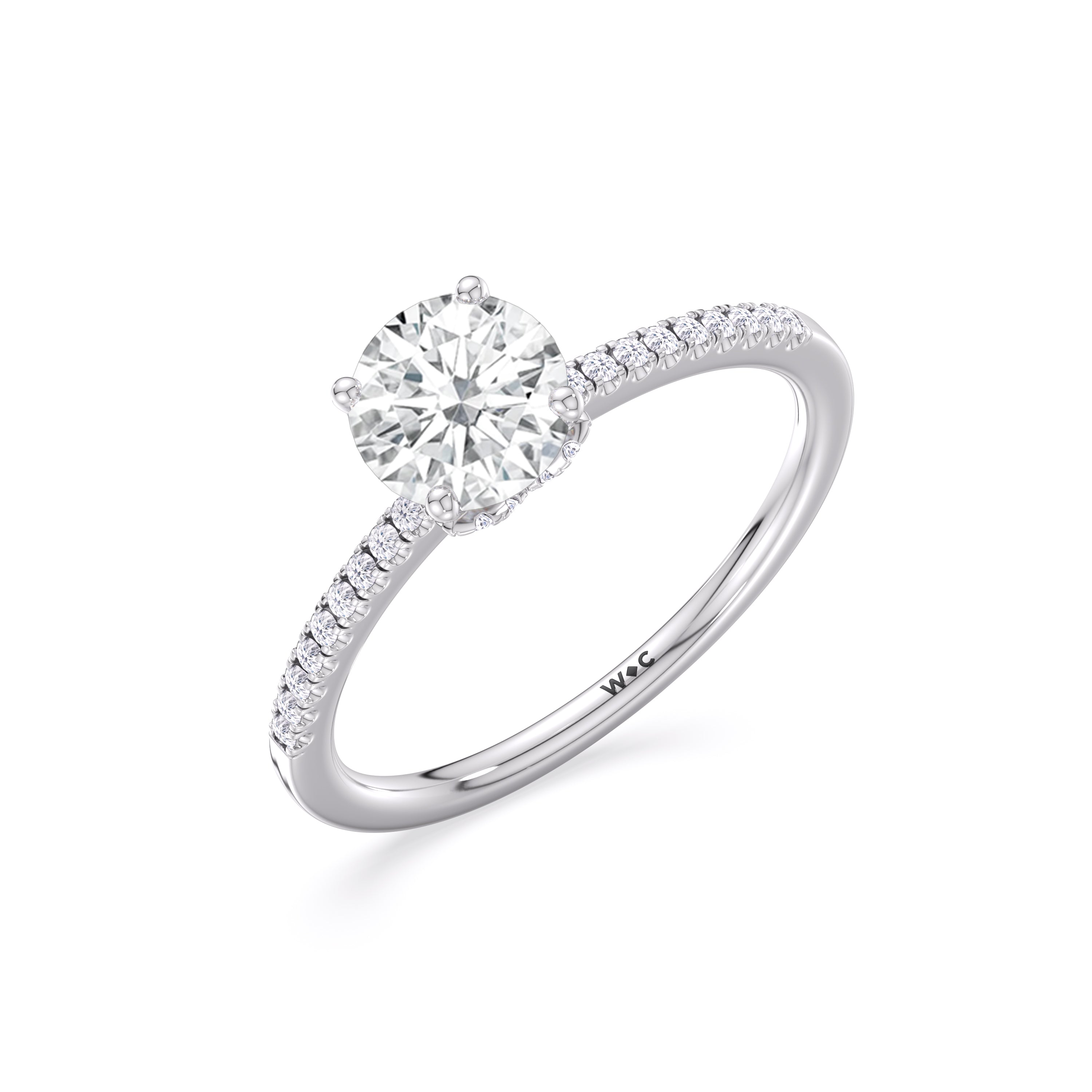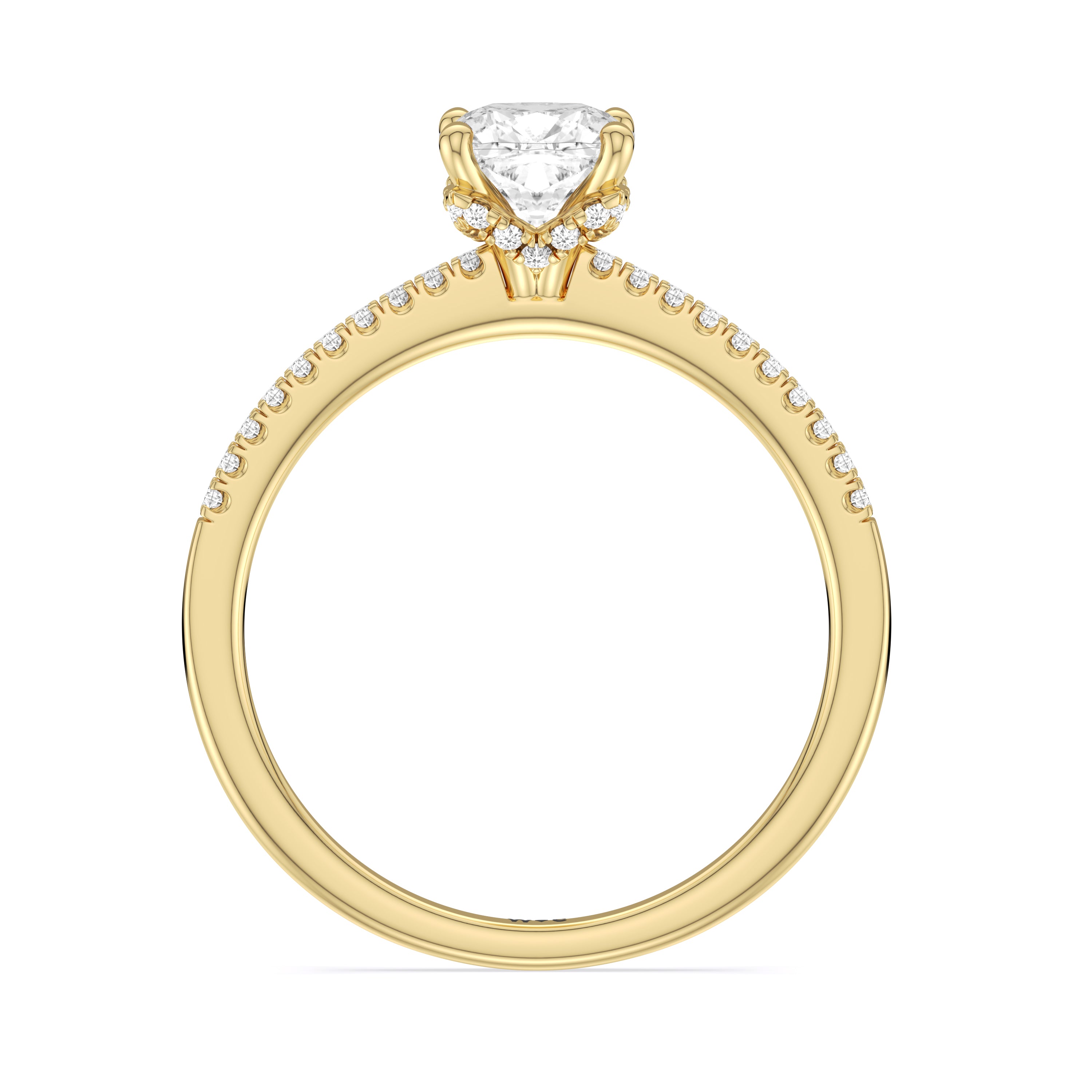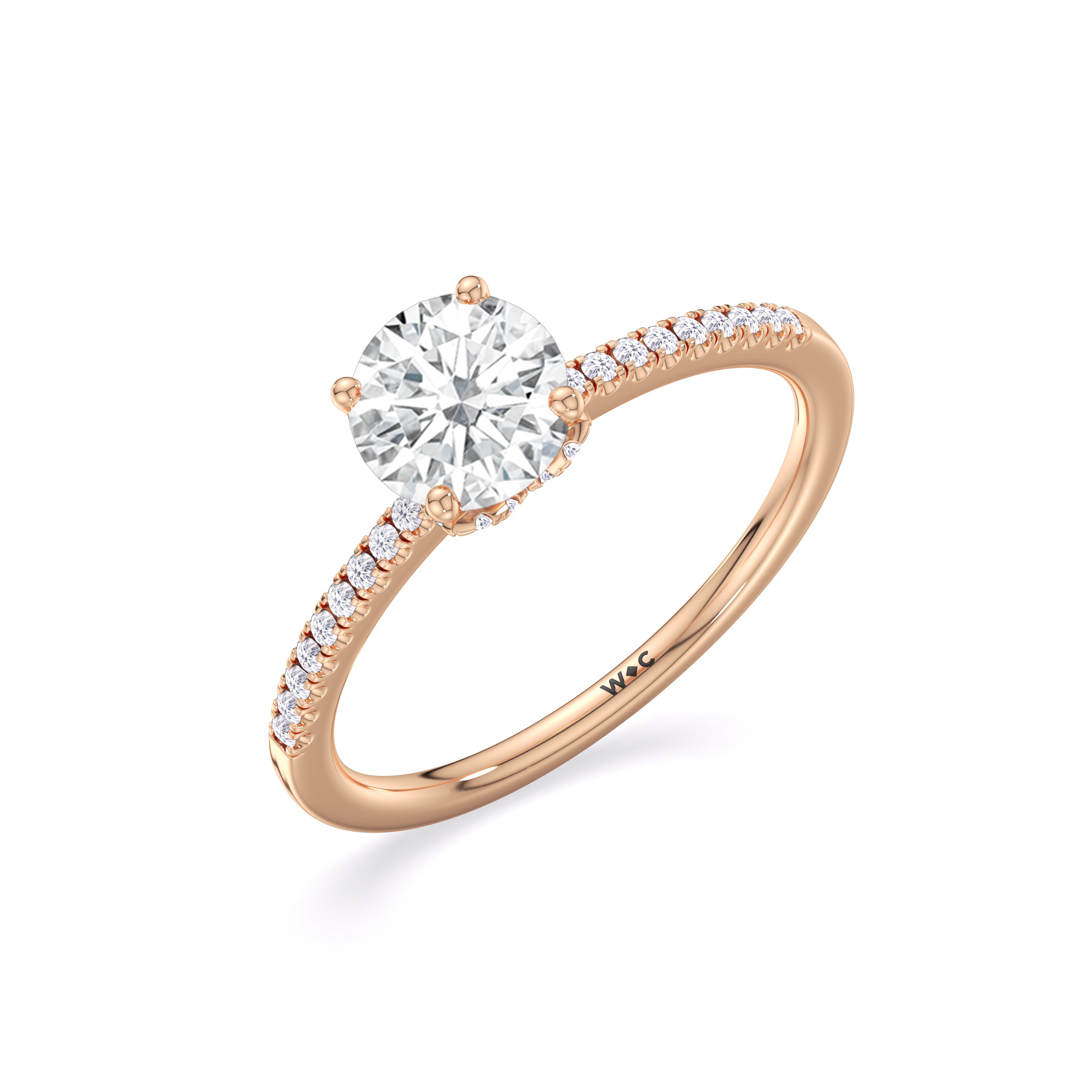 Meet Olivia, a diamond engagement ring that fused minimalist design with a timeless aesthetic. The look of this ring starts with a classic solitaire. The focal stone is cradled by a diamond-studded four-prong setting. The band is also encrusted with petite round diamonds on a micro pavé setting.