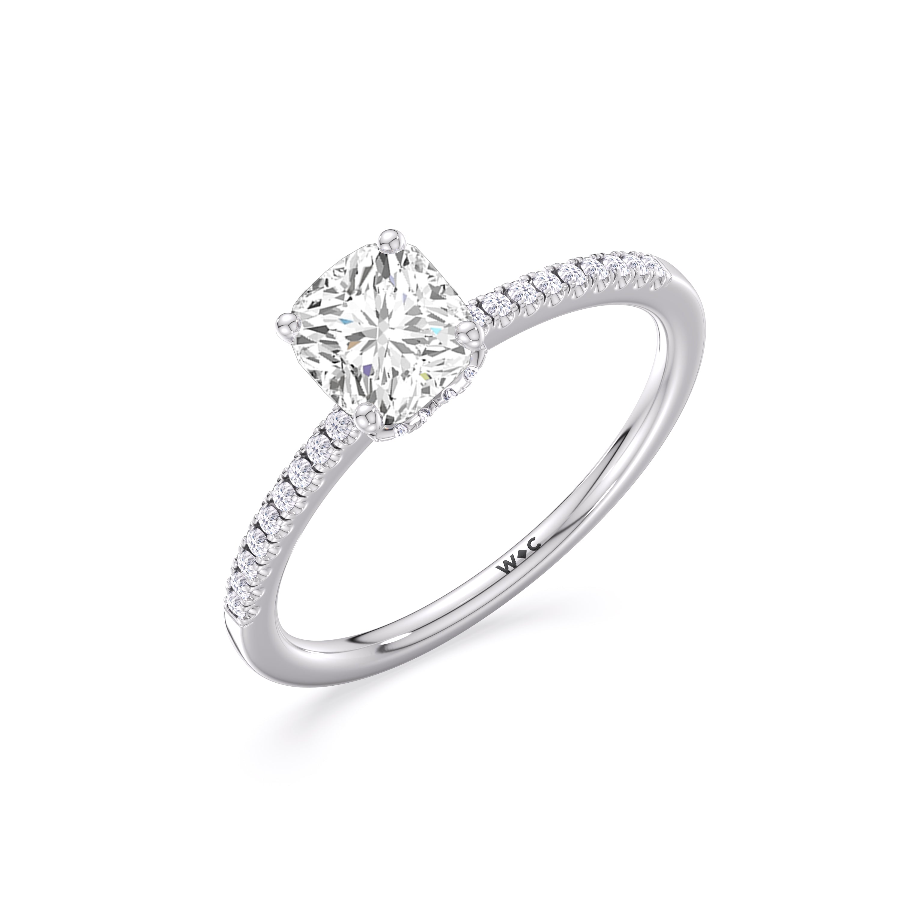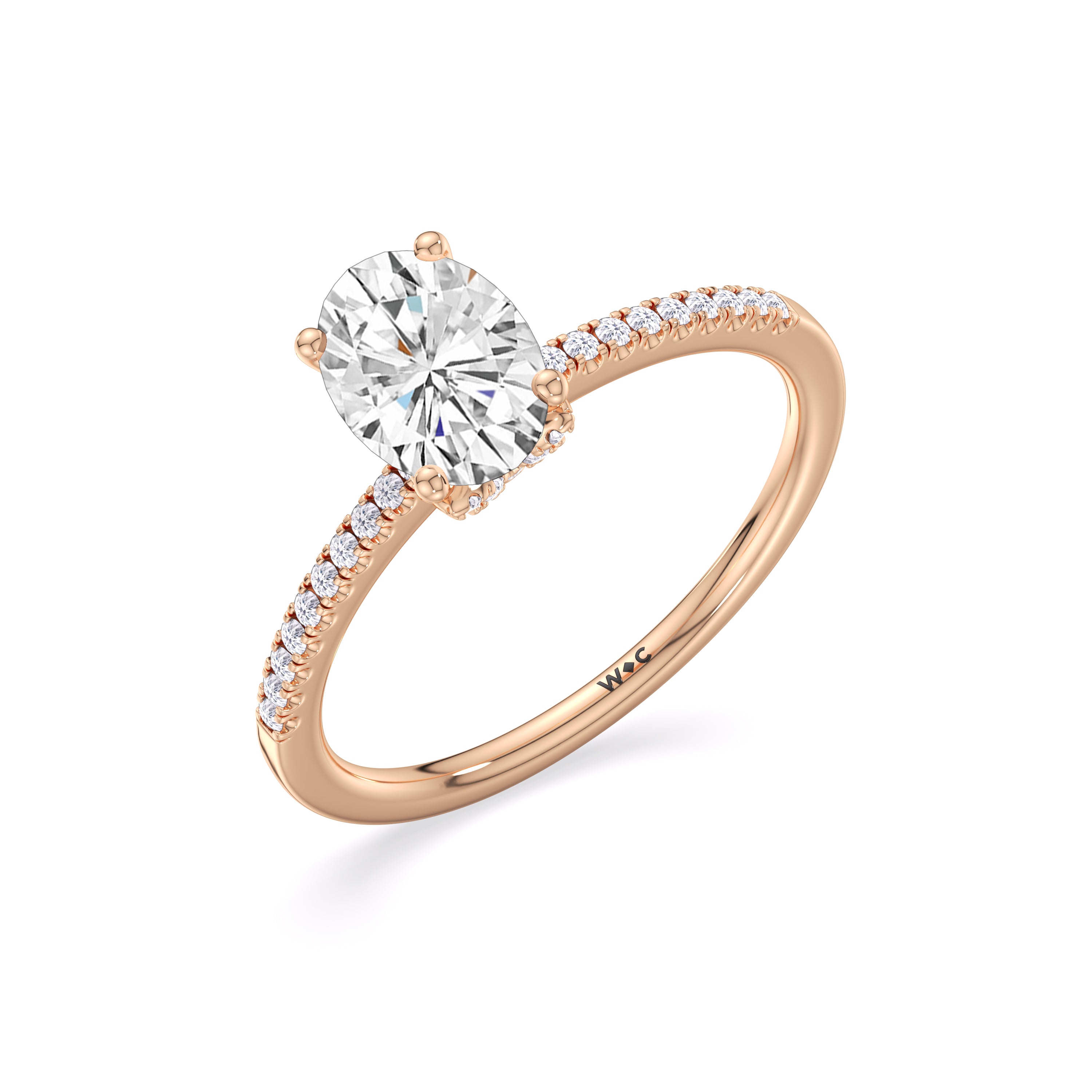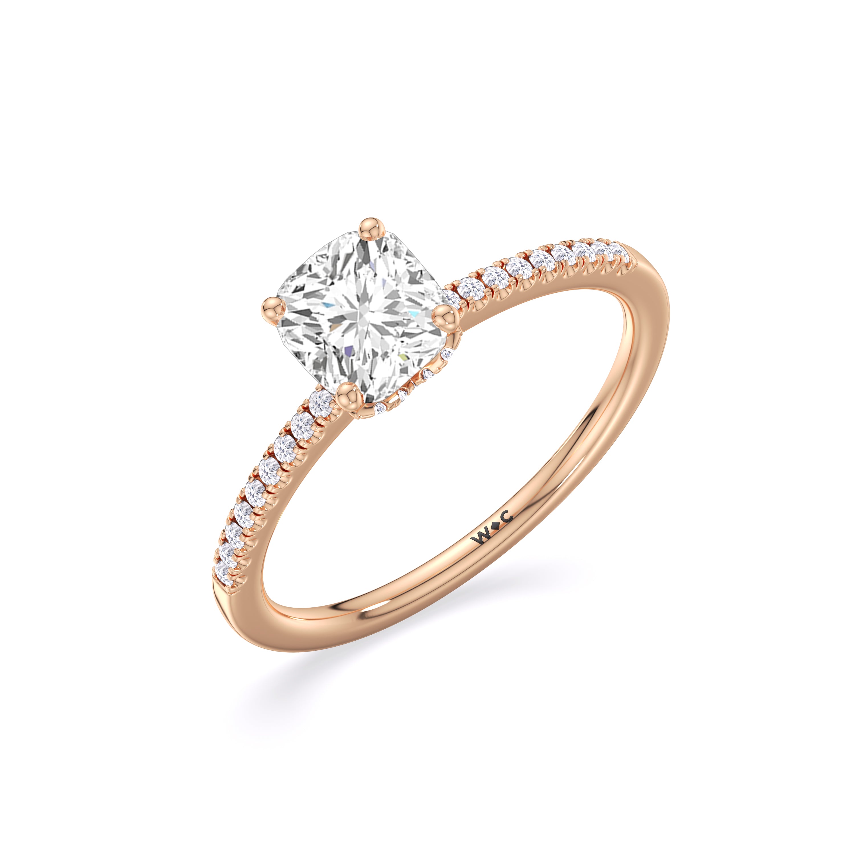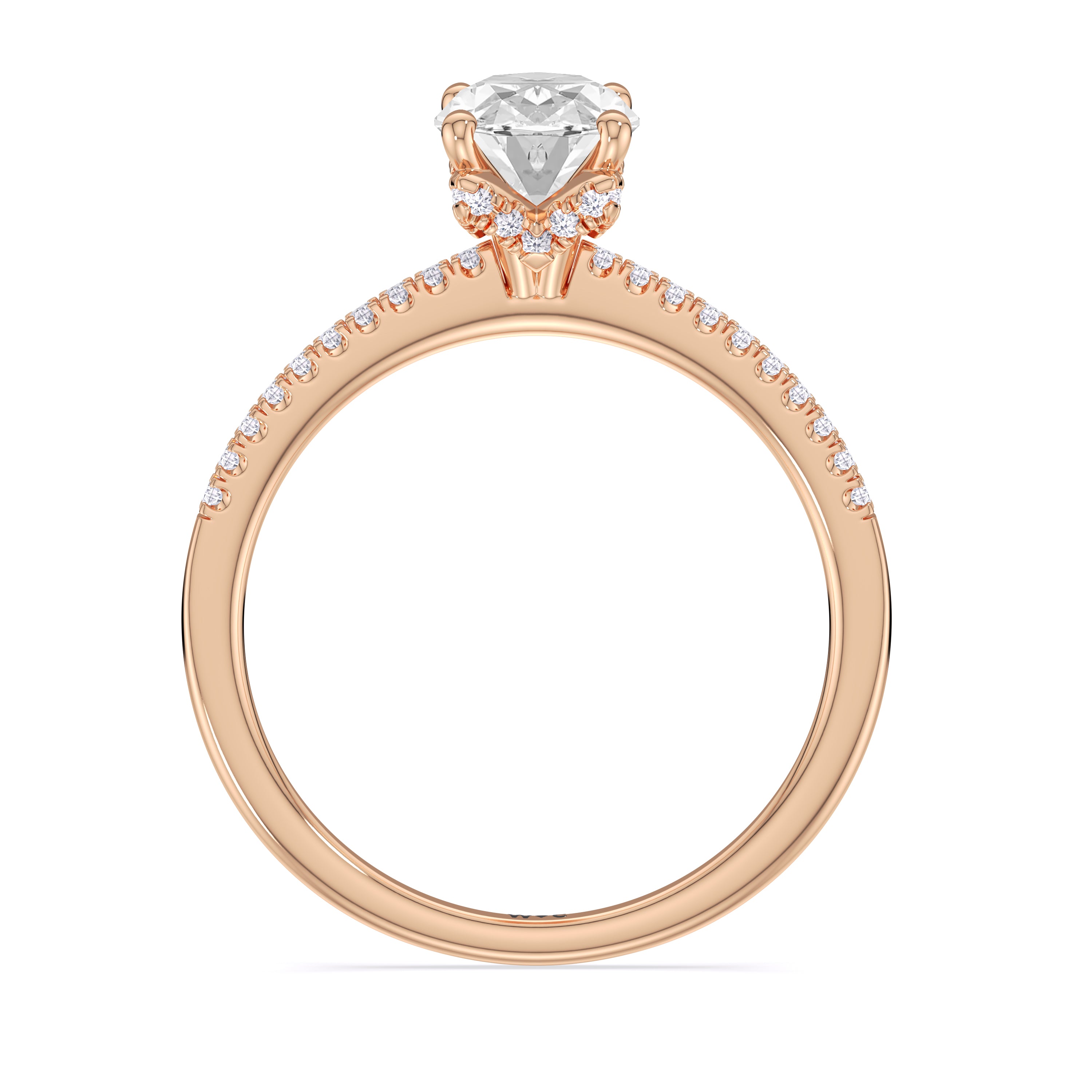Meet Olivia, a diamond engagement ring that fused minimalist design with a timeless aesthetic. The look of this ring starts with a classic solitaire. The focal stone is cradled by a diamond-studded four-prong setting. The band is also encrusted with petite round diamonds on a micro pavé setting.
