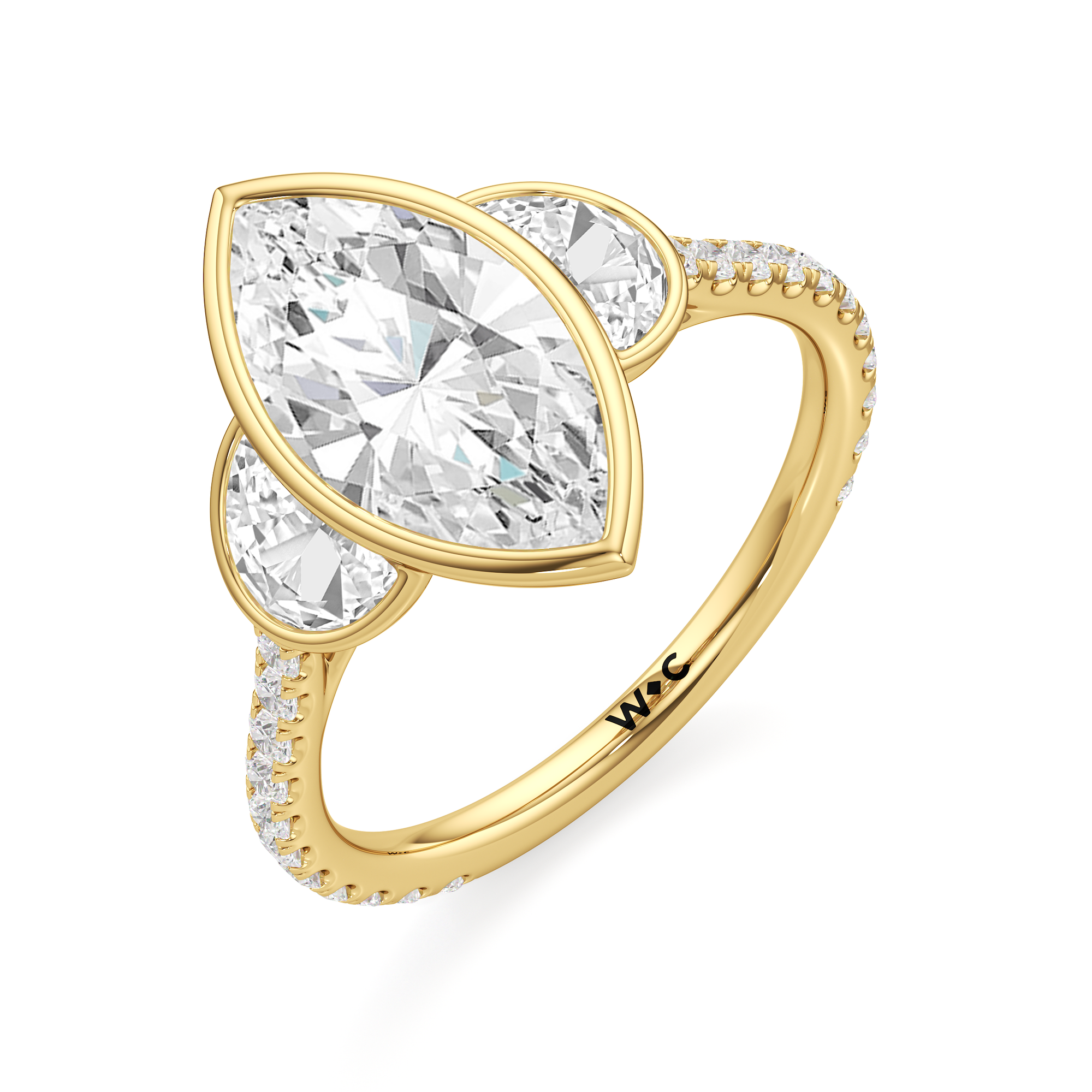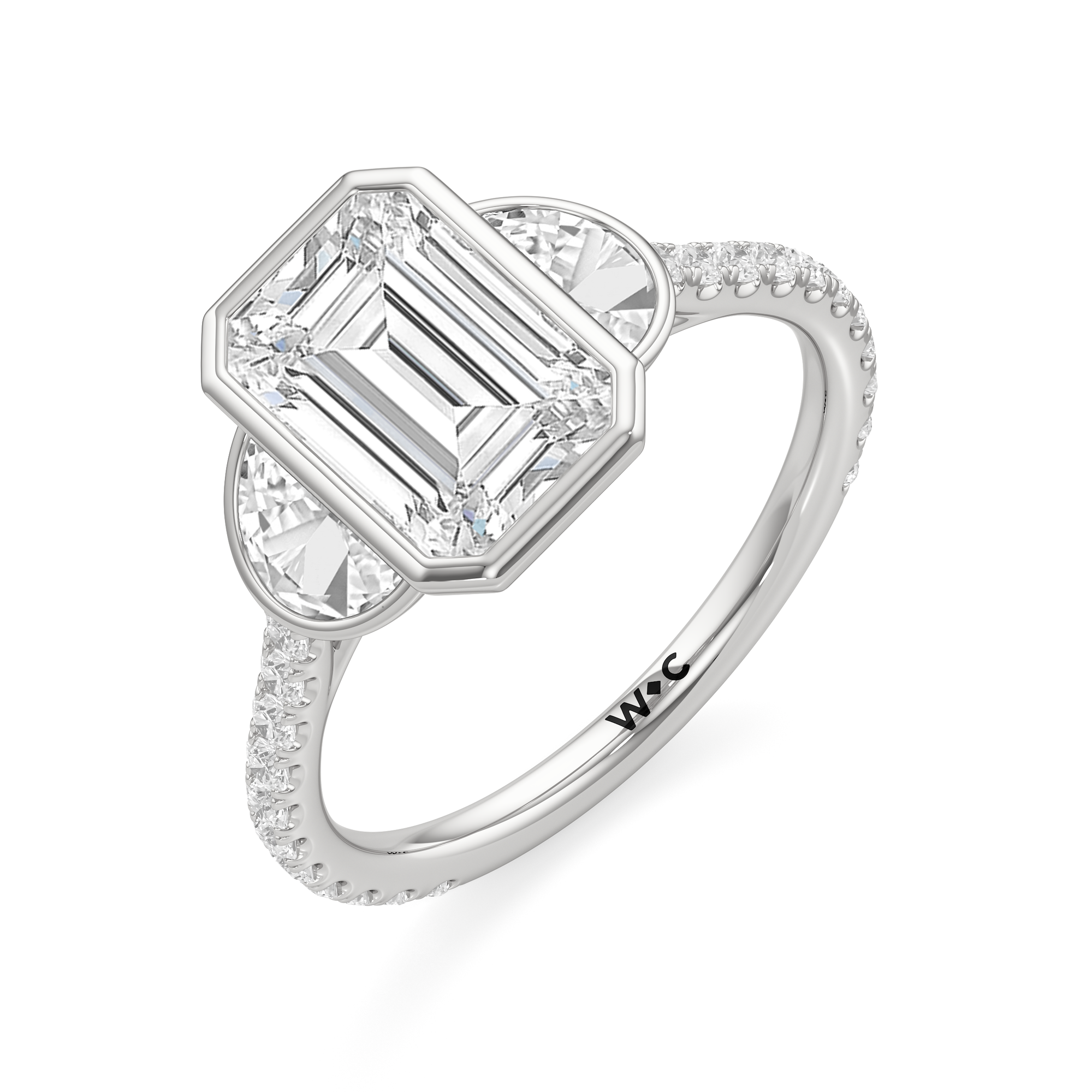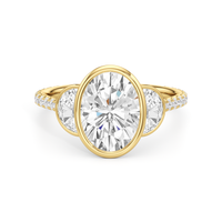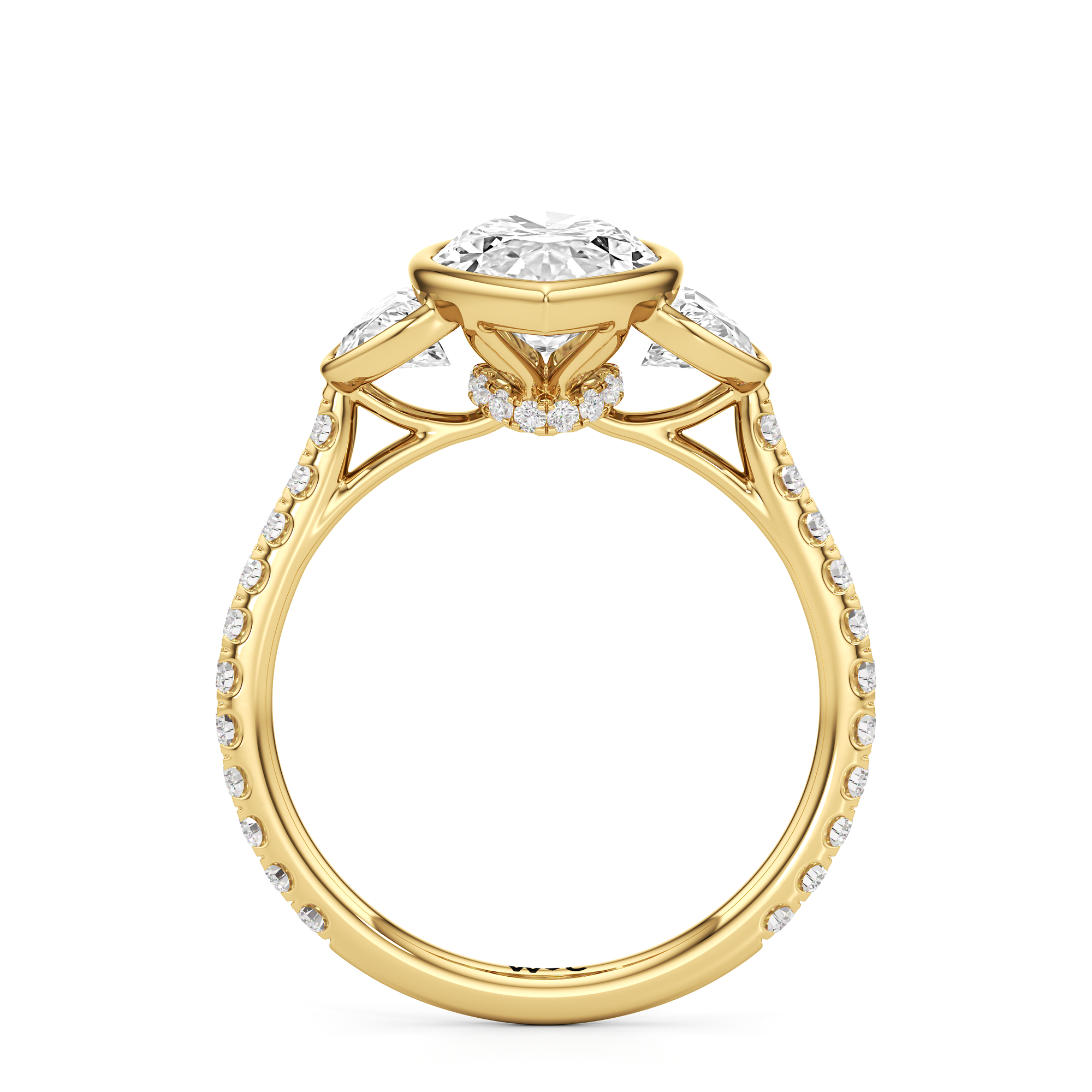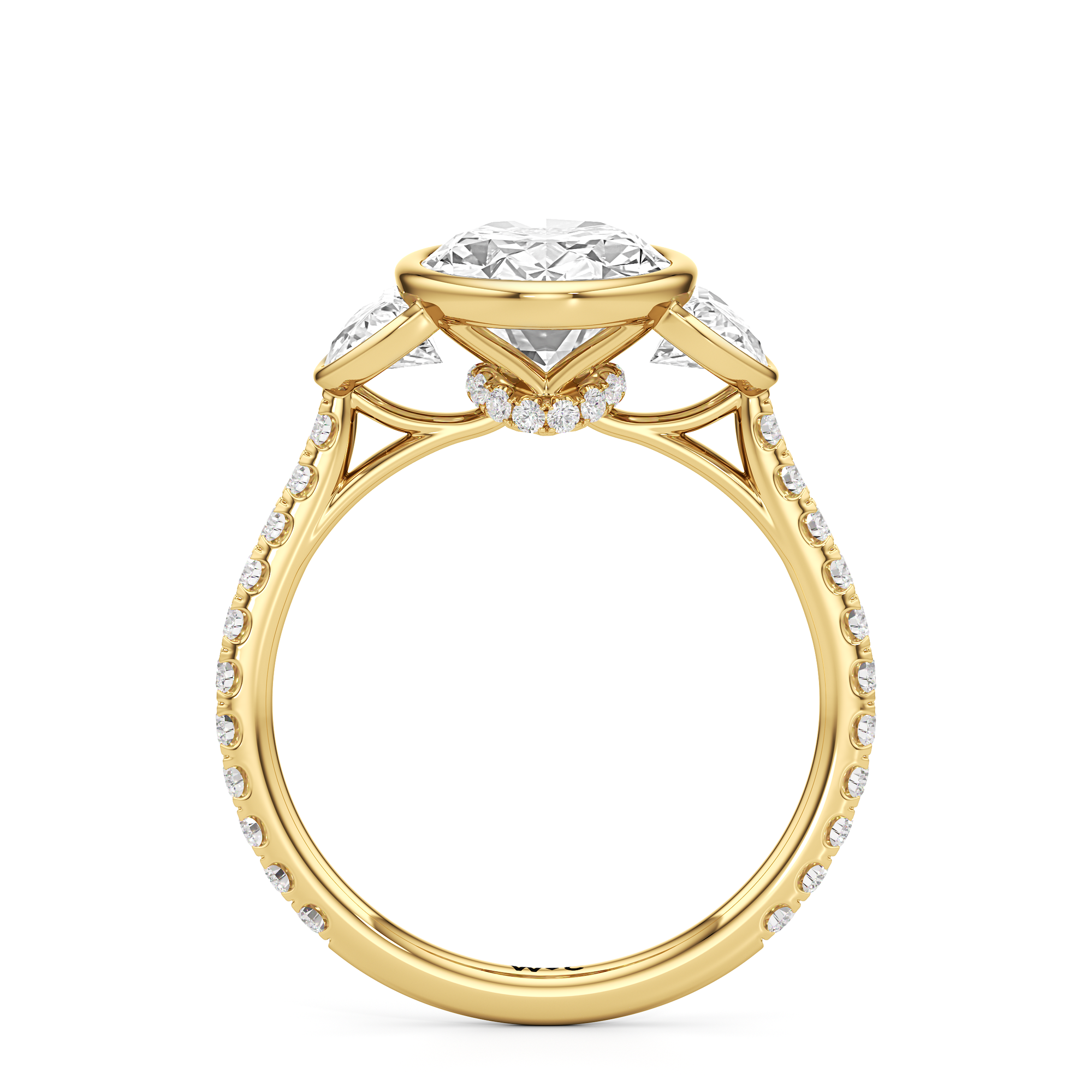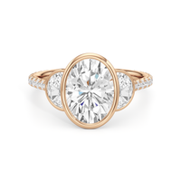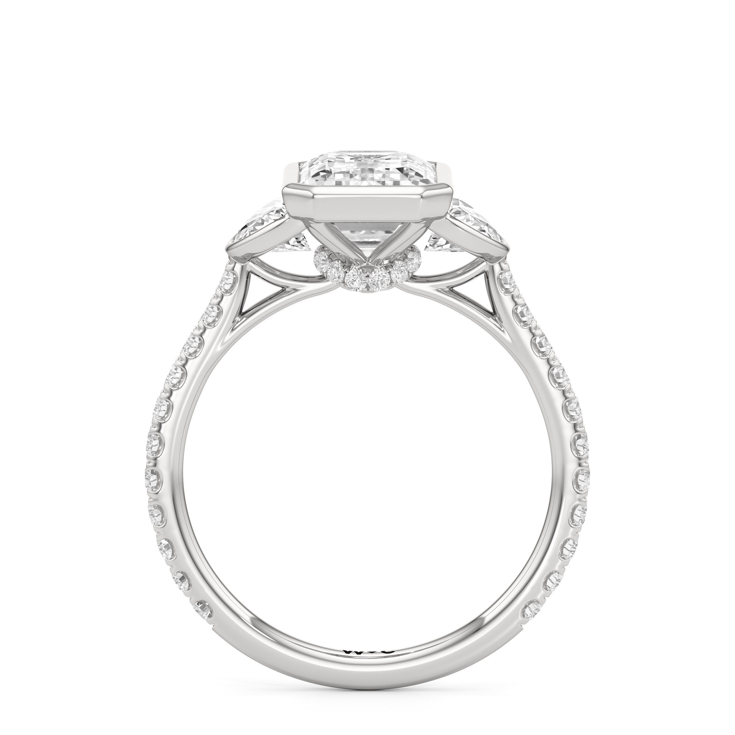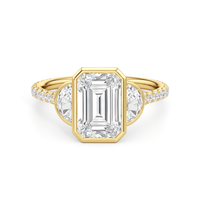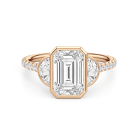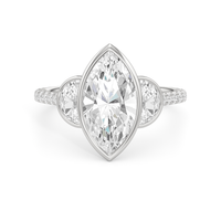 A ring with a distinct character. It bears two half-moon diamond side stones, each sitting on the center diamond's left and right sides. At the base of the central stone is a hidden diamond halo with decorative arms that extend to the side stones. The band's sloping shoulders are also lined with petite round diamonds for a continuous shine. Each of the three stones that form the centerpiece is mounted on a bezel setting, which provides optimum stability, making this trilogy ring perfect for someone who leads an active lifestyle.
