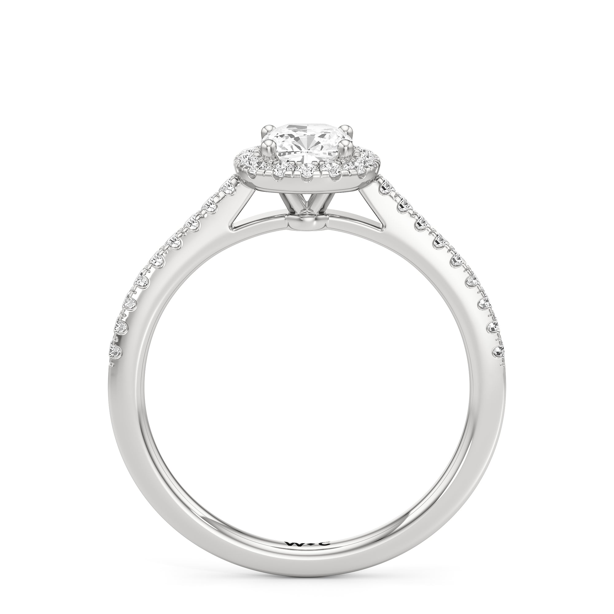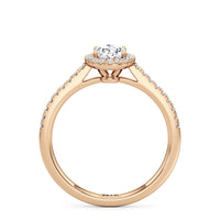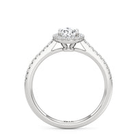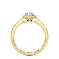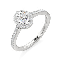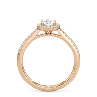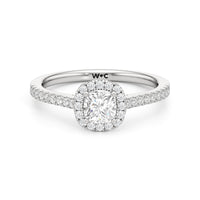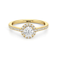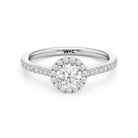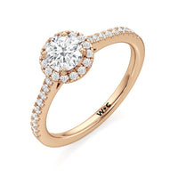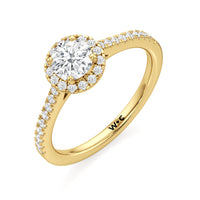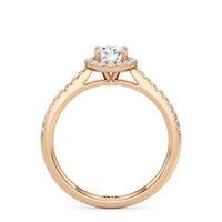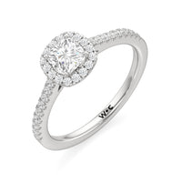 Symbolise a love that can't be broken with this halo solitaire engagement ring. This design features a cathedral shank with arching shoulders lined with petite round brilliant diamonds. The band supports a centre diamond set on four prongs. The centre gem is surrounded by a halo of more round brilliant diamonds, enhancing the main stone's brilliance and creating the illusion of a bigger centre stone.
