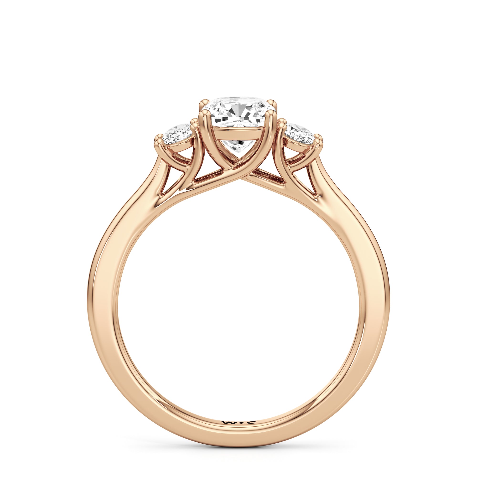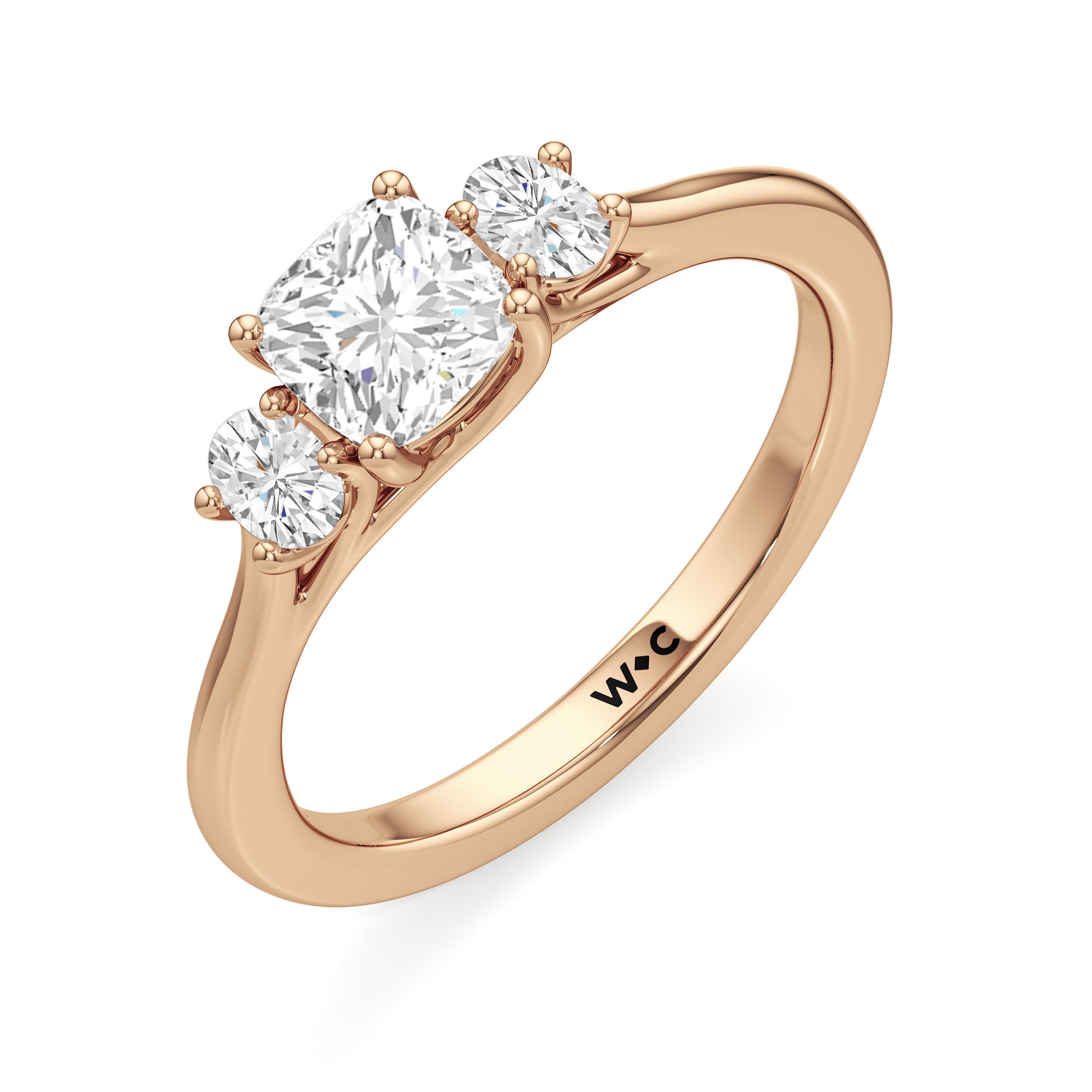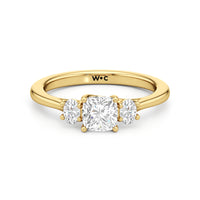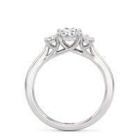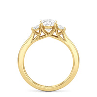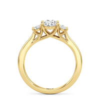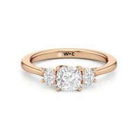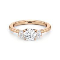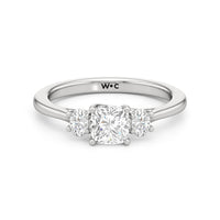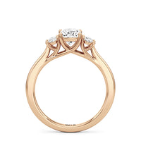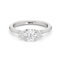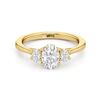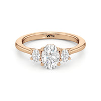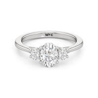 The Poppy Engagement Ring's design has elegance juxtaposed with practicality. The polished band holds a trio of oval diamonds that offer excellent brilliance. The diamond centre stone is flanked by two oval diamond side stones. The three precious gems are held in place by a trellis setting, where the crossing prongs provide added strength and security.