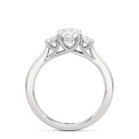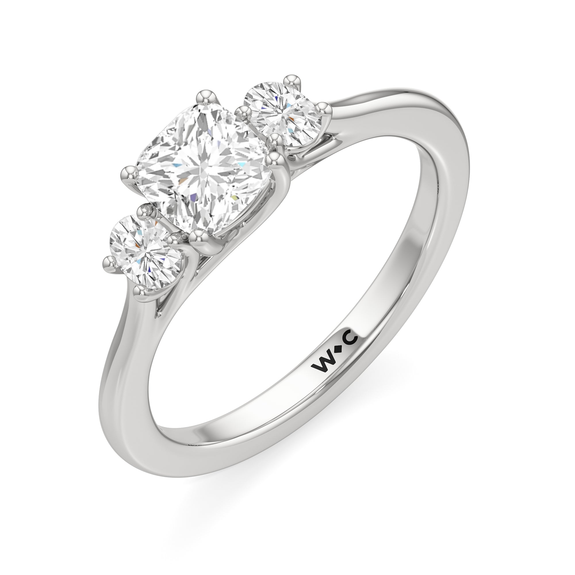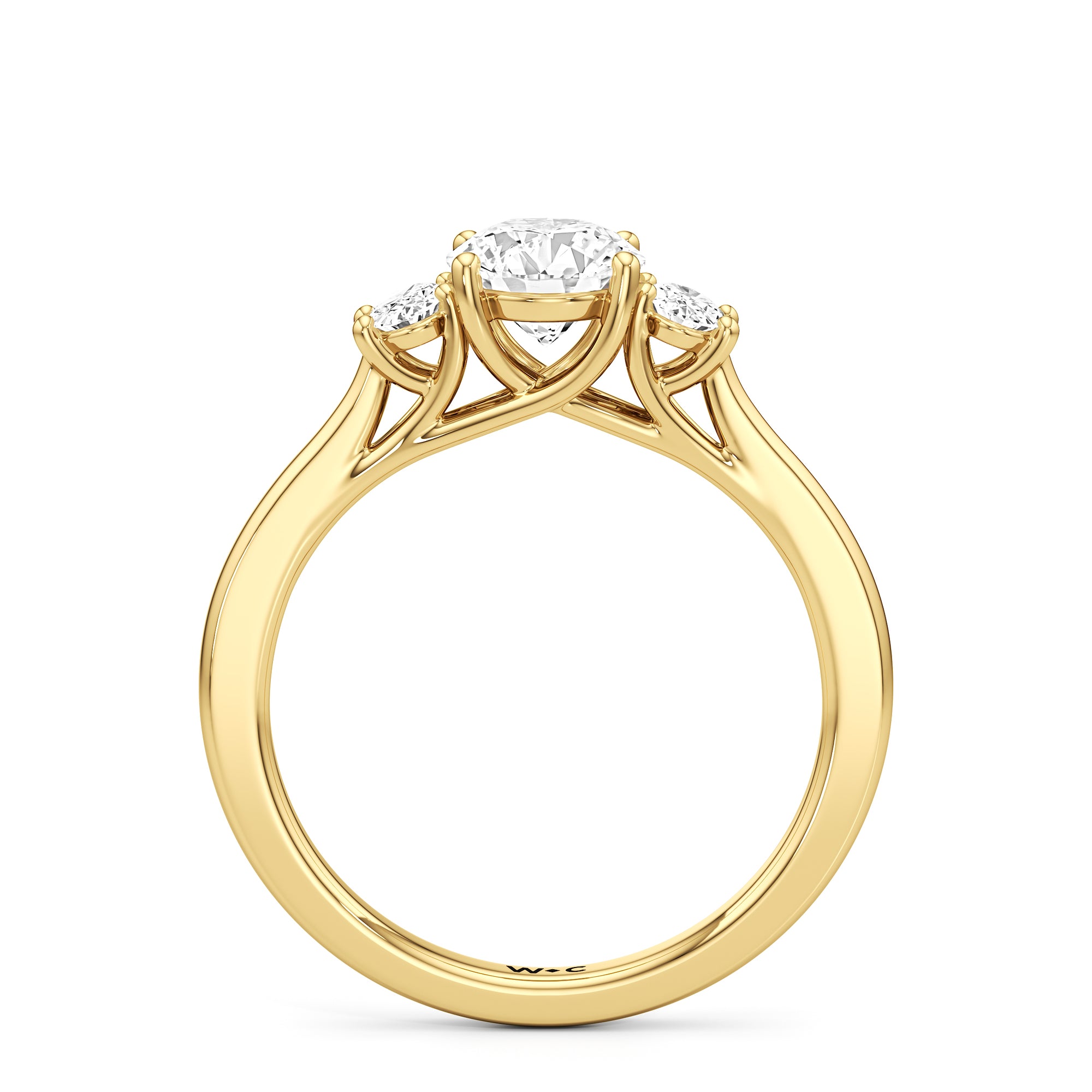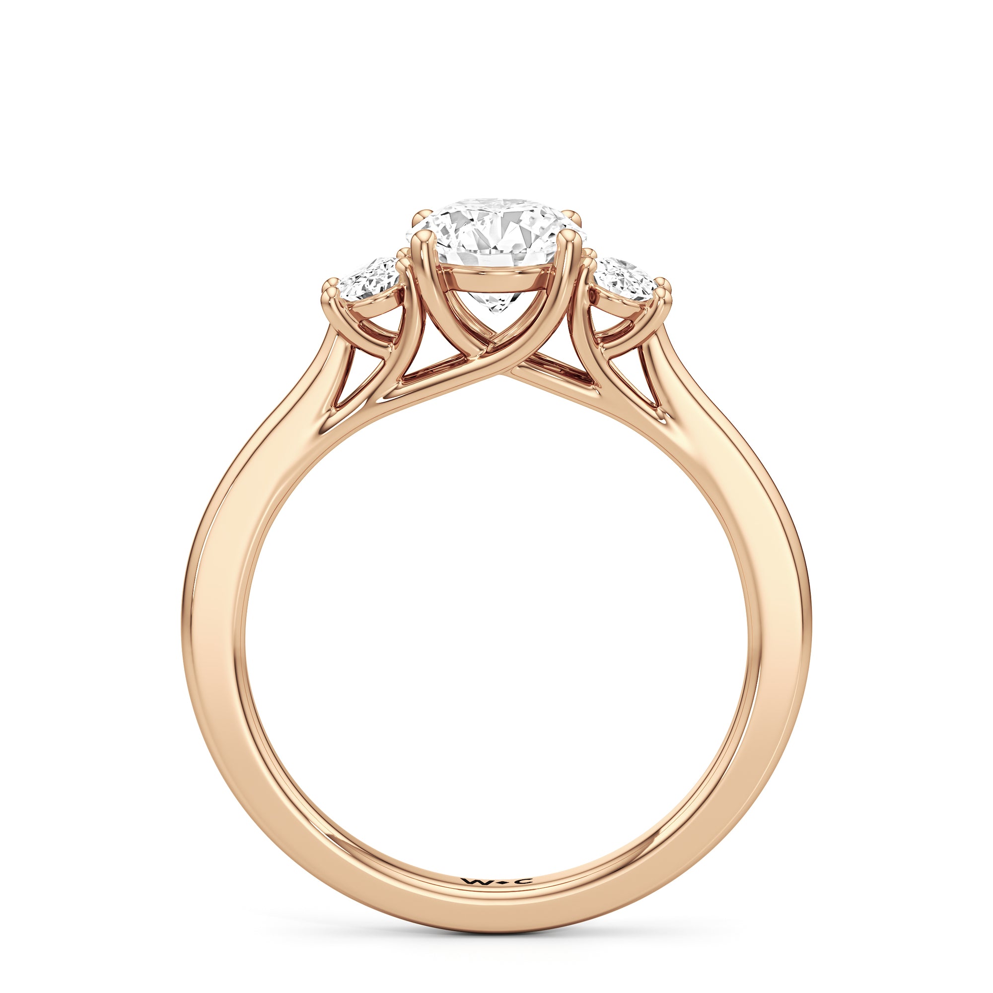 The Poppy Engagement Ring's design has elegance juxtaposed with practicality. The polished band holds a trio of oval diamonds that offer excellent brilliance. The diamond centre stone is flanked by two oval diamond side stones. The three precious gems are held in place by a trellis setting, where the crossing prongs provide added strength and security.
