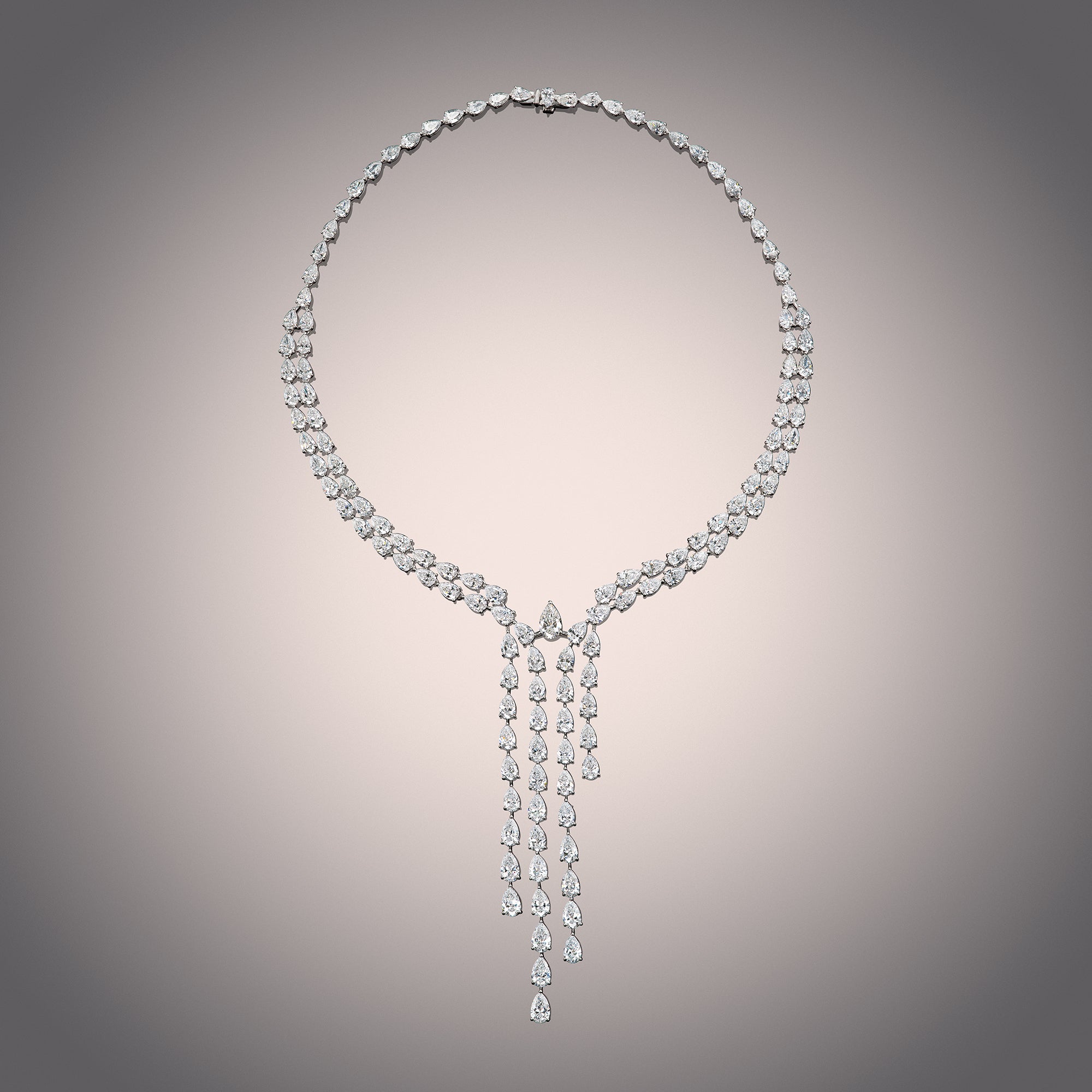 Those wanting to veer off well-beaten paths will instantly be drawn to the unconventional charm of this diamond chandelier necklace. This incredible piece features two strands of pear-cut diamonds that culminate in a chandelier-like pendant. Four more strands, varying in lengths, of pear diamonds cascade from the center of the necklace and down the décolletage. Anything but ordinary, this necklace makes a statement with its perfect blend of brilliance and peculiarity.