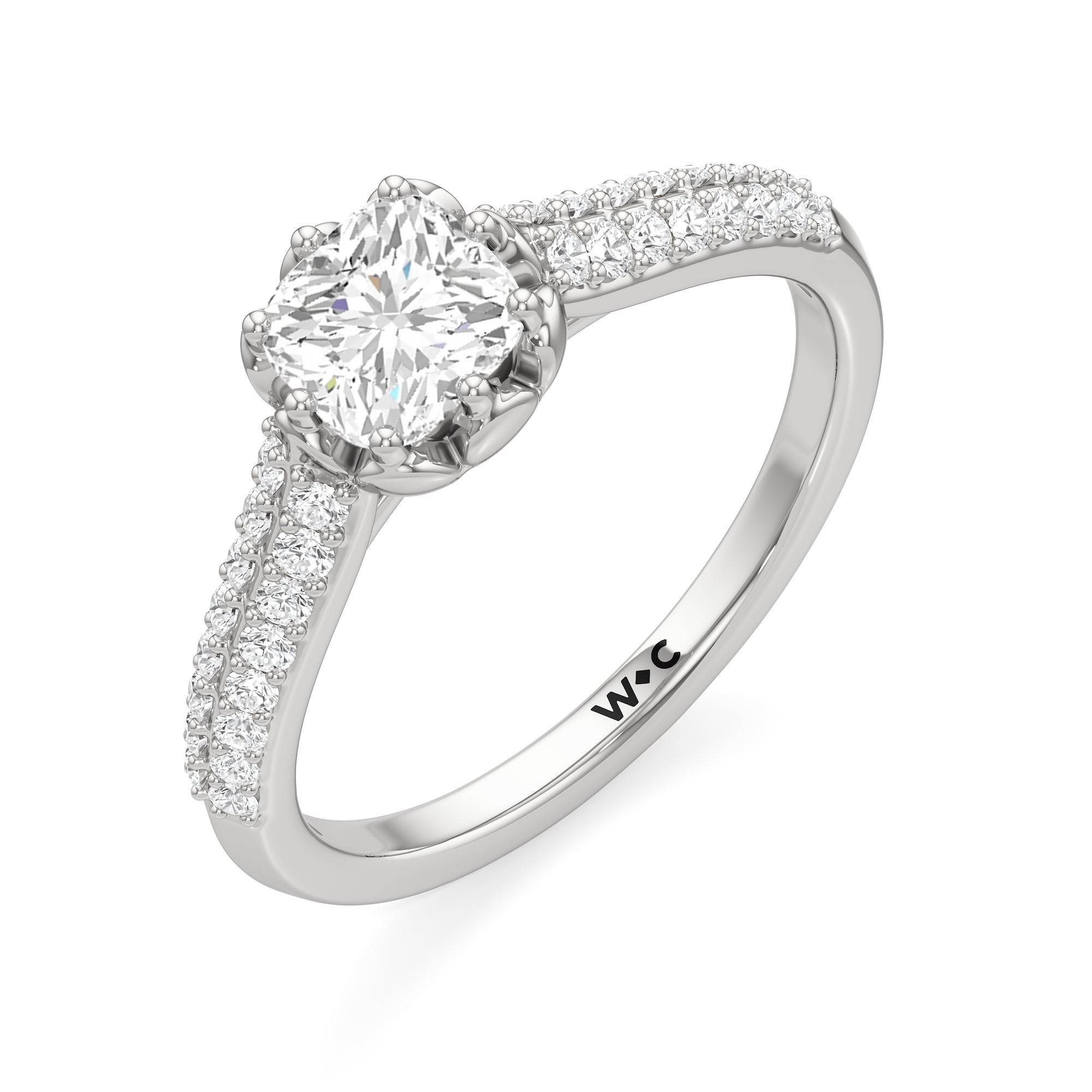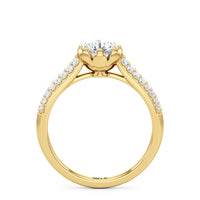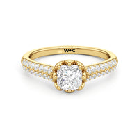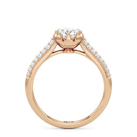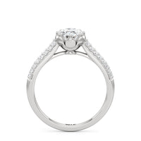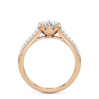 A diamond ring with a botanical motif. It showcases a diamond centre stone nestled on a flower-inspired head, with petal-like metalwork that cradles the focal gem in place. Supporting this main setting are the cathedral shank's arching shoulders, gracefully lined with two rows of prong-set diamonds.