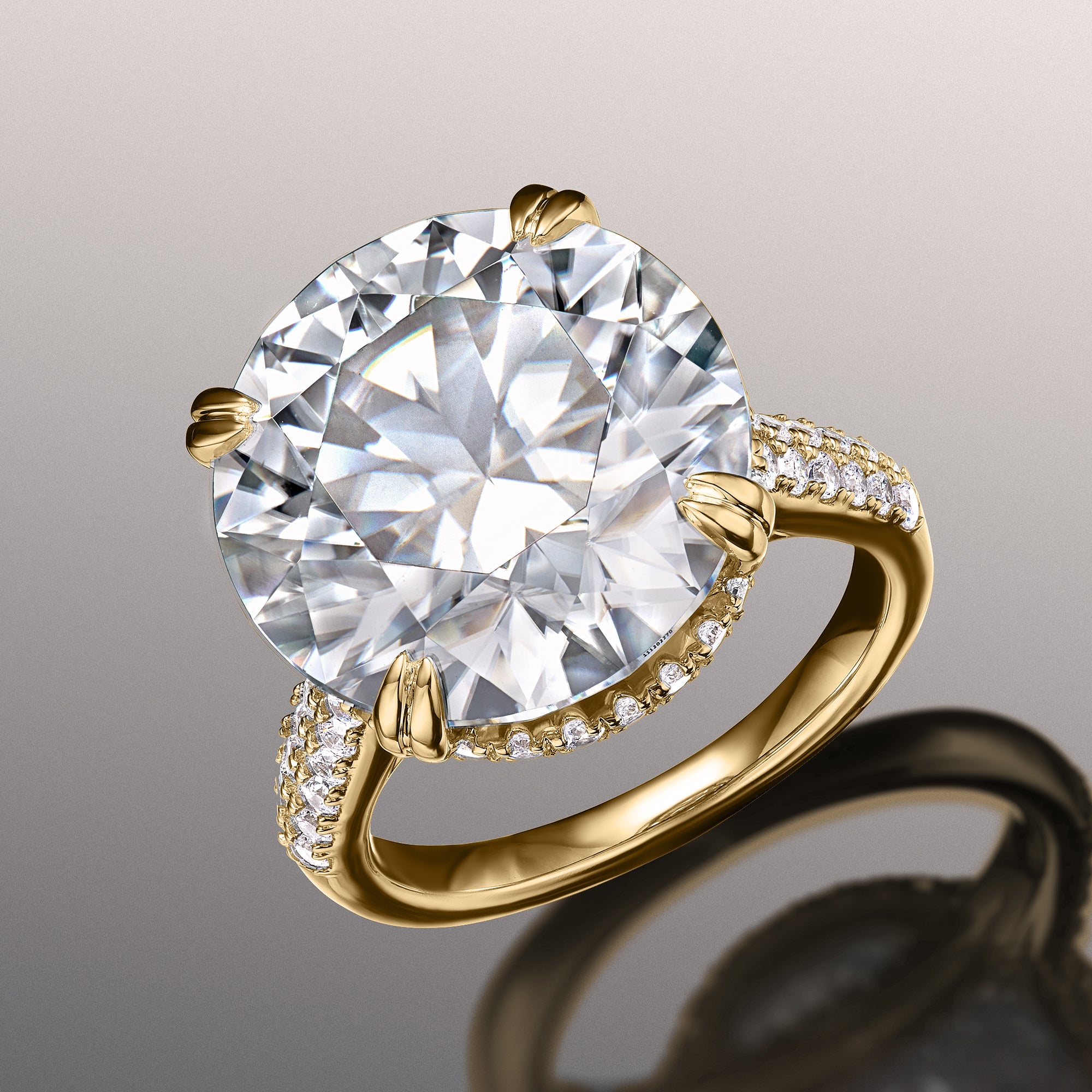 Presenting a dramatic play of light and shade, the ring boasts a massive round diamond center stone cradled by double-claw prongs. The cathedral shank has its graceful shoulders adorned with two rows of round diamonds. A hidden halo and a diamond-encrusted bridge cast a mesmerizing sparkle to the ring when viewed from the side.