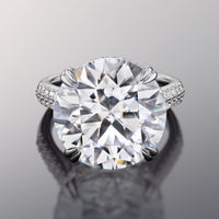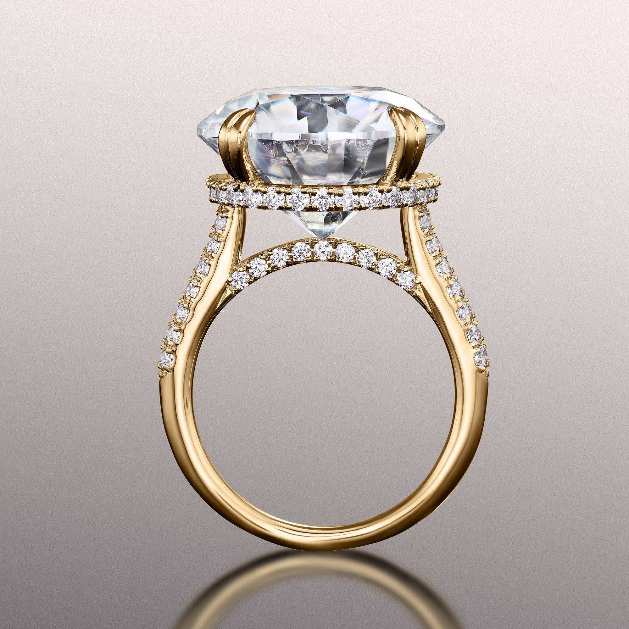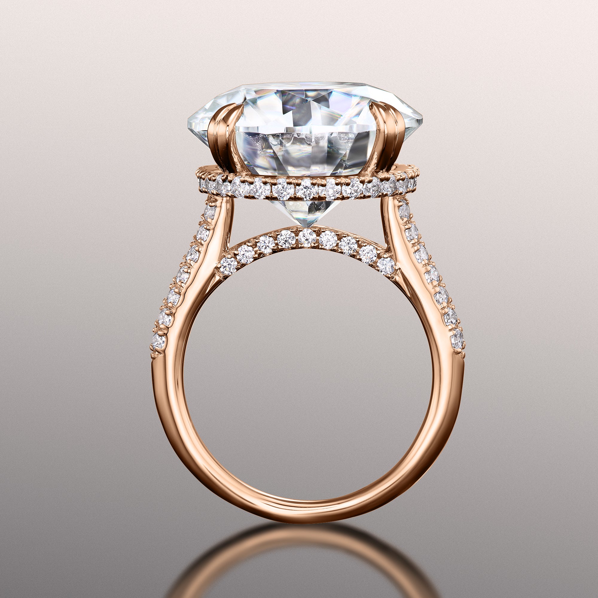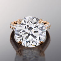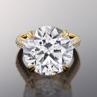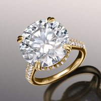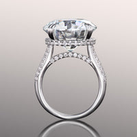 Presenting a dramatic play of light and shade, the ring boasts a massive round diamond center stone cradled by double-claw prongs. The cathedral shank has its graceful shoulders adorned with two rows of round diamonds. A hidden halo and a diamond-encrusted bridge cast a mesmerizing sparkle to the ring when viewed from the side.
