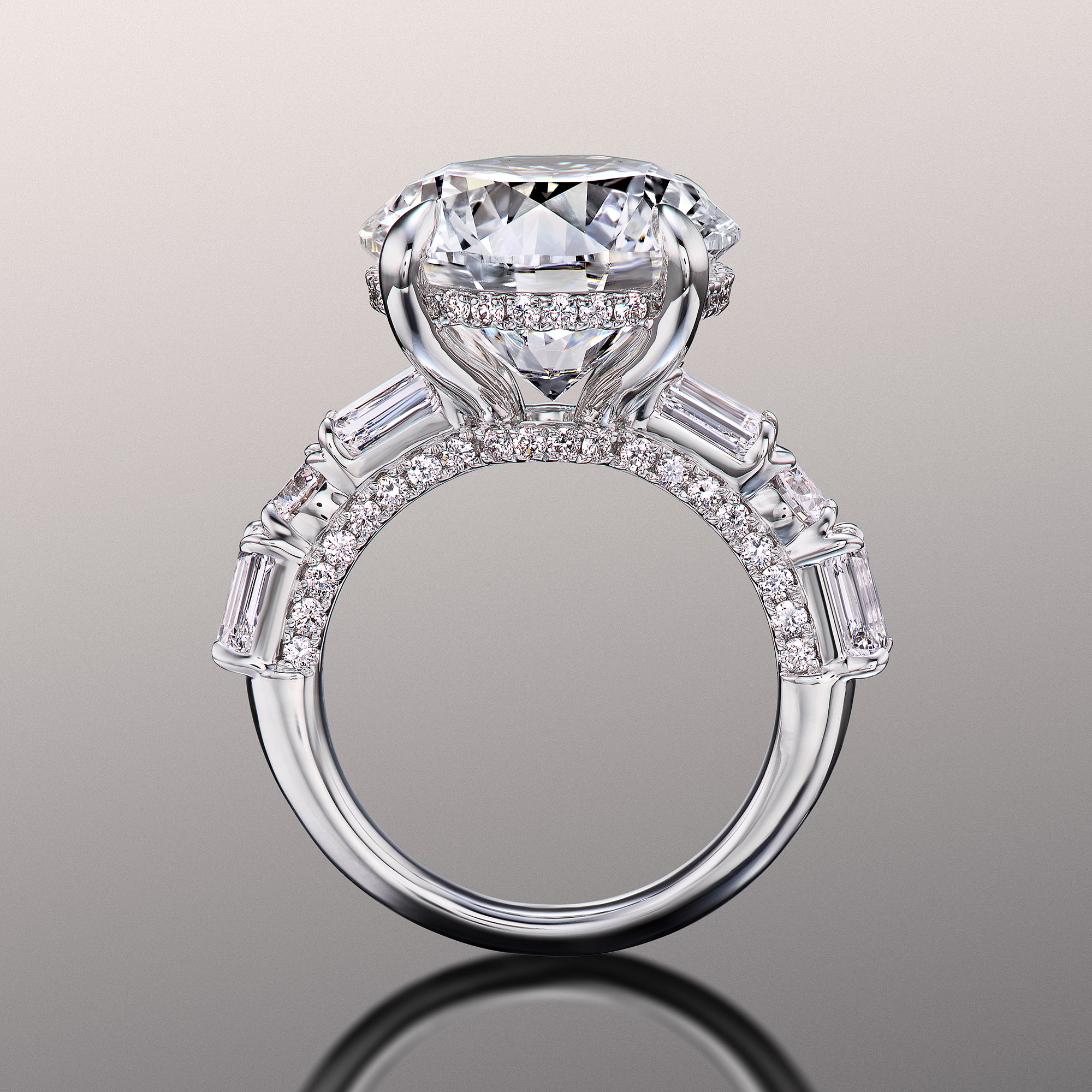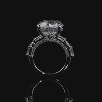 A mystical, visually intriguing ring for design rich in detail. Featuring a brilliant round diamond center stone that draws your gaze and leaves you in awe. The mesmerizing center stone is nestled on four prongs, with a sophisticated hidden halo. The band's shoulders hold a trio of diamonds - two emerald-cut diamonds on each side, with a round diamond in between. Petite round diamonds line in a semi-circle on the ring's gallery for an even brighter shine.