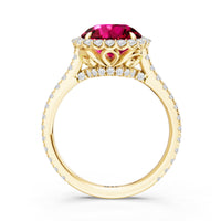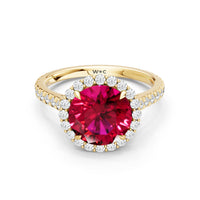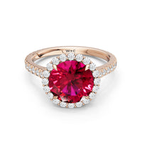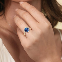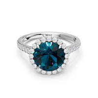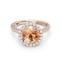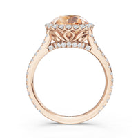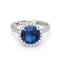 Soft as moonlight on still water, the round blue sapphire shimmers at the center of this ring. A halo of diamonds surrounds its soft blush, while a filigree gallery beneath lifts the design, guiding the eye to its graceful allure. Diamonds along the bridge and shank trace the ring's curves, harmonizing with its serene presence.